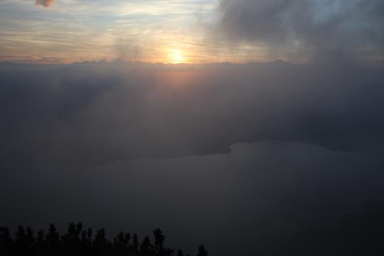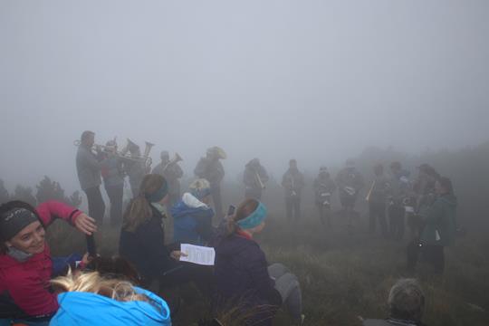 Nach dem Konsum am Abend ist ein Toilettengang in der Nacht unvermeidbar. Obwohl sehr viele Personen hier im Lager schlafen ist es unglaublich Ruhig. Das ändert sich schlagartig am Morgen, es scheint eine Hysterie ist ausgebrochen, unnötigerweise wird Reflexartig ständig das Licht eingeschalten, obwohl die Helligkeit ausreichend ist. Ganz zu schweigen von den vermeidbaren Unterhaltungen in einem Schlafraum. Der Wetterbericht schaut schon viel besser aus, es könnte trocken bleiben die Regenwahrscheinlichkeit liegt bei 24%. Die Realität zeigt sich im Freien Neblig trüb bei doch 15°C, die Sichtweite liegt unter 100 Meter. Verwunderlich das um 9 Uhr, noch so viele Gäste in der Mollig Warmen Gaststube verweilen. Am Tisch vom Vorabend gesellen wir uns zu 3 Älteren Damen. Trinke nebenbei bei den Notizen einen Kaba. Die Chefin teilt uns mit das um 10 Uhr, eine Berg Messe unter dem Traunstein Gipfel stattfindet. Jetzt wird verständlich warum gestern das Haus proppenvoll war. 2 Bild Bänder über die Sanierung der Hütte liegen aus, schon Interessant Abseits der Straßen welch Aufwand und Problematik dahinter steckt. Spontan fällt die Entscheidung der Berg Messe beizuwohnen. Nur noch wenige Gäste halten sich auf, als wir kurz nach 10 Uhr, das Lager räumen, der Rucksack wird wieder unter der Treppe abgestellt. Die Regenjacke schützt vor der Feuchtigkeit, der Untergrund Erdig schmierig. Latschenbewachsen der Aufstieg. Wie aus dem nichts werden Stimmen wahrgenommen. Imposant das Massive Gipfelkreuz. Welch Überraschung sehr viele Bürger wohl aus der näheren Umgebung, sind trotz der Ungünstigen Bedingungen in aller Herrgottsfrüh aufgestiegen, um an dieser Messe teilzunehmen. Etwas Unterhalb des Gipfel Kreuzes auf einer kleinen ebenen Fläche ist ein Altar aufgebaut. Die Menschen verteilen sich am Hang. Gerade jetzt begrüßt der Bürgermeistern von Gmunden die Zahlreichen Gäste, mit einer Herzlichen Warmen Rede. 14 Musiker die mit Blas Musik durch das Programm begleiten untermalen diese Kulturelle Andächtige wie Bedeutsame Veranstaltung.. Kleinere Böen stören ein wenig, während der Pfarrer diese Messe zelebriert. 4 Vertreter aus verschiedenen Verbänden/Vereinen treten als Redner auf, auch ein Medien Vertreter weilt unter dem Publikum. Zum Abschluss wurde an einen jeden eine Hostie überreicht. Noch bevor sich der Pulk in Bewegung setzte, eilten wir Flotten Schritts zurück.