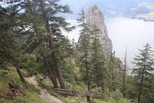 In einem waren wir uns absolut einig, ein Tolles Ereignis das man nicht alle Tage erleben darf! Gepäck aufnehmen, die ersten Gäste schwärmen ein. Übergang zum Naturfreundehaus, um die Runde abzurunden ist der Naturfreundesteig das Ziel. Was bringt uns der Tag, es ist 12 Uhr, am Abzweig zur Mairalm Unterhalten sich einige Wanderer. Die Gedanken kreisen sich wegen der Tagestour, der Postalm Klettersteig wohl eine Nummer zu groß, Zeitlich aber Denkbar. Vermutlich wird der Abstieg Programm genug sein. Jedenfalls bin ich für das kommende Vorbereitet, wissend das das Looser Haus mehr als Ausflugs Lokal den als Schutz Hütte frequentiert wird. Die Katzen spielen im Inneren der Hütte auf einer Bank. Spannend der Abstieg durch die kühne Flanke ist Raffiniert angelegt, wäre da nicht die eigenen Schritte die diese Ruhe stören. Dadurch das die Sicht fehlt, ist der Tiefen Blick verwehrt. Wow die Sicht öffnet sich nach 20 Minuten, insbesondere auf den bis zu 100 Meter tiefen Grünen Traunsee, die Wolken hängen in einem Bereich von über 1400 Meter. Die eh gute Stimmung steigert sich, Motivation Pur wird freigesetzt. Flori scheint bei Kräften zu sein, das ist für den weiteren Verlauf der Tour Ideal. Humprey fühlt sich in seinem Element, sicheren Schrittes auf dem nun Trockenen Untergrund, legt er das Tempo vor. Ein Mix aus Fels und Stein, Latschen dürfen in der Westflanke nicht fehlen. Erst tiefer gedeihen Nadelbäume. Ein Felsloch als beliebtes Motiv. Ab und an sichert ein Stahlseil die knifflige Passagen wobei ein Bereich von 350 Hm. Mehr oder weniger Gehgelände sind. Die Temperatur steigt, wie gut das sich die Touren Hose über die Knie ziehen lässt. Aufsteigende begegnen auf diesem viel begangenen Weg 414. Ein spaßiges wie Abwechslungsreiches Unternehmen, insbesondere für Geübte. Wohltuend ein aufkommender Wind, leider ist die Fernsicht eingeschränkt.