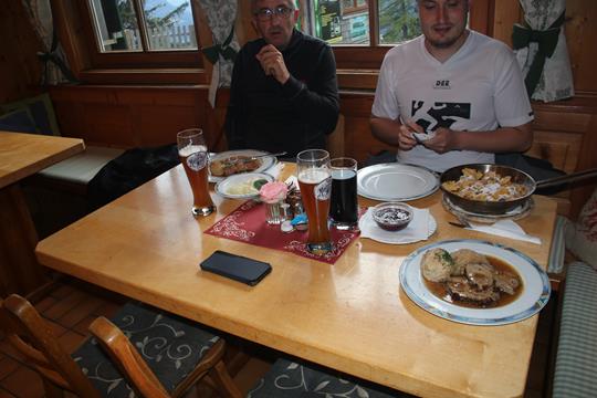 Beim zweiten Anlauf ist Humprey Sichtbar, wo bleibt Flori, er ist gerade vor dem Steilen Aufschwung, er möchte diesen Umgehen, spinnt denn der! Ja nicht! Humprey kehrt um, etwas später erreicht auch Flori die letzte Anspruchsvolle Stelle, schaut doch ganz gut aus wie er diese begeht. Gott sei Dank. Als die beiden am Ausstieg sind, nehme ich die Bestellung entgegen. Organisiere für Flori ein Radler, Humprey wünscht sich ein Hefe. Ein Wechsel zwischen Sonne und Wolken bei Angenehmen Temperaturen. Als die beiden verschwitzt am Tisch Platz nehmen, stehen die Kühlen Getränken auf dem Tisch. Es ist 16.20 Uhr geworden, Wir holen den Rucksack Vespern vom mitgebrachten. Ein guter Zeitpunkt für die Notizen, von Osten verdunkelt sich der Himmel. Organisiere eine weitere Runde, ein jedes Mal versammeln sich Gäste an der Theke, im Eingang der Gaststube, da läuft der Umsatz, gefühlt sind gar nicht soviel Gäste Anwesend, unendlich viele Knödel sind vorbereitet. Nett und Urig die im hellen Holz vertäfelte Gaststube mit ihren 4 Tischen a 8 Plätzen, Dank der Eckbank liegt die Kapazität auch höher. Etwas Unorthodox die Toilette befindet sich ein Stock höher. Lecker die Pistazien wobei das Verlangen nach Flüssigkeit steigt. Humprey kramt Gummibärchen aus dem Rucksack. Gegen 18 Uhr liegt der Nahe Gipfel in Wolken. Humprey möchte das Handy laden das ist der Zeit Punkt für den Rückzug. Wählen den freien Tisch in der Ecke. Das Nebenzimmer ist geschlossen. Flori und Humprey bestellen einen Schweinebraten mit Knödel und Salat für 16€, Humprey mochte zur Vorspeise eine Suppe. Interessant +- 25 Personen Essen auf der Terrasse (wohl des Platzes wegen. Während 16 Gäste in der Gaststube versorgt werden. Bestelle etwas Später das AV Essen. Der Braten mundet hervorzüglich.