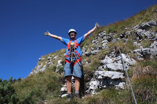 Nach 20 Minuten warten starte ich. Nach wenigen Bewegungen bin ich im Rhythmus, Souverän die Körperlichen Bewegungen ja es macht richtig Spaß. 5 Minuten später Tausche ich mich aus, Flori fehlt die Puste. Mehrere Stellen Wahrlich ausgesetzt. Dickes Stahlseil ausreichend Trittstifte, aber auch mal nur den Fels Touchieren, das Highlight eine fast Senkrechte Platte, die am linken Ende begangen wird, Luft unter den Sohlen und das Reichlich. Die Schwierigkeit D ist treffend. Gleichdarauf folgend ein Latschen bewachsenes Geh Stück (A) mit Steig Buch. Die letzte Platte verläuft ansteigend in Richtung der Sichtbaren Hütte. Ein Spannender Klettersteig von 150 Hm. Zielstrebig zur Terrasse. Unterhalte mich mit einem Herren, der sich über meiner Erfahrung wegen diesen Steig befragt. Er erwähnt das dieser Steig in 7 Minuten begangen worden ist, mir gegenüber sitzt ein Ortskundiger. Zum Leidwesen gibt es keine Zitronen Limonade Almdudler ist kein Ersatz, dann ein Radler bitte. Leckere Gerüche dringen aus der Küche, das Personal ist fleißig beim Vorbereiten des Abendessens. Die Tages Gäste verlasen die Lokalität, die Bestellungen werden jetzt nicht mehr sofort bezahlt. Was gibt es heute als AV Essen? Der Junior spricht von Gulasch, der Senior murmelt von Kaspress Knödel, Sonderbar denke ich mir. Geduldiges Warten auf die beiden, so langsam komme ich ins Grübeln, aufgeregt steige etwas ab um den Steig einzusehen, doch nur das letzte Teil Stück ist von „gegenüber“ sichtbar.