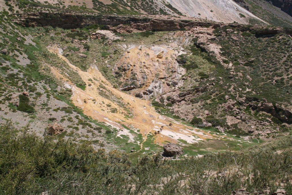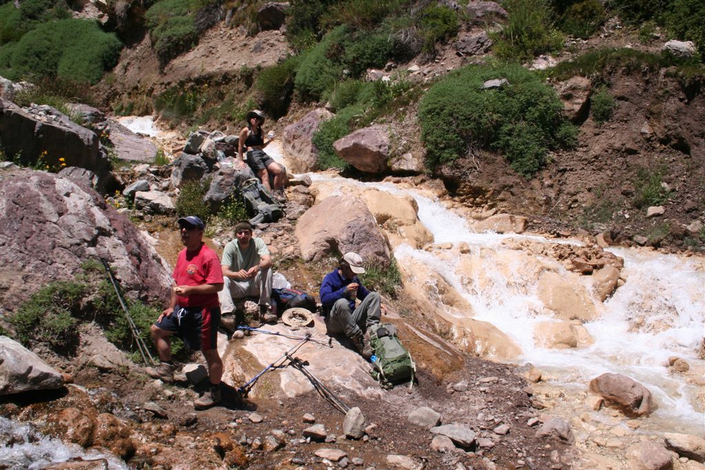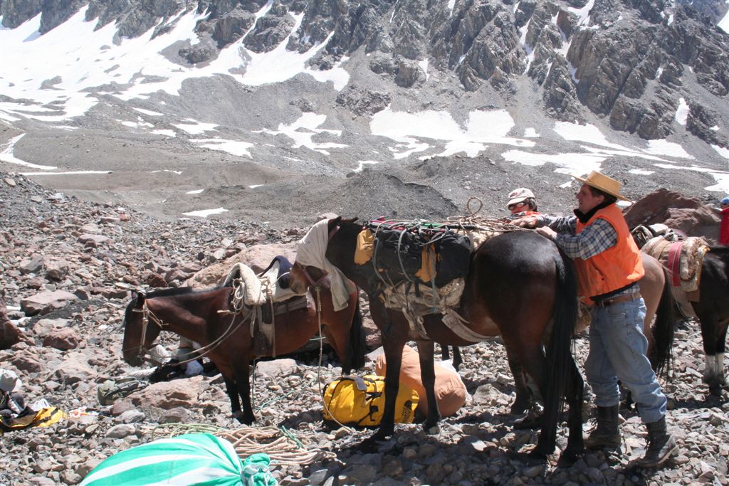 Wie schon zwei Jahre zuvor (Tupungato) geht es zuerst ausgesetzt an einem losen Hang quer, um danach in das noch schattige Tal des Rio Colorado einzubiegen. Ja es ist jetzt schon nach einer knappen Std. festzustellen, die Kondition der Teilnehmer ist auf keinem gemeinsamen Niveau, die wohl besser konstituierten werden sicherlich die Schönheit dieser fast unberührten, aber langsam abnehmende Vegetation wohl deutlich wahrnehmen. Der erste glasklare Wasserlauf, eines wohl sehr hohen aber noch unsichtbaren Berges ist der ideale Platz, um das langsam entstehende Team wieder zu vereinigen! Fast eine ½ Std. später erreichen uns die Deutsch Chilenen, noch kann ich mir die Namen nicht einprägen, habe aber vorgenommen, jeden Tag einen Teilnehmer namenendlich und mehr kennenzulernen. Nach überschreiten, und dem steilen Anstieg des Gegenhangs des Estero Museo, verlassen wir die uns bekannte Route, gen Süden. Die Mulis tauchen wenig später wie aus dem nichts auf, kaum eine ¼ Std. später sind sie auch schon an uns vorbei, Wir mühen uns hingegen eine Hochfläche nach der anderen, bei brütender Hitze nach oben. Die Pflanzenwelt wird immer kärglicher, unglaublicher Weise grasen hier oben einige fast frei lebende Wildpferde (im Winter werden sie in das Tal abgetrieben) in schier völlig unberührter Natur. Mit etwas Glück kann ein Hase wahrgenommen werden. Wir nützen die Zeit an geeigneten stellen, um die sogenannten Nachzügler aufschließen zulassen. Je höher wir gelangen nimmt die Zahl der „Rindviecher“ stetig zu. Es folgt nun der schönste Part des Anstiegs, über einen bestimmt 300m fast senkrecht abfallenden Fels Rücken der als Fotokulisse in jeden spannenden Wildwest Film passen würde ,erreichen wir die „Wiese“ eine von weitem mehr als Grüne ca.4 Km große Hochfläche, in der es von wilden Kühen nur so wimmelt. bedingt durch das hier aus dem Berg dringende Oberflächen Wasser, fühlt man sich hier wie in einer Oase, in doch großer Höhe von 3100m. In einem großen Bogen erreichen wir gegen 17.00 Uhr einen Lagerplatz, direkt neben einem großen Felsklotz der mit einem Kuh- Totenschädel geschmückt ist, hier hatte Alvaro mit Claudio Lopez das erste Lager vereinbart, von den Tieren und damit unserer Ausrüstung war aber keine Spur. Ich machte mich auf den Weg, denn letzten aber auch aller letzten einsehbaren Winkel in Augenschein zunehmen, ohne Erfolg kehrte ich nach einer Std. zum Camp I zurück. Es wurde beschlossen hier an dieser Stelle auszuharren, fließendes und glasklares Wasser das mit einer großen Schüttung aus dem fast 4000m hohen Hügel drang, und eben ein Camp mit Steinwall und Feuerstelle, denn wir später noch erhöhtem, um uns von dem stetig wehenden Wind zu schützen, sollte uns als Notquartier dienen.