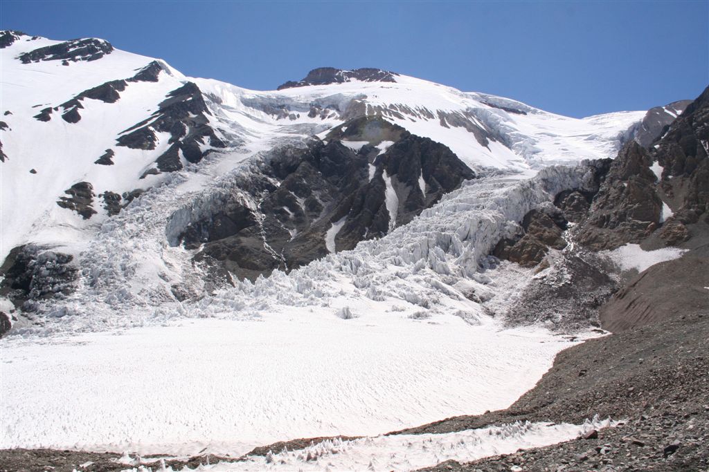 Jetzt setze ich ein Zeichen, taten müssen nun folgen! In wenigen Minuten im langsam steiler werdenden Gelände, erarbeite ich die Führung. Am Rand auf denn verfestigten Büßern und dem losem Gestein setze ich eine deutliche Spur, so nach dem Motto 2 Schritte hoch einer zurück, und tatsächlich folgt der Tross, ich bin in meinem Element, die Willensstärke sowie innere Kraft und ein großes Ziel vor Augen ziehen einen unbändig nach oben, immer größer wird die Distanz zwischen uns, zu gegebener Zeit halte ich inne, sie spüren da geht was, Automatismen spielen sich hier ab, instinktiv folgen sie ihrem „Leitwolf“, das ist Psychologie! alsbald wird ein erster Kamin erreicht, ein guter Platz für eine nötige Trink und Erholungspause, Bea erreicht als nächste diese Stelle, nach und nach schließen die anderen auf. Amin der Pakistani hatte sich selbstständig gemacht, er versucht über die Südseite des Hoch Tals eben das Ende diesem zu erreichen, mit seiner Leuchtgelben Rucksack Hülle konnte man ihn gut ausmachen. Das Eintreffen von Lisa war das Startsignal für denn Kamin, ja diese Passage erforderte nun die ganze Konzentration, teilweise Schnee und Eis, dazwischen lose Steine erfordern höchste Vorsichtig, ja keine Lawine auslösen unten warten die anderen. Trotz der ausgehenden Gefahr geht es recht flott nach oben, oh Graus!! in diesem losen Schutt auch noch nach links queren…unter aller größter Vorsicht. Ohne auch nur ein Steinchen gen Tal zuschicken enteile ich dieser giftigen Passage. Weiter oben halte ich inne, prima gegangen du „Sau Hund“ ich Lobe mich selbst. Alvaro kommt, Super! Eine gewisse Zeit halte ich Blickkontakt, die folgenden Felsen die teilweise um oder überklettert werden, verhindern eben denn Kontakt, ja das ist meine Welt! Ausdauer und Kraft einzusetzen! die mehr als 20 Kg Gepäck werden jetzt erst richtig wahrgenommen, bremsen auch spürbar denn Körper und Aufstieg stark ab! Wie geht es denn anderen solche Fragen gehen einem durch denn Kopf? Die Aufstiegsroute ist leider nicht mehr einzusehen. Wahrscheinlich das große Ziel vor Augen, werden allerseits letzte Kräfte freigesetzt. Ab jetzt gilt es links in Richtung des erkennbaren Wasserlaufs, der vom Joch zwischen Pyramid und dem Piuquenes fließt zu queren. Ohne auch nur einen Meter Umweg in Kauf zunehmen, „überschreite“ ich die einzelnen bis zu 150 m breiten Büßerfelder inmitten, “nichts kann mich mehr aufhalten“ als dann Amin im unteren Abschnitt des vereisten Wasserlaufs auftaucht, ist der für mich ausgemachte Lagerplatz fast schon greifbar. Gegen 14.40 Uhr ist das „Plateau“ eine relativ ebene Hochfläche auf 4930 m jubelnd erreicht. Mit geschultem Auge, wird ein idealer Zelt Untergrund nahe dem Rinnsal reserviert, und von ersten groben Steinen befreit. Als Amin unter einem Ur schrei, die bleibe für die nächste Tage ansteuert, spürt man förmlich dass wir alle zusammengehören. Mit einem herzlichen Shake Hands gratulieren wir uns gegenseitig zu einer harten Etappe. Bei starkem Westwind unterstütze ich denn „Wilden Mann“ diesen Namen bekam er von mir durch seine Raue und irgendwie eigenwillige Art, aber als absoluter Teamplayer, beim eben erschwerten Aufbau des Zeltes. 1 Std. nach meiner Ankunft erreicht Alvaro danach Jens gefolgt von Gonzalo und Beatriz Camp 4.Rasch wird das Zelt er und eingerichtet.