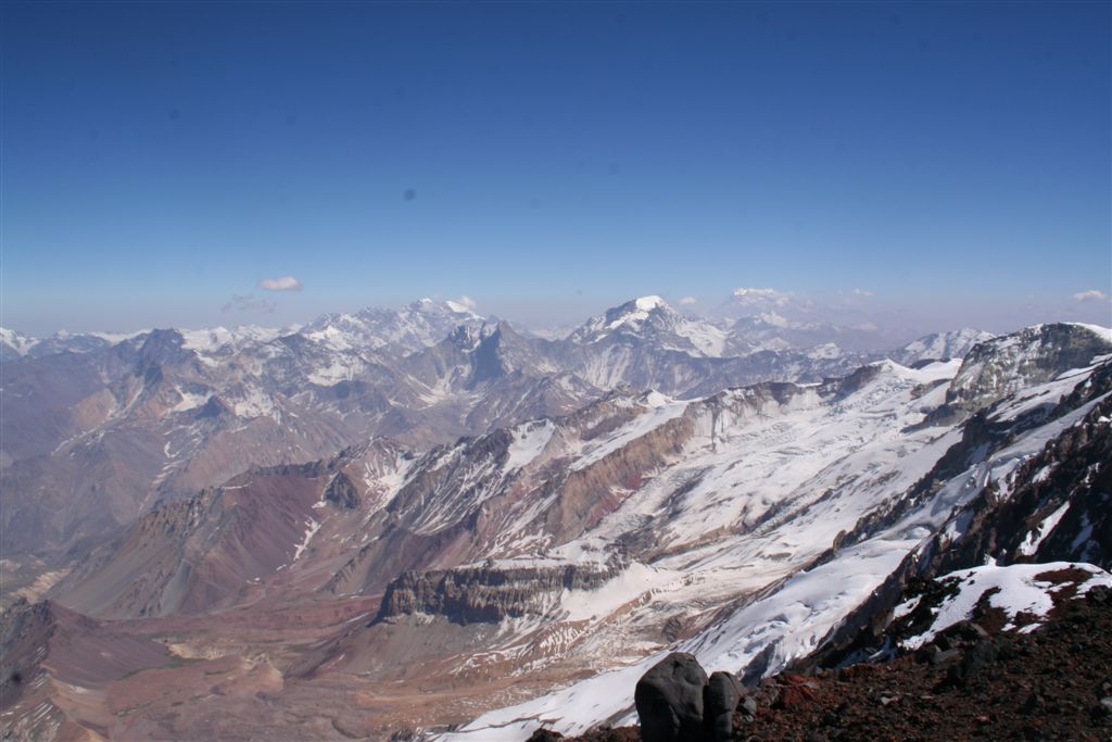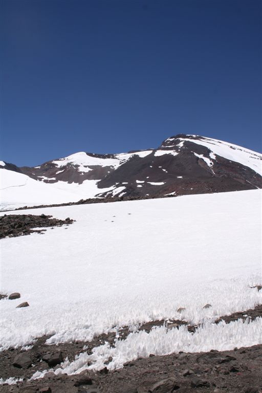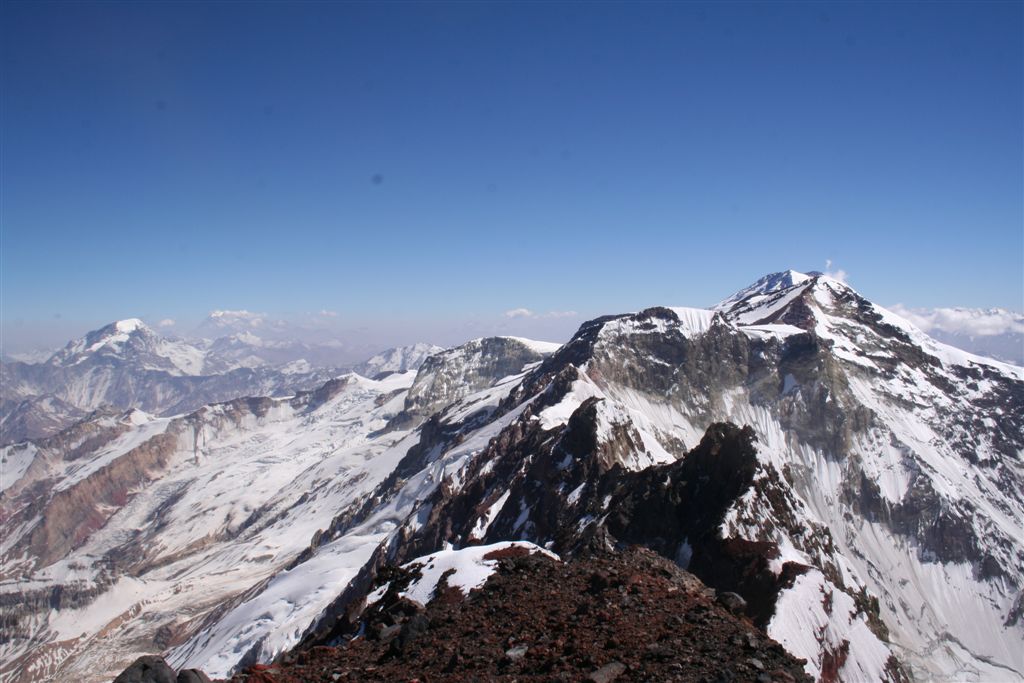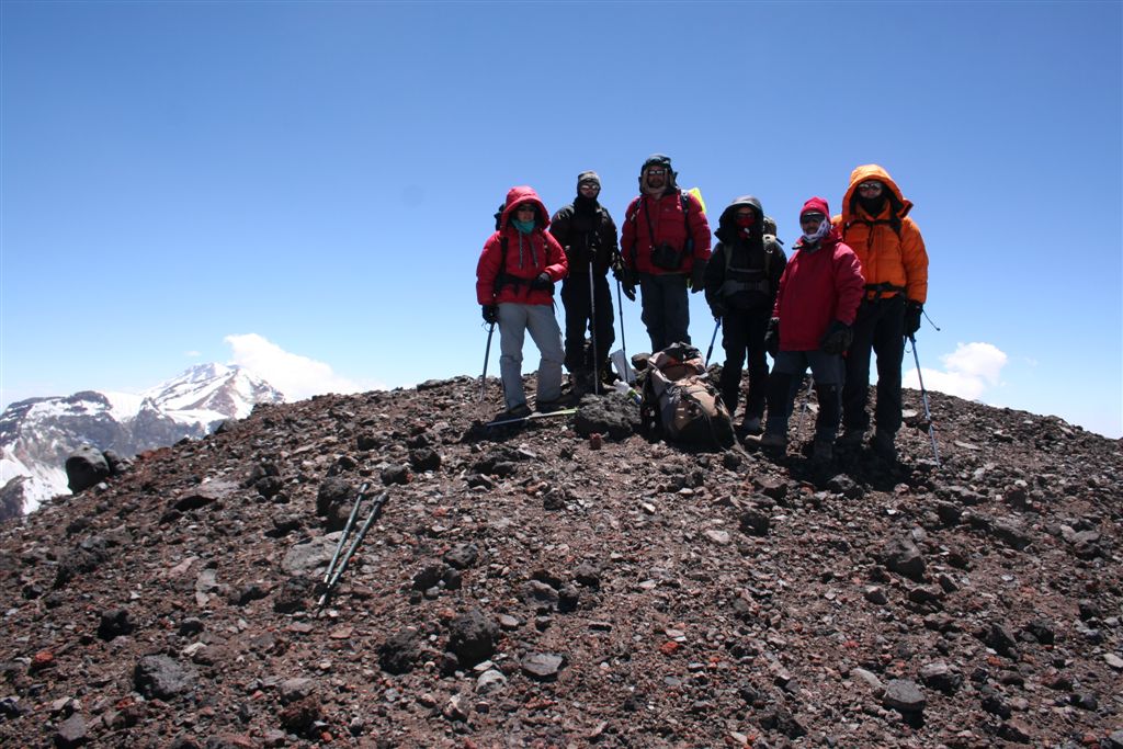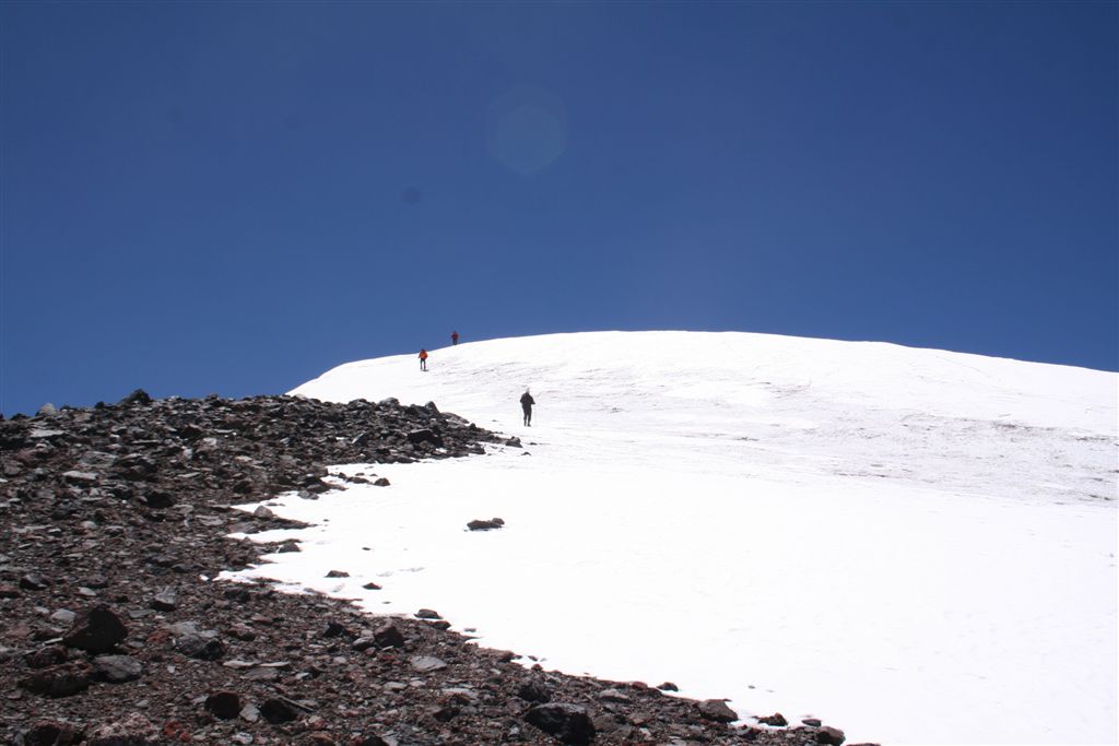 Am ca. 500 m langen Gipfelgrat denn ich aufgrund des starken Winds in der Ostflanke begehe, treffe ich mich mit Alvaro kurz vor dem Gipfel, gemeinsam erreichen wir zum ersten Mal überhaupt einen Anden Summit, gegen 11.45 Uhr stehen wir nach 2 ½ Std. und 615m Anstieg auf dem 5545m Hohen Pyramid. Von hier aus genießen wir zum ersten Mal einen Blick auf denn mächtigen Felsklotz des 6000 er Marmolejo. So langsam trudelt einer nach dem anderen ein. Die zwei Mädels sind noch nicht in Sichtweite, so begebe ich mich auf denn Weg, um nach denn beiden zusehen, die ich bald treffe, voller Stolz erreichen wir gemeinsam das Tagesziel, Lisas erster Gipfel über 5000m Höhe. Nach unzähligen Fotos, bei Super Fernsicht verewigen wir uns in dem unter einem Stein in Folie verpacktem Gipfelbuch. Im Abstieg nehme ich mich der Lisa an, um ihr noch so einige Techniken beizubringen, an dieser Stelle möchte ich feststellen, das dass Schuhwerk einiger Teilnehmer, auch die von Jens absolut nicht für dass Höhenbergsteigen geeignet sind, kaum Sicherheit für denn Fuß im speziellen für den Knöchel!Im Abstieg begegnen wir Ernst und Richard die schon sehr früh auf ca.4600 m gestarrten waren, allein bis zu unserem Camp waren sie 2 ½ Std. unterwegs! Die Zeit im etwas windstillen Lager nützen wir zum Waschen, soweit es in diesem verdammt kalten Wasser (wenige Minuten zuvor waren es ja noch Schneekristalle) eben möglich war. Am spätnachmittag gesellen sich unsere glückstrahlenden Nachzügler zu uns. Es sei erwähnt, das der geplante Schneebedeckte und vergletscherte 5000er Trono, ein echtes Highlight, eigentlich für denn nächsten Tag geplant war, aufgrund der bereits erwähnten Aufstiegs Ereignisse, dem Zeitplan zum Opfer viel. Unsere volle Konzentration galt nun dem Piuquenes ein wenig begangener, abseits des bekannten Tupungato liegender Riese. Nach einem für uns dos Alemanos erholsamen Tag, überließen wir die Küche Alvaro, der obligatorischen Suppe, folgte Reis mit Thunfisch dazu gab es die letzten Traumhaft guten Tomaten.