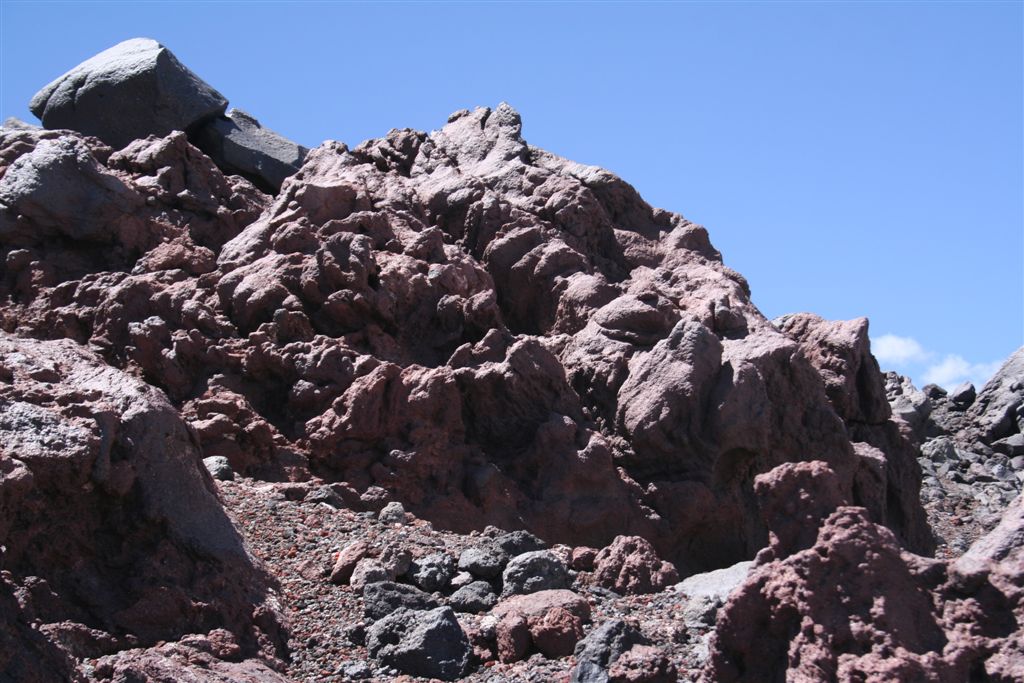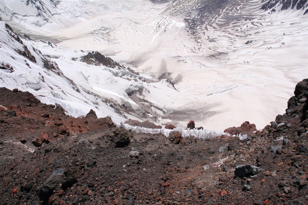 Mittwoch gegen 8.00 Uhr,gibt uns Alvaro das abgesprochene Signal zum Teekochen, selbstverständlich im Zelt, das durch die Feuchtigkeit insbesondere durch denn Atem erzeugt absolut vereist war, trotz eines geöffneten Reisverschlusses, sowohl vom innen und außen Zelt. Nach dem Genuss von Tee, Schokolade sowie Keksen, verlassen wir um 8.30 Uhr die tauende Tropfsteinhöhle. Bei regem Lagerleben werden die Schlafsäcke zum Trocknen ausgelegt, gemeinsam mit Jens verstauen wir etwas Proviant in einem Rucksack, alle anderen tragen je ein Gepäckstück, auf die Frage warum ein jeder seinen eigenen Rucksack der ja doch so ca.2 Kg wiegt trägt? War die Antwort, es sei so üblich wegen Wetter und so. Was passiert wenn es wirklich so kommen sollte, geht dann jeder seinen eigenen Weg? 9.15 Uhr, mit einem Vamos starten 8 Gipfelhungrige einem neuen Abenteuer entgegen. Nach einer kurzen „Plateau“ Querung, erreichen wir die nun ca.30° sehr lose Nordflanke, in einem stetigen mühevollen 1 Schritte nach oben und etwas zurück, quälen sich die Abenteurer gen Gipfel, jetzt zeigt sich Wille, Stärke und Anpassung, Lisa kämpft heftig, Jens machen Atemprobleme zu schaffen. Alvaro hält Anschluss, Beatriz und Gonzalo bleiben im größeren Abstand dran. Nach einer ersten kleineren Versorgungs- und Pinkelpause in der jetzt Ostflanke, macht sich Alvaro unbemerkt auf und davon, bald schon habe ich ihn teilweise kletternd auf einer etwas Südlichen Route,wenn man davon sprechen kann, Höhengleich erreicht, und passiert. Dieser Aufstieg ist im Prinzip bei Wahl einer einfachen Route unkompliziert, es bestand daher kein zwang gemeinsam diesen Anstieg zu begehen.