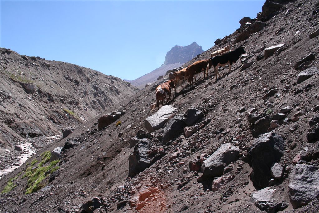 Dienstag 1.Januar 2008: Fortsetzung der Tour zum Tupungatito. Auch wir sind kurze Zeit später Abmarsch bereit. Die überschreitung des Estero Tupungatito bereitet uns in den Frühstunden weniger Mühe als noch am Vortag, nachdem wir die Stelle, die zum Tupungatito abzweigt, passieren, beginnt absolutes Neuland.Wie auch schon im Zustieg erleben wir es erneut, sobald ein Fluss in den Rio Colarado mündet, geht es richtig bergab, um an der anderen Seite wieder auf dasselbe Niveau (Höhe) zu kommen, fürchterlich! Doch dieses Mal läuft es anderst, wir bleiben rechts vom Fluss und gehen, ohne eine Wegspur zu erkennen, diesem entlang, nach ca. 150m kommt mir das „Spanisch“ vor, ich informiere die anderen darüber und gehe zurück, bevor ich die Stelle erreiche wo der Abstieg das Flussbett trifft, sind dort Spuren, die nach oben führen auszumachen, bis zum Einstieg sind es dann nur noch wenige Meter, der Anfang geht ganz gut, aber dann wird das Gelände unangenehm steil. Die erst Querung ist sehr heikel, hier ein Ausrutscher hätte böse Folgen, Vorsichtig gehen ist oberste Pflicht, der schwere Rucksack sorgt nicht unbedingt für ein besseres Gleichgewicht. Nach einer viertel Stunde Qual ist die Anhöhe schnaufend und nass „geschwitzt“ erreicht. Unglaublich… das hier Mulis hochgetrieben werden, für uns ist dies eher unwahrscheinlich. Endlich treffen wir auf erste Spuren. Sind wir doch nicht die einzigsten hier, bei diesem Gedanken fühlt man sich doch etwas wohler, wer weiß ob man in eine Notsituation kommt. Auch diese Hochebene, wie die anderen zuvor, zieht sich unendlich hin, ist aber von absoluter Schönheit, darin liegt auch der feine Unterschied zum eher langweiligen Anstieg zum Aconcaqua. Inmitten dieses Plateaus erspähen wir links vom Weg einen Lagerplatz, voller Neugier nähern wir uns diesem. Super, hier liegen Konserven und Verpackungen am Boden! Hoffnung auf Nützliches ist der erste Gedanke, vielleicht ist etwas Brauchbares dabei, hatten wir doch bei unserem „Rinder Überfall“ Verluste hinnehmen müssen. Tatsächlich finden wir Essbares, wie eine Wurst oder Pilzdose, lösbares Brausepulver, sogar Suppennudeln scheinen brauchbar zu sein, ja wenn das kein Glück ist schnell ist unser Fund verstaut. Zufrieden verlassen wir diesen Platz.