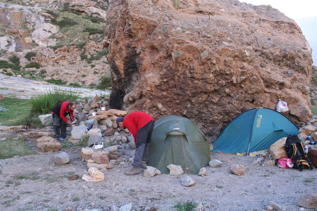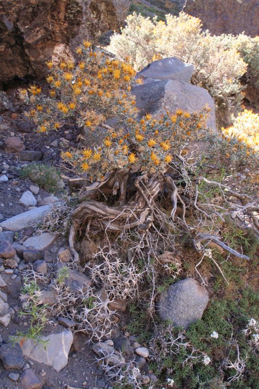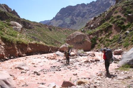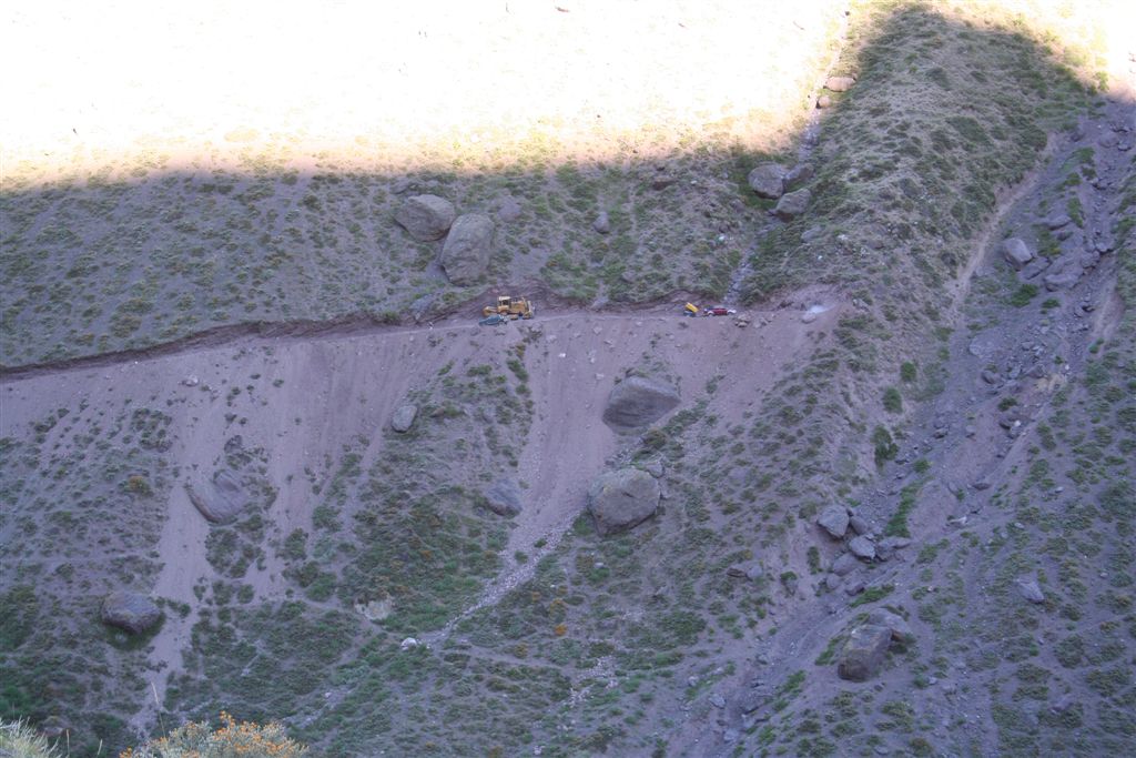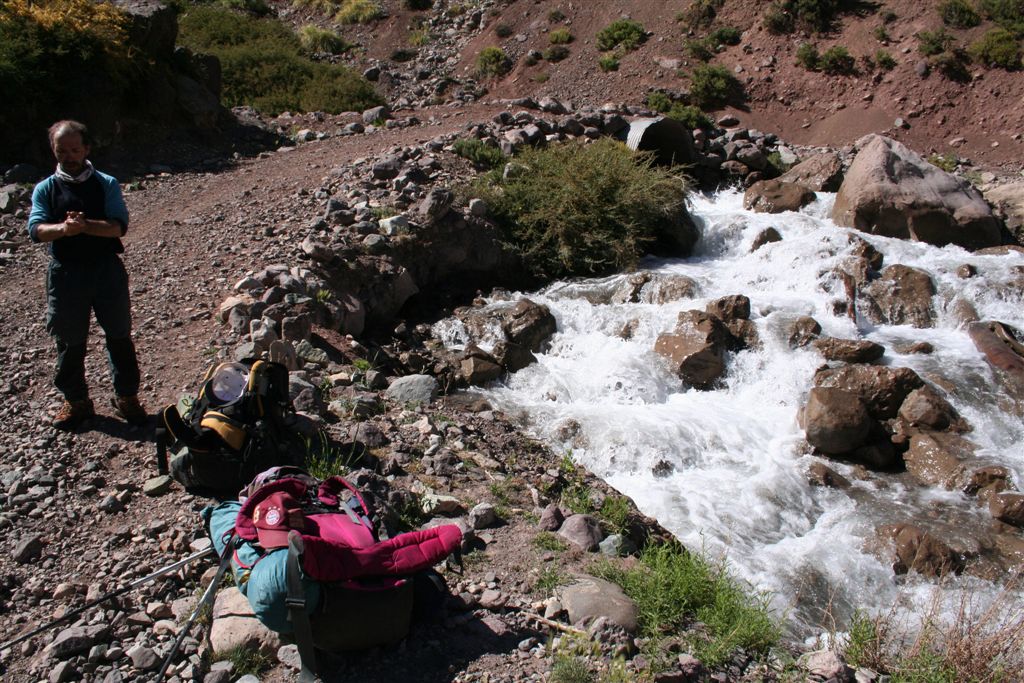 Dienstag 8.Jan. Bereits in aller Herrgottsfrüh, um 7.40 Uhr, gab es das Frühstück. Chefkoch Bodo servierte uns ein Travellerlunch. Das Lager verließen wir noch im Schatten, doch während des Aufstiegs von diesem Flusstal erreichten uns die ersten Strahlen der Sonne, ja wir wollten zeitig in Chacayer ankommen, sind wir doch auf ein Transportmittel angewiesen. Tief im Tal begleitete uns der mittlerweile dick angeschwollene und reißende Rio Colorado auf unserem Abstieg. Schön anzusehen waren die glasklaren Zuflüsse auf beiden Seiten, die absolute Trinkwasserqualitäten aufweisen, mittlerweile waren die Arbeiter, die mit schweren Gerät auf der gegenüberliegenden Seite (Teilweise wurde gesprengt) eine Strasse für die Erschließung einer Mine legen, ein gehöriges Stück vorangekommen. Je weiter wir abstiegen, umso vielfältiger und bunter wurden die Blumen und Pflanzen, im Aufstieg fällt das gar nicht so auf (Aber der Umkehreffekt ist umso faszinierender, irgendwie sind die bunten Gräser, Blumen, Sträucher und Bäume selbstverständlich).
