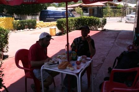Wir lassen unser erste Camp unter uns liegen, wenige Biegungen später stehen wir vor der steilen, mit einer brauchbaren Spur versehen Aufstiegsflanke, die uns dann nur noch 20 Minuten von Chacayer trennt. An der letzten Wasserstelle erfrischten und stärkten wir uns an diesem herrlichen Bergwasser. Nach 12 Tagen erreichten wir diesen Ort, Ausgangspunkt einer perfekten Tour. 55 Km Strasse trennten uns von San Jose de Maipo, noch war unklar wie dieses Ziel erreicht werden kann. In Chacayer stand zwar ein Jeep, aber gemeinsam wurde beschlossen, dass wir keinen Chauffeur anheuern. 25 Minuten folgten wir dieser Schotterpiste, an einer Brücke legten wir unser Gepäck ab, es war zwar Fahrzeugverkehr, aber nur in eine Richtung und zwar nach oben. Mit jedem Fahrzeug, das uns passierte, wurde Jens nervöser, ja sogar giftig. Es war sehr heiß, so entledigte ich mich zuerst meiner hässlichen Schuhe und Socken, danach fielen die Textilien oberhalb der Hose. Ich gab einen guten Spruch zum Besten: je mehr ich ausziehe, desto eher kommt ein Fahrzeug. Es dauerte ein ½ Std. als etwas oberhalb ein Jeep um die Ecke gebogen kam. „Jens, geh an die Strasse und gib dein Bestes“. Er streckt die Hand aus und tatsächlich stoppte das Fahrzeug, so schnell wie jetzt war ich glaub noch nie angekleidet. In Windeseile war unser Gepäck auf der Ladefläche, im Fahrzeug inneren befanden sich leere 25 L Trinkwasserbehälter, wahrscheinlich ist er unterwegs um diese auszutauschen, sicher ist, dass er ein Firmenfahrzeug fährt, sein Fahrstill lässt keinen anderen Schluss zu. Für die 24 Km benötigt er nicht einmal 30 Minuten. An der Schranke von Gener endet für uns diese Fahrt, dankend verabschiedeten wir uns von ihm. Wir meldeten uns beim Portier zurück. Im war sofort klar das wir Bergsteiger sind, er fragte nach unserem Namen den wir gerne nannten ,er schaute in seinen Unterlagen nach der Genehmigung aber irgendwie konnte er sie nicht finden, auch am PC nicht, er machte eine Notiz auf ein Stück Papier und erklärte es sei alles OK. Ich musste jetzt unbedingt zum Pinkeln, wenige Meter entfernt entledigte ich mich von diesem Ballast. Ein Schild (100 m entfernt) inmitten einer Ferienanlage „Almecia“ mit Cristall Werbung (Tante Emma Laden) weckte plötzlich mein Interesse. Vor dem Geschäft Sassen zwei Männer am Tisch mit einer Flasche Bier, im inneren befand nur ich mich, nach kurzem Warten erschien der Besitzer und begrüßte mich, die frage nach Pan (Brot), erwiderte Er mit no. Darauf hin bestellte ich eine Flasche Bier, aus dem Regal entnahm ich eine Packung „Art“ Flips, plötzlich kam Aktion auf, wie ein Lauffeuer hatte sich Jens Ruf nach mir, durch die Ferienanlage bewegt. Fuchtelnd und rufend wurde ich darauf aufmerksam gemacht, zur gleichen Zeit erschien der Inhaber mit einer Bottila Cervezza, ich legte 1200 Peso auf die Ladentheke, die Flips blieben zurück, bedankte und verabschiedete mich. Kurz darauf erreichte ich die Wartenden, die das Gepäck schon verstaut hatten, schon ging die Fahrt los. In kürze erfuhr ich den Ablauf, wie wir zu diesem Transport kamen. Es war und ist unglaublich, wenn drei verwilderte Bergsteiger mit großem Gepäck zweimal innerhalb einer Dreiviertelstunde jeweils vom ersten Fahrzeug mitgenommen werden. Da er nach San Jose fuhr, teilten wir ihm mit, dass wir bei den Carabinieros aussteigen möchten. Um 13.45 Uhr ereichten wir die Station, da er es mehr als eilig hatte, flog das Gepäck regelrecht vom Fahrzeug, wieder bedankten wir uns höflichst, schon war er verschwunden. Obligatorisch meldeten wir uns bei der Polizei zurück, der Beamte schaute uns an und verliess den Raum, kurz danach kam der nette Beamte, den wir in bester Erinnerung behalten werden, in den Raum, und begrüßte uns erfolgreiche Bergsteiger per Handschlag. Wir machten ihm klar dass wir gern ein Foto mit ihm vor der Station machen wollten. Im Anschluss des Fotos verabschiedeten wir uns auch von ihm.