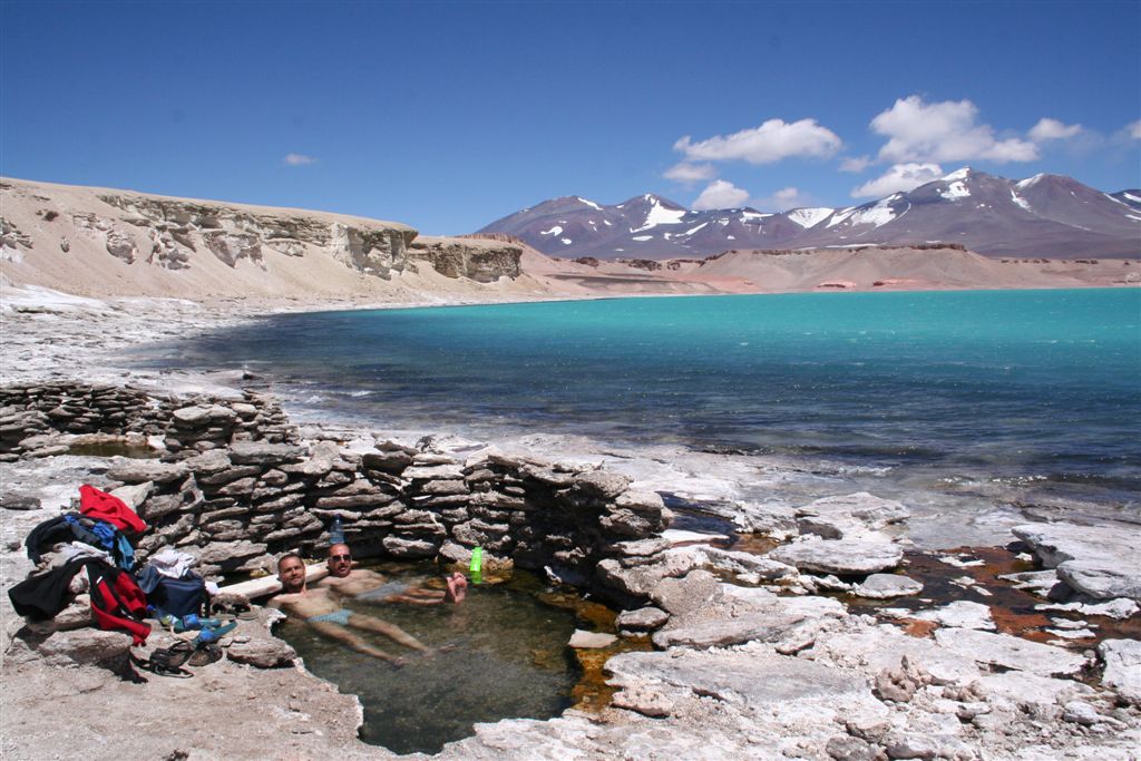Dienstag 22.Januar Die Nacht auf dieser Höhe bereitete uns keine Probleme, das ist natürlich ein sehr gutes Zeichen für die nächsten Tage. Mit einem reichhaltigen Frühstück starten wir gut gelaunt in diesen Tag, schnell war die Ausrüstung verstaut, vor uns lag eine 50 Km Fahrt zur Laguna Verde, ein gigantischer Salzsee auf 4230 m Höhe, während der Fahrt sehen wir die ersten zwei Guanakos die wir nicht weiter beachteten, leider sollten dies aber vorerst die letzten sein. Bei der ersten Gabelung biegen wir Links ab, um in Richtung der Chilenischen Grenze zu fahren, nach einigen Kilomter auf der nun schwer zu befahrenden Sandpiste, stehen wir vor der Entscheidung rechts ab Richtung Laguna Verde oder zum Posten der Grenzpolizei. Wir entscheiden uns zu ersteren, dazu muss Jens aber das Fahrzeug wenden,er holt in einem weiten Bogen aus, setzt dabei das Fahrzeug so heftig auf, dass wir es nur mit dem Einsatz unserer Grossen Bordschaufel wieder fahrbar machen können, bei diesem harten körperlichen Einsatz macht sich dann doch die Höhe bemerkbar.Zwar beeindruckt aber doch etwas unsicher über die gewählte Route, nähern wir uns stetig ansteigend, dem Giganten Tres Cruz, mit seinen drei Hauptgipfeln über der 6500 Metermarke. Als wir endlich das Plateau erreichen, sind wir schon weit über 4000 Meter, von hier lässt sich dann das Gebiet einsehen, ja wir hatten alles richtig gemacht. Anstatt ein Eck auszufahren, hatten wir die deutlich kürzere Diagonale gewählt Ersparnis mindestens 15 Km. Alsbald war die befestigte Piste erreicht, das Schaukeln hatte ein Ende. Nach einer scharfen Linkskurve taucht dann wie aus dem nichts die Stahl Blaue Laguna Verde auf, sofort werden einige Bilder geschossen und schon geht’s weiter, wir verlassen an der ersten möglichkeit die am See liegende Straße und stoppen unseren Jeep am hiesigen Rifugio. Nach einer kurzen Unterhaltung mit einem der anwesenden Officer, schlüpfen wir in die Badehosen und nehmen in einer der beiden Thermen unser ca.40° warmes Bad. Da um uns ein heftiger kühler Wind weht, wird das Wasser nur kurz für ein Foto verlassen. Im Anschluss daran, informiere ich mich bei dem netten älteren Deutschsprachigen Herrn gezielt nach denn umliegenden 6000er, dabei stosse ich auf neue Alternative Gipfel. Interessanterweise erhalte ich die Info, das das Rifugio Claudio Lucero offen ist, und was auch noch wichtig ist, es gibt eine Trinkwasser Quelle einige Kilometer nach der Grenzstation. Rein in das Vehiculo und los, alsbald ist die Grenzstation erreicht wir geben unser Permit bei den Grenzern ab, und erklären so gut wie es möglich ist, dass wir noch "kurz" zum Passo San Franzisco 4775 m einer der höchsten Grenzübergänge fahren.