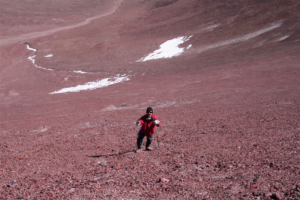 Freitag: 6.30 Uhr schrillte das Handy, die Temperatur beträgt 0°. Bestens Organisiert, stiegen wir 40 Minuten nach dem verlassen des Daunenschlafsackes und dem Frühstück die Treppen ins Freie ab, selbst das Auto wurde so untergestellt dass die Scheiben frei waren, um 7.15 Uhr ging es dann ohne Bodo, der sich diese Qualen nicht antun wollte, in ein neues Abenteuer oder auch Herausforderung. Unser Ziel war der 6119 m hohe in Rotfarben Getauchte Barrancas Blancas, die Details für die Anfahrt bezogen wir eigendlich aus den Karten, die wir uns im Militärischen Institut gekauft hatten. Aber schon beim Vergleich des Materials mit dem der Argentiniern, wurden erhebliche Unterschiede festgestellt, wir konzentierten uns bei der ca. 25 Minütigen Anfahrt, an der von uns ausgemachten Flanke, interessanterweise waren überall Spuren von Fahrzeuge auszumachen, aber keine eigendliche Fahrspur vorhanden, so quälten wir unser Allrad Fahrzeug wortwörtlich über wild vom Vulkan ausgespuckte Steine, Meter um Meter nach oben. Auf 5000 m war dann aber wirklich Schluss .Es war wie die Morgenstunden der Tage zuvor Traumhaftes Wetter, keine Wolke weit und breit. Die ersten 300 Höhenmeter geht es in einem Bachbett gleichmässig ansteigend, vorbei an einem Lagerplatz nach oben. Der Talkessel öffnet sich dann, die Sicht auf die umliegenden Sandigen Flanken lässt aber noch keine Route erkennen. Immer wieder sind wohl Fußpuren aufzufinden, genau so schnell aber auch wieder verloren, nachdem Jens eine Toiletten Pause einlegt, gehe ich allein weiter. Irgendwann dann geht die Spur verloren, trotz systematischer Suche werde ich nicht fündig, die Zeit bis Jens aufschließt wird genützt, um etwas an Körper gewicht in den Sand zu setzen. Eigentlich war unsere Vermutung dass wir in der Flanke rechts, später dann über den Grat (Westlich), aufsteigen müssten, dem war aber nicht so. Jens hatte das Glück auf eine weitere Spur, etwas über mir gestoßen zu sein. Wenig später befanden wir uns auf dem richtigen Weg... denn diess Spur war deutlich ausgeprägt. Ein erstes Grosses Büsserschneefeld wurde im oberen Teil gequert, wobei der Schnee den Weg bedeckte, das bedeutete für uns, dass es eine ältere Spur sein musste, was auch ein gutes Zeichen war. Leider befanden wir uns noch immer im Schatten des großen Talkessels, so dass es hier auf 5650 m empfindlich Kalt war. Die Wegführung eröffnete noch immer Spekulationen wie es wohl weitergehen könnte, wir hatten zwar unsere Meinung aber es sollte ganz anderst kommen. Tatsächlich ging es nach einem kleinen Rechtsbogen in eine immer steiler werdende Flanke. Unsere Teleskopstöcke wurden zu einem wichtigen Bestandteil. Was jetzt folgte war echte, Kraft raubende Aufstiegsarbeit. Lose Vulkansteine und Asche, die in allen Farben leuchtete, erschwerte ein vorankommen stark, nach dem Motto 1 m Hoch einen ½ Meter zurück, aber wir waren sehr gut drauf und absolut Siegessicher diese Flanke zu meistern. Denn auf den letzten 150 Höhenmetern wurde es sogar gefährlich, der Vorausgänger musste querend die Fallinie verlassen, um das Risiko für den Nachsteigenden bei Steinschlag gegen Null zu setzen. Sobald der Abstand um die 40 Meter war, stieg Jens nach. So arbeiteten wir uns von einem Felsblock zum nächsten, im Bereich um oder über der 6000 Metermarke wurde die Flanke zu nehmend felsiger und objektiv sicherer, für wenige Meter ersetzten unsere Hände die bisher so unendberlichen Stöcke. Nach 4 Stunden Aufstieg flachte das Gelände endlich ab, ein Ende war Gott sei Dank in Sicht. War der Wind schon bis hier sehr unangenehm, so verschärfte sich das Ganze auf dem Weg zum Gipfel nochmals, wir waren diesem Treiben hilflos ausgesetzt. Um 12.05 postierten wir zu einem Gipfelfoto, die Umgebung genossen wir etwas windgeschützt in der Südflanke 15 Minuten verweilten wir on Top, ehe wir in westliche Richtung, also gegen die Aufstiegsroute, denn Grat stark gegen den Wind gebeugt verließen.