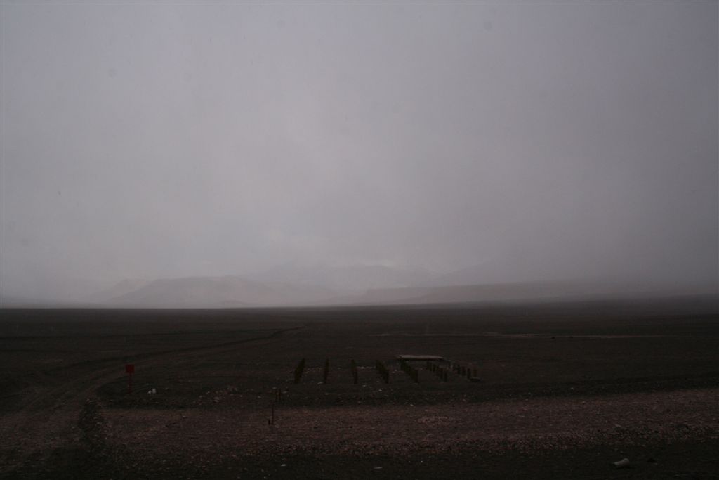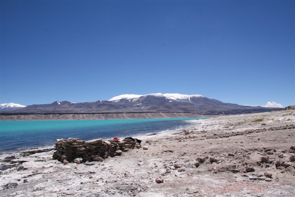 Unsere nächste Station ist die Stelle wo wir denn Jahreswechsel 2005/06 erlebten. Auch hier dasselbe Bild, das Wasser das aus dem Boden drückt, sorgt für ein sattes Grün. Überall liegt Tierischer Dünger,klar zu erkennen, ein sehr beliebter Platz für die Wüstenvierbeiner.Auf der weiterfahrt zur Laguna Santa Rosa müsen wir nach dem wir in ein Schlagloch gefahren sind, anhalten, um nach der Ladung zuschauen, es ging zwar nichts zu Bruch aber wie sich später herausstellte verloren wir ein wichtiges 5 Liter Wasserfass. Beim näher kommen an die Hütte der Conaf sehen wir mehrere Jeeps und Zelte stehen, es handelt sich wohl um eine Expedition das war klar. Da im Rifugio keine Betten stehen, war sofort auszumachen wo sich jemand sein Lager enigerichtet hatte, für uns drei war das Nachtlager jedenfalls gesichert. Alsbald hatten wir unsere Ausrüstung und Vorräte untergebracht, die Höhe von 3850m, machte uns glücklicher Weise wenig zu schaffen, dass war umso erfreulicher, war doch seit unserer letzten Tour schon 2 Wochen vergangen. Nach und nach füllte sich die Hütte mit denn Bergsteigern, die von einer Akklimatisations Tour von einem naheliegenden 5000m Gipfel, ziemlich wenn nicht sogar heftig gezeichnet waren. Mittlererweile hatten wir erfahren, dass es sich um eine Irische Expedition handelte, die sich den Ojos del Salado, den höchsten Vulkan der Welt, zum Ziel gewählt hat. Wie es der Zufall will, treffen wir auf einen Bergführer, der zwei Jahre zuvor eben auch hier an diesem Ort war. Nach dem sich die Expeditionsmitglieder zum Essen versammeln wurde es Eng, gerne verlassen wir die Schutzhütte, um uns am Salar die Flammingos und denn Salzssee genau unter die Lupe zu nehmen. Nach einem üppigen Gulasch mit Nudeln und einem guten Bier legen wir uns um ca.22.00 Uhr zum Schlafen.
