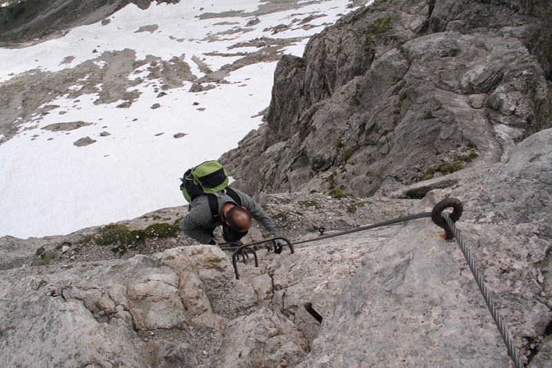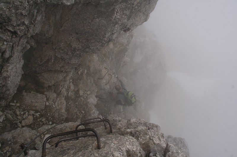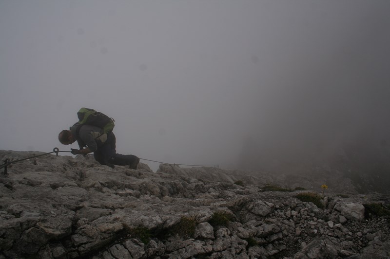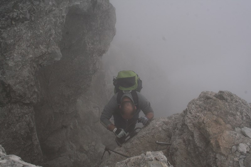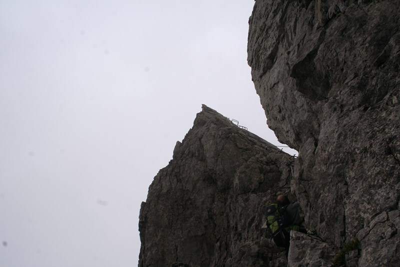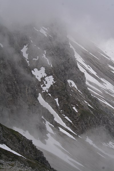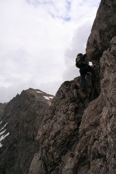 Es war 8.15 Uhr, auf zu neuen Taten...der Vormittag könnte trocken bleiben, die Sicht nicht unbedingt vielversprechend aber annehmbar. An der Kemptner Scharte staute es sich, die guten Geister der Sektion sperrten den Weg auf Grund Wartungsarbeiten, dies betraf uns nicht. Vorbei am ersten Aussicht und Hüttengipfel verlief der Weg über einen gutmütigen Grad, erst später ist der Einstieg erreicht, die Wolken verdichteten sich stetig, der Beschluss den Klettergurt erst gar nicht Auszupacken eine reine Zeitfrage kostet doch dieses Ding einiges zum Anlegen, es lief auch wirklich prächtig, mit Fug und Recht konnte behauptet werden das die Komplette Steiganlage absolut Schneefrei war, eigentlich schier unglaublich! In Richtung Fidere Pass Hütte waren deren nur zwei auszumachen, im letzten Drittel begegnen wir mehreren Gruppen, darunter auch eine mit Bergführer. Es darf behauptet werden eine richtige Funtour für Fortgeschrittene am absolut Trockenen und gut versichertem Fels. Gegen 11.30 Uhr nach 3 Std. der Ausstieg an der Weggabelung zum Krumbacher Höhenweg zufrieden und bestens gelaunt erreicht. Zwei Schneehühner waren nur schwer zum Warten zu bewegen doch irgendwie gelang auch diese Aktion sie in Bild festzuhalten. Über die Nördlichen Schneefelder tauchte erst kurz vor erreichen die Fidere Pass Schutzhütte auf. Obligatorisch die Bestellung ein Rußenmass dazu eine Gulasch und für Jens eine Knödelsuppe. Noch einmal schwelgten wir über die Ereignisse 2001 als wir 13 Personen Stark einige unvergessliche Erlebnisse hatten, u.a. stolperte die Bedienung mit einem vollen Tablett Getränke in denn Winterraum, ganz schön feucht war es plötzlich.... Im Abstieg gegen 13.00 Uhr, wurde es dann Feucht, zwar keiner richtiger Regen aber ein ganz feines Nieseln nässte ein, die Freude über eine gute Tour tat dies keinen Abruch. Locker vom Hocker nach 2 Stunden auslaufen standen wir wieder am Ausgangspunkt der Tour. Mit jedem Kilometer Fahrt in Nördlicher Richtung hellte es auf zuhause konnte man von richtig schönem Wetter sprechen. Eine absolut gelungene Tour. Nach dem Motto: Back to the Roads