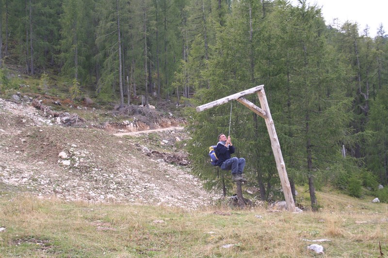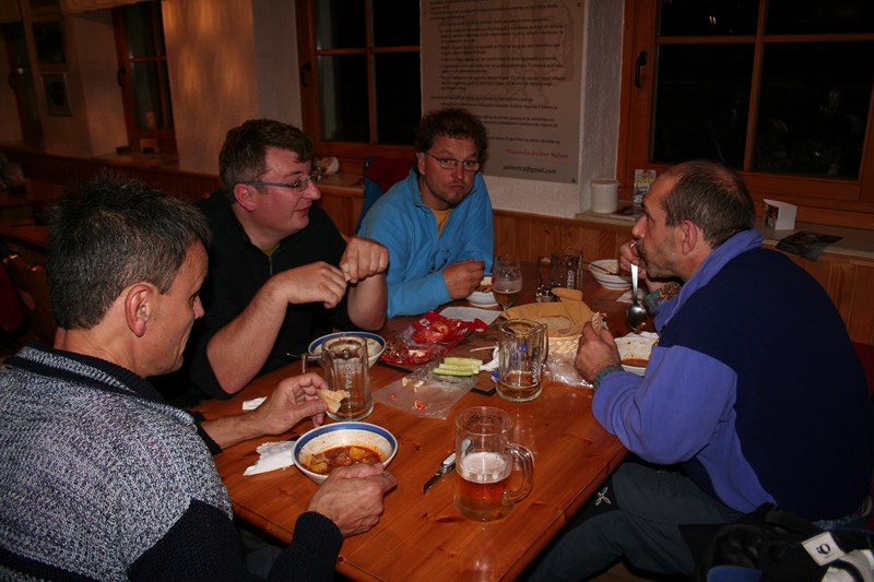 Etwas Monoton aufwärts bzw.entlang der Skipiste wird der Kniepsattel 2012m (Grenze zu Slowenien) angesteuert und um 16.25 Uhr, bei lebhaftem und Kühlem Wind erreicht, Zeit um sich etwas Warmes anzuziehen. Wenig später den Kordeschkopf 2126m betreten. Interessant die auf eine Plattform montierte Scheibe, diese wurde mit Hilfslinien versetzt, in denen die Umliegenden Berge, in etwa der Entfernung zugeordnet waren z.b. Großklockner zwischen 150 und 200 Km. Da aber die Sicht zu wünschen übrig lies, lag die Fernsicht je nach Wolkenlage und die hingen Tief, bei maximal 50 Km. Kein Ort für ein längeren Verbleib, es sehnte nach Wärme Schutz und Geborgenheit der Slowenischen Schutzhütte. In wenigen Minuten im Abstieg änderte sich das Bild, Grasbewachsener Gipfelbereich dann Latschengelände, das in 1800m den Bäumen wich. Nur noch wenige Tages Gäste befanden sich auf dem Dom na Peci (Petzenhütte) 1665m, wohl überraschend an einem Samstag. Fast ganz allein gehörte uns an diesem Abend die Hütte, am späteren Abend gesellte sich ein Jäger dazu. Der erste Große Hunger konnte mit der Rucksackverpflegung gestillt werden, später dann servierte der Gastwirt Gulaschsuppe vom Rind Schwein und Gams, zur Verdauung ein Schnäpschen. Frühzeitig erfolgte der Rückzug in ein Zimmerlager, die kurze Nacht lag noch in den Gliedern.