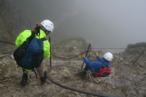 Sonntag 22. Juni: Zu den Frühaufsteher zählen wir nicht, warum auch...schließlich Tickt die Uhr an den Arbeitsfreien Tagen anders! Es war halb acht, da ja der Klettersteig in der Nordwand installiert wurde, spielt diese Tatsache eine gewichtige Rolle, Jens benötigt einen Kaffee, da ich mich vom Koffein getrennt habe, genügt an diesem Morgen ein halben Liter Wasser, mit Brause vermengt schmeckt es noch besser, dazu noch ein Stück Kuchen. Anlegen des Gurtzeugs, die wichtigsten Wertgegenstände finden sich in den Taschen wieder. Am Fels sind schon zwei Kletterer aktiv, weitere sind im Zustieg. 8.20 Uhr, wir erhalten den Vorzug vor einen 3 Gruppe, die Bedingungen sehr gut, Jens greift an das Stahlseil, gleich im Einstieg eine D Stelle, damit die Begeher die Situation für das kommende in etwa einschätzen können, Souverän meistert er diese Passage, jawohl ein guter Auftakt, für die noch folgenden knapp 400 Meter im Steig! Nachdem die ersten Szenen mit der Kamera festgehalten sind, folge ich ihm. Ja es macht Spaß, der Fels ist Griffig und weist gute Tritte auf. Der Kamerad klettert so gut wie ohne Sicherung, ein Zeichen das er sich sicher fühlt.