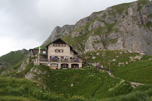Die letzten Meter im Aufstieg zum Grat, (der Natürlichen Grenze zu Österreich), erfolgen in engen Serpentinen, hier treffen sämtliche Aufstiegsrouten zusammen, dementsprechend viel Publikum steuerte auf die Bad Kissinger Hütte 1792 m zu, ja wie auf dem Jahrmarkt, verrückt! Nach exakt 1 1/2 Std. das erste Tourenziel erreicht, schon fing es an zu Tröpfeln, als Jens ankam, wählten wir die Terrasse als Unterstand, etliche Personen drängelten sich auf engsten Raum um vom immer stärker werdenden Unwetter sich zu schützen, auch ein Graupelschauer zog über die Hütte. Zum Vesper etwas zu trinken? klar! Jens Organisierte zwei Russen. Wurst, Brot, Tomaten, Zwiebel, Pfefferoni dazu Knobi, ein leckere Brotzeit. Eigentlich wollten wir hier Übernachten, warum die Hütte bis auf den letzten Platz weit vorab schon Reserviert war, wurde heute klar.