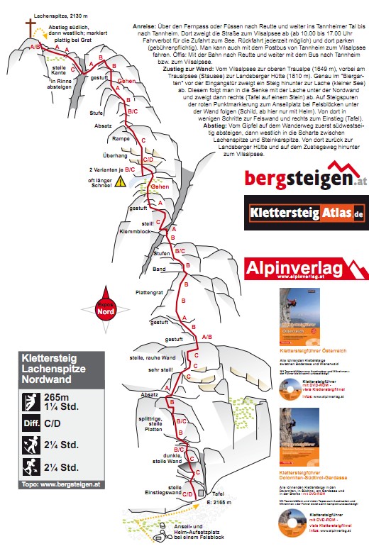 Der am 21. Juni 2009 eröffnete neue Klettersteig beginnt am Fuße der Lachenspitze Nordwand. Von der Landsberger Hütte aus erreicht man den Einstieg in ca. 20 Minuten über ein Geröllfeld. Von der Landsberger Hütte (1.810 m) erreicht man den Einstieg Stahlseilen abgesichert. Die Aufstiegsroute erfordert sehr gute Kondition, Trittsicherheit und Schwindelfreiheit. Der einzigartige Blick von der Lachenspitze auf die drei Seen belohnt die Kletterer für ihre Anstrengungen.