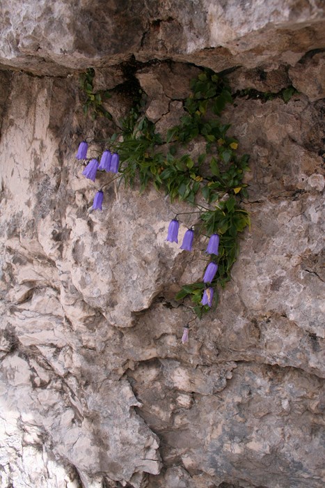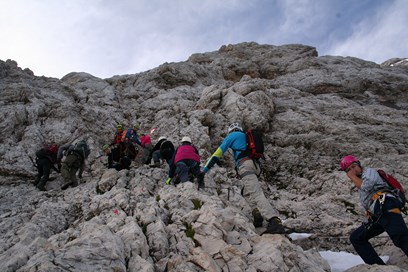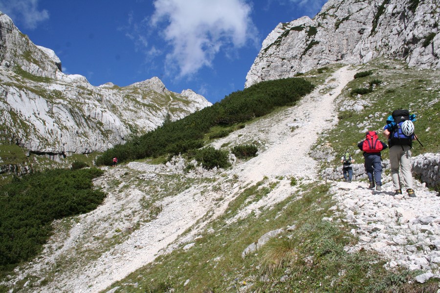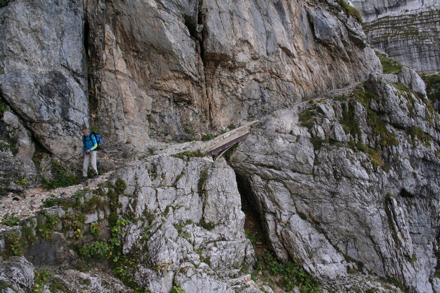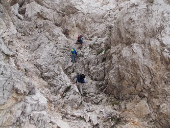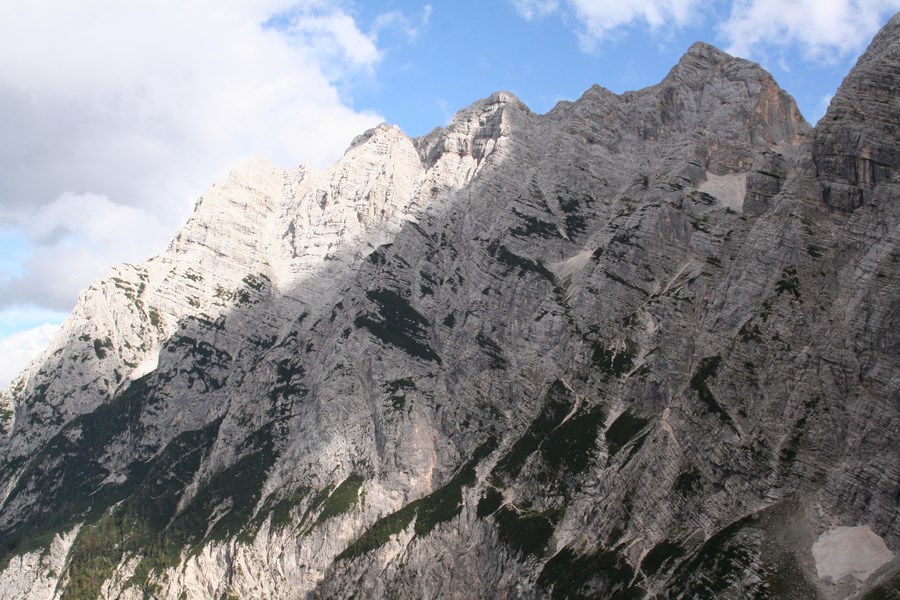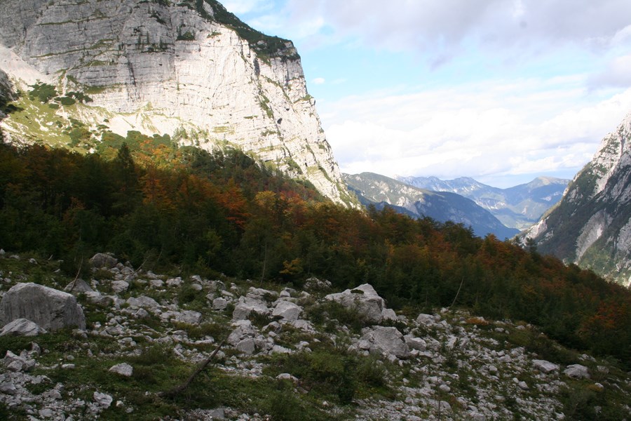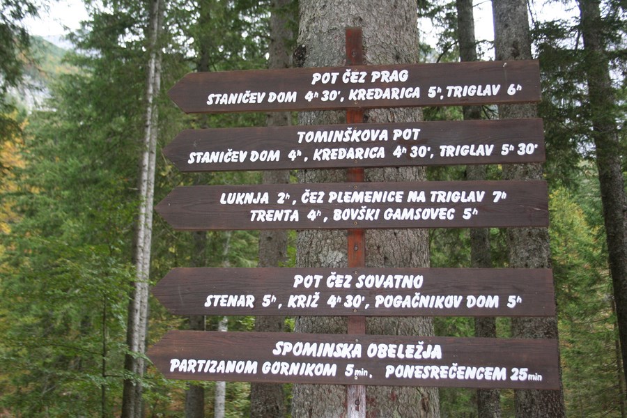 10.15 Uhr, zum Herbstlichen bunten Wald das Wetter passend, hier am Ende in diesem tiefen Tal, eher schattig und etwas Duster. Schon nach wenigen Meter ist die Gewaltige Nordwand des Triglav der Blickfang, die Felswand zur Linken auch nicht ganz ohne, hier soll der Aufstieg stattfinden, fast nicht vorstellbar. Die Tafel Nahe des Aljazev Dom, der inmitten einer Waldlichtung umgeben von Hohen Fichten Thront, gibt einen brauchbaren Überblick. Nach wenigen Minuten ist der Übergroße Karabiner der auf einem Stein sein Dasein fristet, ein perfektes Foto Motiv. Der Zustieg zum Tominsek Weg biegt gleich nach wenigen Metern Links ab, das Bächlein überwinden, dann geht es zwischen Laubbäumen nur noch Bergauf, alsbald wird eine langsame Gruppe überholt, im Bereich von 1300 m, lösen meist Latschen die Bäume ab, langsam wird es etwas Luftiger, der Horizont weitet und die Wolken lichten sich. Punkt 12 Uhr, die erste Rast zwischen Lärchenbäumen auf 1600 m. Überhaupt verläuft der Aufstieg zu 80 % wenig bis kaum Ausgesetzt. Erst im Bereich von 1700 m, wird es langsam Interessant, der Steig wendet sich nach rechts in Südlicher Richtung, erste Seilversicherungen sind installiert, interessante Aufschwünge wechseln mit schönen Natürlichen Bändern ab, 17 Sicherungsseile eine jede mit einer aufsteigenden Nummer versehen, vermitteln ungefähr die noch bevorstehende Länge des Anstiegs. Immer wieder taucht in jetzt schon ordentlicher Distanz (Tiefe) der Aljazev Dom in das Blickfeld.