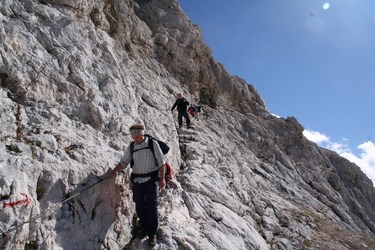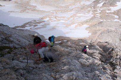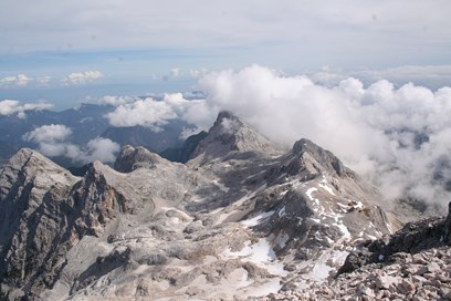 Ein Interessanter Anstieg über die Karstfelsen mit ihren unzähligen Löcher und Spalten, sehr schnell ist das Begunjska Tor erreicht. Auf einem schmalen Pfad wird der Vrh in seiner Nord Flanke gequert, eine Gämse wird auf uns Aufmerksam nimmt aber sofort Reis aus. Kurze Zeit später erspähen wir ein Steinbock, 50 m unterhalb, unsere Anwesendheit interessiert ihn nicht im geringsten, als er sich niederließ, war er ohne das Wissen über seinen Standpunkt gar nicht zu erkennen. In der Flanke queren wir bis zu einer ersten gesicherten Passage, eine geneigte Wandflucht gilt es über Tritt Stifte zu überwinden, zum ersten Mal wird der Grat betreten, es folgt ein kurzer Abstieg mit Querung. So richtig Klettersteig Charakter weist eine einzige Stelle auf, bestens gesichert geht es einen Art Kamin in die Tiefe, einzigstes Problem, die losen Steine die den Voraus Gänger Ernsthaft gefährden können, erst als der Vor Steiger „durch“ ist, folgt der nächste. Der Anstieg wird etwas spannender, des Öfteren wechseln ein einfacher Grat und die Ost Flanke ab. Danach wird der ausgesetzte Grat insbesondere in das Vrata Tal betreten, der Aljazev Dom liegt über 1300 Meter tiefer, von hier scheint es gar nicht glaubhaft das durch die Wand des Rjavceve und Begunjska Vrh der Tominsek Weg führt. Vor dem Gipfel Aufstieg geht es noch einmal Bergab in eine Scharte, Wenig schwierig ist der letzte Anstieg zum Cmir 2393 m, 11.30 Uhr, exakt nach 2 Std. ein zweiter Gipfel der Tour erreicht! In der warmen Sonne lässt es sich ganz gut im T-Shirt aushalten, auch der Wind scheint zu pausieren. Die Einträge im Gipfelbuch sind echt rar, der letzte datiert 5 Tage zurück. Gegenüberliegend ist der Grat eines weiteren Klettersteigs, der auf den Vrbanova spika führt, ein kleiner Blickfang, diese Tour wird von Mojstrana angegangen und endet an der Stanica Hütte. Obwohl wir schon mehrmals in den Julische Alpen unterwegs waren, fällt es schwer die einzelnen Gipfel zum einen zu erkennen, zum anderen den entsprechenden Namen zu zuordnen. Eine halbe Stunde genießen wir diesen Moment an einem wirklichen schönen Ort. Der Rückweg auf derselben Route wohl eine Wiederholung, doch jetzt ist der Triglav der Blickfang, etliche Bergsteiger befinden sich wieder am Berg, dadurch das die Tour ständig am Grat verläuft sind die Begeher gut zu erkennen. Der Cmir und auch die anderen Ziele werden so gut wie nicht begangen, eigentlich Schade. Richtig Spaß bereitet noch einmal die Kamin artige Verschneidung, im Aufstieg eine Nette wie schöne Einlage, von weitem erscheint der Weg unterhalb der Begunjska Vrh auf halber Höhe, wie mit einem Lineal gezogen, wenig später gilt noch einmal dem Steinbock die Aufmerksamkeit, er lässt sich beim Essen nicht im Geringsten stören. Kurz nach der Begunjska Vratca ist die Stanica Hütte Sichtbar, exakt eine Stunde, nur schade das die Tische die in der Saison fest installiert sind schon abgebaut sind, so müssen wir mit der Bank auf der Windschatten Seite vorlieb nehmen, gegen den Durst gibt es ein Mittel, in diesem Fall Radler oder ein Bier, in der Sonne wurde es so Warm und angenehm das wir gar nicht gehen wollten, also wurde eine Frittaten Suppe für 3,50 €, bestellt, und diese mit Knobi und einer klein geschnittenen Wurst von Olaf speziell gewürzt. 14.10 Uhr, mehr und mehr ziehen Wolken auf, Zeit sich zum Verabschieden, eigentlich war für heute noch einmal eine Übernachtung geplant, doch aus Logistischen Gründen blieb das Gepäck auf der Triglav Hütte. Nach wenigen Minuten und kurz vor dem ersten Schneefeld bemerkt Olaf sein Halstuch vergessen zu haben, nach dem ersten kleiner Anstieg, hebt sich in der Flanke die Aufstiegsspur deutlich ab, es scheint das der Weg direkt zum Triglav leitet, oben am Grat dann ein anderes Bild, dazwischen leitet ein Abstieg zum Triglav Dom, mit einer kleinen Kletter Einlage, mehrere Personen steigen zur Stanica Hütte ab, schön das da noch ein paar Gäste Übernachten, auch auf dem Weg in das Tal zum Prag Weg sind gezählt 8 Personen Unterwegs, ganz interessant wie sich der Weg durch die Mondlandschaft windet, wobei die Route nicht sichtbar ist, es ist nur zu erkennen wie Sie sich in einem hin und her Richtung Scharte bewegen.