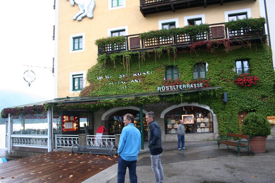 Dienstag 23.September: Dieser Schlafplatz ist zwar Trocken, doch die in der Nacht vorbeifahrenden Fahrzeuge, störten den Schlaf erheblich. Schulbusse und die Müllabfuhr die Krönung. 8.30 Uhr, beendet Jürgen das Drama. Ganz schön Kühl geworden 8°C, in Windeseile die Isomatten und Schlafsäcke verräumt. Eine Bäckerei in Sichtweite, es bedarf keiner Worte, ein Warmes Getränk dazu ein Süßes Stückchen, es war wohl allen klar, das bei diesen Bedingungen es unsinnig wäre, einen Klettersteig anzugehen. Die Nähe zum Wolfgangsee... liegt doch auf der Hand, ein wenig Kultur schadet nicht. Doch zuvor wird eine Tankstelle angesteuert, 53L a 129,8 €, nachdem die Falsche Fahrtrichtung eingeschlagen wurde, ging es zurück nach Strobl, von da war es noch ein Katzensprung bis St.Wolfgang. Trotz des schlechten Wetters ist es nicht einfach das Fahrzeug Zentrums Nahe zu parken. Nur wenige Meter neben der St.Wolfgang Kirche fand sich dann ein Gebührenpflichtiger Stellplatz. Nach kurzem schlendern durch die verwinkelten Gassen, werden wir fündig, eine Öffentliche Toilette an der Kasse direkt am Bootsanlege Steg, 10 Uhr, wie es der Zufall so will, bringt das Anlegende Schiff das Personal eben für diese Einrichtung gerade mit. Vom See aus war gut zu erkennen das die Schneefall Grenze sehr Tief gesunken ist, diese lag bei ungefähr 1400 m, darüber war die Landschaft Weiß gezuckert