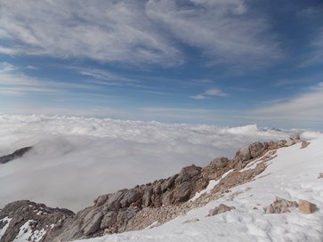 Da das Gelände wenig schwierig ist, stellt die Begegnung kein Risiko dar. Schon nach wenigen Minuten am Ostgrat kommt richtig Freude auf, die Route wechselt alsbald in die etwas ausgesetzte Südflanke, die Schlüsselstelle ein steiles Schneefeld ja nicht abrutschen da gibt es kein Halten mehr, das Problem die Sicherungsseile liegen unter dem Schnee vergraben, Normalerweise gehört diese Stück mit einem Seil wenigstens provisorisch gesichert, in leichter Kletterei ist der Grat der zum Vorgipfel Mal Triglav leitet geschafft, ein kurzer Abstieg danach wird der Grat mit schönem Tiefenblick etwas schärfer, bestens gesichert ist ein Aufstieg auch für Berg Erfahrene gut machbar, jedenfalls benützen wir den Klettergurt nicht, auf halber Weglänge begegnen wir Bergsteiger die über einen interessanten Grat zum Dom Planika absteigen, dieser ist gut sichtbar, der Aufstieg wird steiler und Abwechslungsreich absteigende begegnen immer wieder. Ein Fels Loch wird auf der linken Seite sichtbar, schade dass es Abseits des Weges liegt, wäre ein gutes Motiv um im Hintergrund den Gipfel des Triglav festzuhalten. Die letzten Meter sind wieder ungesichert aber gut Begehbar. Kurz vor 12 Uhr, ist der Höchste Gipfel Sloweniens König Triglav 2864 m, erreicht, wenig später treffen Bodo und Jürgen ein, ein zufriedenes Hände schütteln und das Obligatorische „Berg Heil“ Es liegt zwar hier noch einiges an Schnee, doch an diesem Ort stört sich niemand. Ein Blick nach Westen, schnell wird klar warum für den Vormittag noch gute Bedingungen voraus gesagt wurden. Interessant die Feststellung das sich die Wolken von Tal zu Tal schieben, und nicht über die Berge ziehen, Absolute Besonderheit ist der „Aljazev Stolp“ eine Runde Stahl Tonne mit einem Spitzen Dach, das ganze ähnelt sehr einer Rakete, 5 Personen finden hier bei Blitz und Gewitter Schutz. In der angenehmen Sonne lässt es sich gut Ruhen, etwas Schokolade zum Essen, Frechheit eine Dohle bedient sich an meiner Schokolade, als ich dabei war ein Bild zu knipsen. Immer wieder schwappt eine Wolke über, insbesondere Südlich. Tief im Tal der Aljazev Dom, Nördlich die Herberge des Vortages, Dom Stanica, die weiteren Ziele der Tour die geplant sind liegen in unmittelbarer Nähe „Cmir“ und die „Rjavina“. Ein kommen und gehen, Hilfsbereit knipst ein Slowene uns mit dem Gipfel Symbol im Hintergrund. Die Hochfläche insbesondere im Osten gleicht einer bizarren und Skurrilen Welt, nicht nur der Gipfel ist hier Lohnend, ein Muss für einen Bergsteiger diesen Fleck Erde trotz der langen Zustiege zu besuchen, nur gut dass es sich um einen Nationalpark handelt, längst wäre eine Bergbahn oder ähnliches gebaut. 12.30 Uhr, time to go, der Abstieg geht recht flott, immer wieder begegnen wir Personen, bereits nach 30 Minuten ist die Schlüsselstelle erreicht, vorsorglich Binden wir eine 3 m lange Band Schlinge und zwei Prusik zusammen um diese Stelle sicher zu passieren, sind doch die Tritte nicht gut genug, als letzter beißt man in den Sauren Apfel, doch im tiefen Schnee und etwas neben der Spur finden die Hände einen guten Halt. Genau 1 Std. Abstieg. Im Schutz des Anbaus windet es nicht ganz so, es ist zwar recht kühl, doch ein gemeinsames Vesper mit dem mitgebrachten dazu Radler oder ein Bier belohnt eine richtig schöne Tour. Länger als eine Stunde halten wir es aber nicht unter freiem Himmel aus, es bläst stetig, auch die Wolken verhindern eine Sonneneinstrahlung.