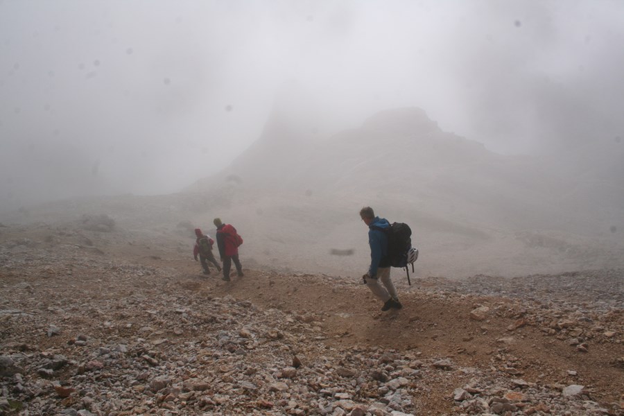 Montag 22.September: Sehr früh wird der Schlaf durch den Spanier gestört, ein unendliches Packen echt Lästig, es gelingt wieder in die Trance zu verfallen. Um 8.15 Uhr, beginnt der Tag, es ist sehr Windig, Wolken ziehen durch, die Temperatur ist in allen Höhen deutlich gefallen, anstatt den schon gewohnten 9 °C sind es nur noch 2°C. Zum Frühstück wird Teewasser bestellt dazu wird bei den meisten die Vesper Box geräumt. Bodo versorgt noch mit Brot, Danke! Wie üblich wird nach dem Frühstück die Rechnung bezahlt, ganz schön heftig 4 € für den Rote Beete Salat! Auch eine Besonderheit auf den Slowenischen Hütte die Tax von 2,51 € pro Tag, die Rechnung selber belief sich auf 232,55 €. Einen genauen Plan über eine Tour für den nächsten Tag, gibt es noch nicht, da die Unterlagen hierfür im Wagen liegen. Unser Ziel ist der Abstieg über den Dom Planika und Dom Koca de Dolicu, etwas Aufwendiger als über den Prag Weg, doch interessierte die Umrundung des Triglav sehr. Wir warten noch ein wenig ab, in der Hoffnung auf etwas bessere Bedingungen, laut Wetterbericht sollte es wohl noch kühler werden. Am Triglav sind Bergsteiger auszumachen schier unglaublich, diese sind sicherlich von der Stanika Hütte gestartet. In fast schon Winterlichem Gewand finden wir uns vor der Hütte ein. 10.15 Uhr, Wolken ziehen das Tal hoch, rein in die „Suppe „eine Richtige Autobahn die über verschiedene Wege in das Tal führen, die meisten steigen hier auf, der wohl einfachste und kürzeste Weg in dieses kleine Berg Paradies! bis zur ersten Weggabelung, dann geht es Rechts in Westlicher Richtung, erstmals in schottrigen Gelände Bergan, die Sicht wird deutlich besser, es scheint das Tief sei durch gezogen, eine gesicherte Stelle, der Übergang zur Planika Hütte ist in knapp 30 Minuten geschafft. Schön gelegen auf einer etwas geschützten Anhöhe, wäre wohl eine Übernachtung Wert gewesen. Schon nach wenigen Momenten wird der Triglav Sichtbar, einige Personen befinden sich im noch unteren Bereich im Anstieg über die Sonnige Südflanke, Sicherlich ein nicht weniger Reizvoller Aufstieg, der Graue Kalkfels besticht durch eine gewisse Schönheit.