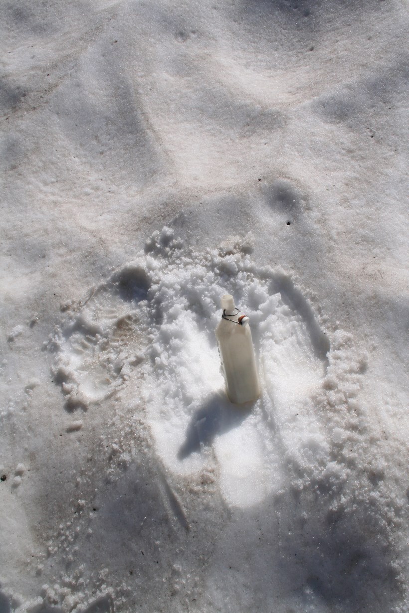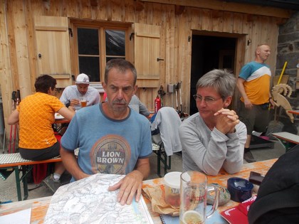 Jetzt im Abstieg steigen wir soweit wie möglich mit den Steigeisen auf Eis und Schnee ab, die Erfahrenen sind dabei klar im Vorteil. Ein Blick zum Himmel könnte die Wettermeldung bestätigen, die Bewölkung nimmt zu. An einem ersten fließenden Wasser gilt es den Durst mit dem frischen Schmelzwasser zu befriedigen, wie bescheiden kann der Mensch doch sein! Kurz nach 14 Uhr, zurück am Ausgangspunkt. ! 10,48 Km Wegstrecke bei etwas über 900 Metern im Aufstieg. Lager beziehen, kleine Wäsche, 1 L Wasser verdünnt gegen den Durst, danach etwas Relaxen, nach und nach zeigt sich ein jeder im Lager. Die erste Euphorie passieren lassen. Vespern auf der gut besuchten Terrasse, obwohl es Südlich Stark bewölkt ist, findet die Sonne fast ständig denn Kontakt, es ist Unglaublich! Auffällig der einzige Raucher der sich unter uns Öffentlich zeigt ist Dani. Jürgen fühlt sich nicht so gut zieht sich zurück, es beginnt ein gemütlicher Umtrunk, wobei uns eine Frau die ein Foto von uns oben ohne knipsen darf, Spaßig als „Nudisten Verein“ bezeichnet. Gegen später wird ein Gruppenfoto mit dem Hüttenschild der Breslauer Hütte geknipst. Nachdem es kühler wird verlagert sich das geschehen in das Innere. Unterhalte mich mit dem Hüttenwirt sein Unmut fällt auf die Wetterberichte die sehr oft negativ ausgefallen sind, obwohl meist kein Tropfen vom Himmel gefallen ist, sehr viele Gäste sind fern geblieben. Das AV Essen besteht aus Reis und Gemüse mit dem kleingeschnitten Schweinebraten vom Vortag, nennt sich dann Reispfanne kostet 8 € und war Ok. So manch Bier wird in lockerer Runde wohl Ungewollt getrunken, die üblichen Verdächtigen sind standfest bis um 23 Uhr. Im Lager beschwert sich jemand das das Licht noch brennt, keiner fühlt sich dafür verantwortlich, Christian nimmt sich der Sache an, findet aber nicht den Schalter, kurzer Hand öffnet er mit dem Taschenmesser das Gehäuse, schraubt die Birne heraus, versehentlich fällt ihm die Schale mit einem Dumpfen Schlag zu Boden, Köstlich weil Genial gelöst.