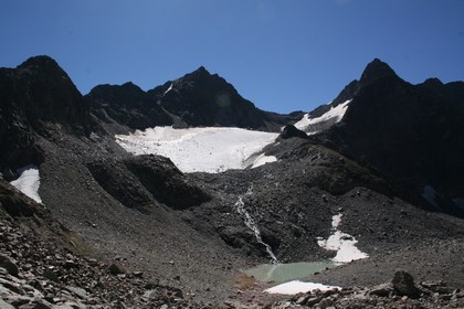 Donnerstag 6.August: Um 7 Uhr, ist der Schlafraum schon verwaist, beim Öffnen des Fensters fällt dieses aus dem Rahmen, Geistesgegenwärtig gelingt es einen Einschlag zu verhindern ui ui! Glück gehabt. Nur noch wenige Personen halten sich beim Frühstück auf. 13 °C und das beim Start um 8.10 Uhr. Ein erster Hinweis Nahe der Hütte zum Ölgrubenjoch weißt in die Falsche Richtung, gehen einige Meter auf der Gletscherstraße in Richtung Gepatsch Alm, kann doch nicht sein, das Ziel liegt Östlich, ein Blick in die Karte bestätigt die Meinung. Das Ganze noch im Schatten der Hohen Berge kehrt. Ein gut angelegter Steig führt die ersten 300 Höhenmeter durch eine Farbenprächtige und Reichhaltige Flora. Wie so oft lohnt ein Blick zurück auf das geleistete und die Schönheit dieser Berge. Jeder Schritt bedeutet wohl Arbeit, doch auch Genuss wenn auch dies manch einer nicht verstehen kann. Auch hier weiden in größerer Höhe wieder Kühe. Der Aufstieg ähnelt dem des Vortages, zwischen Imposanten Gipfel die auf ihrer Nordseite vergletschert sind, erfolgt der anstrengende Aufstieg und dies ohne Trinkwasser, waren es die zwei kleinen Seen die eine Reaktion auslösten? Jens bekommt das in Form von Krämpfen in der Beinmuskulatur zu spüren, während er sich an einem Apfel stärkt, versuche ich Schnee in die Trinkflasche zu stopfen, klappt zwar ganz gut, wird aber wohl einiges an Zeit benötigen bis es zu Trinkbarer Flüssigkeit werden wird, obwohl es Wolkenlos ist, doch auf 2800 m herrschen gemäßigte Temperaturen. Die Weg Führung verblüfft völlig, es geht Links Nördlich, über und durch Grau Braune Gneis Platten. Noch im Aufstieg wechselt die Richtung Südlich. Es folgt eine Überraschung an der nächsten, zuerst wird ein See Rechts unterhalb Sichtbar, danach ein Oho Effekt, zwei Hängegletscher liegen unmittelbar aber getrennt voneinander an der Hinteren Ölgrubenspitze, der Östliche mit seinen 30 Meter Höhe, mündet in einen mit Eis überzogenen See, das Ganze wirkt wie ein Fjord. Das Ölgrubenjoch 3050 m, der wohl schönste Übergang der Tour ist um 11.20 Uhr erreicht, es liegt zwischen der Vorderen 3456 m und der Hinteren Ölgrubenspitze 3296 m. Jetzt und hier öffnet sich der Blick bei bester Fernsicht auf mehrere Große Berge der Ötztaler Alpen u.a. Wildspitze mit ihren Schnee und Eis Panzern. Zwei Wanderer legen gerade eine Pause ein, auf die Frage ob eine Frau hier vorbei gekommen ist, folgt ein ja, vor ca. 10 Minuten, Sie war nur kurz hier um einige Bilder zu knipsen. Weitere Alpinisten die am Taschachhaus gestartet sind gesellen sich dazu, mal was Neues Personen zu begegnen. Schokolade und ein Mars als Stärkung.