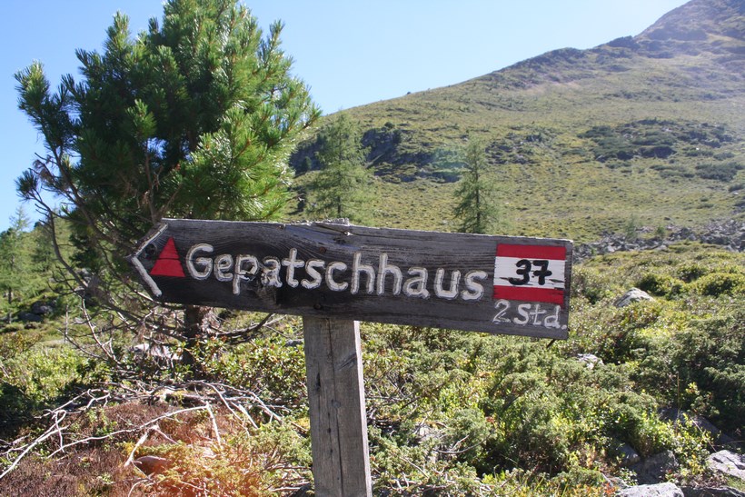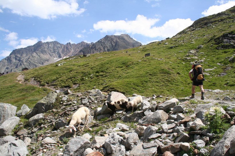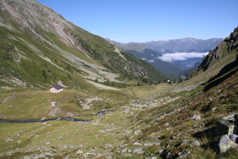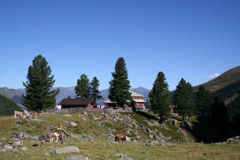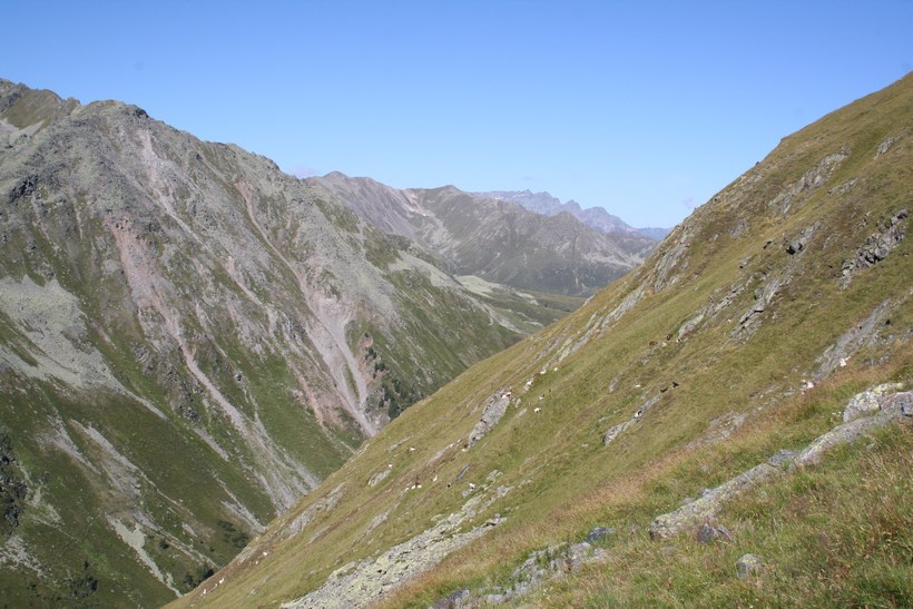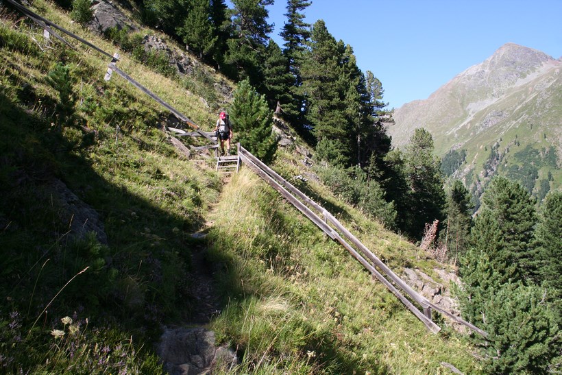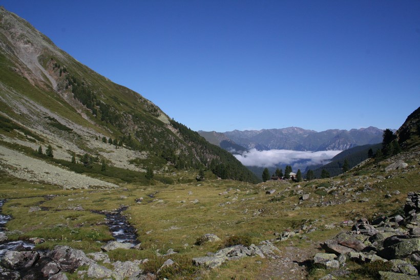 Dienstag 4.August: Ein langer Tag steht an, schon um 7 Uhr, geht es ein Stock tiefer zum Frühstück, einen Liter Teewasser gibt es umsonst, Weißbrot, Honig, Butter, Wurst, Tomaten ein Reichhaltiges Essen aus dem Rucksack. Beim Abgeben der Tassen kommt mit dem „Chef“ in der Küche eine Informative Unterhaltung zu Stande, die Hütte ist in den letzten Jahren von der Bergbahn Modernisiert worden, in der Ski Saison gehen am Tag bis zu 2000 Essen über die Theke alles ist Elektronisch und vom Modernsten ausgestattet, er würde gern Kochen doch die Gerichte sind vorgegeben und schnell zum Zubereiten. Mit einem Herzlichen Dankeschön beginnt um 8 Uhr, wieder ein Neues Abenteuer, So einfach Querfeldein absteigen geht schief, zurück zur Straße der bis zur Station Alezjoch gefolgt wird. Nach kurzer Suche wird die Spur gefunden, vorbei an der Hütte mit einer geöffneten Türe ( diesen Auf und Abstieg benützen nur wenige)des Senners der kurz davor mit dem Hund begegnete, auf der Weidefläche ist es Morastig und Tief Markierte Steine ein Nützlicher Hinweis, mit lautem Getöse stürzt der Masnerbach über eine größere Länge in die Tiefe, der Weg aber läuft erstmals Quer an der Flanke des Schafbergs, das Tal verengt sich es ist Nass und teilweise auch Tief, gesicherte Passagen mit einem Fesselnden Tiefblick. Von einem Moment zum anderen Öffnet sich das Faszinierende Tal, einfach schön und das an einem Tag mit Traumwetter und den Temperaturen die weit über dem Durchschnitt liegen. Hier beginnt die Baumgrenze die deutlich höher liegt als zu Beginn der Tour klar die Bergwoche verläuft die ersten Tage in Südlicher Richtung. Ein Platz zum Verweilen und genießen doch es ist noch lange nicht Schluss, etwas tiefer auf einer nächsten kleinen Hochfläche ist eine Hütte auszumachen, in der Ferne strahlen die Ötztaler Alpen mit dem Geigenkamm, dort wird der Tag irgendwo enden. Ein Jäger der mit seinem Hund von rechts wie aus dem nichts erscheint, der Hund bellt als wollte jemand Böses tun, wird gegrüßt und eine Frage gestellt, ob er von der Jagd kommt? gibt es hier überhaupt Wild, ja aber eher wenig! Anmerkung in diesen 10 Tagen hatten wir nicht eine Gemse oder Steinbock gesehen, hie und da Murmeltiere, auch wenig Großvögel Raben oder Krähen