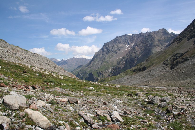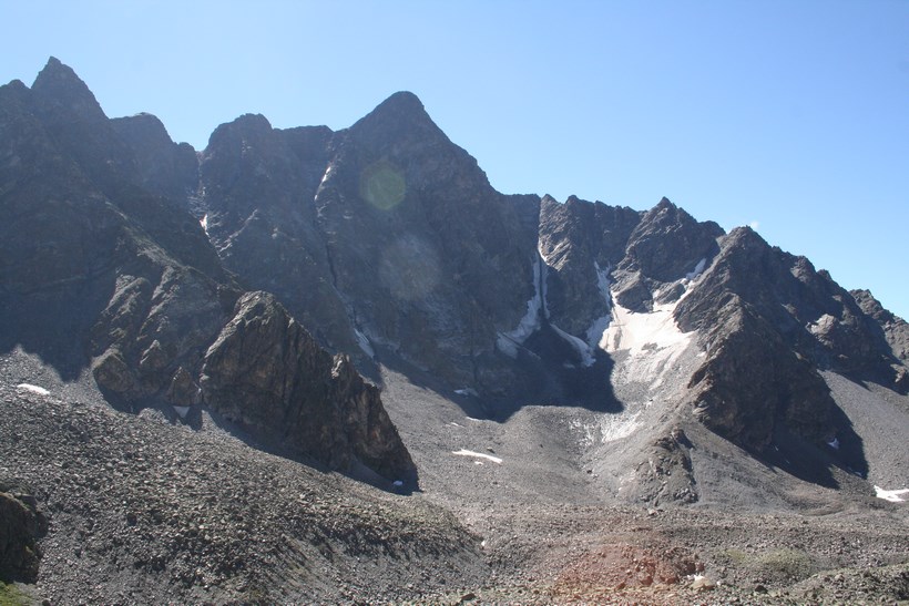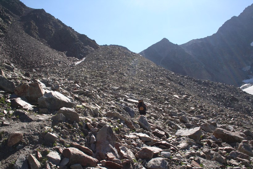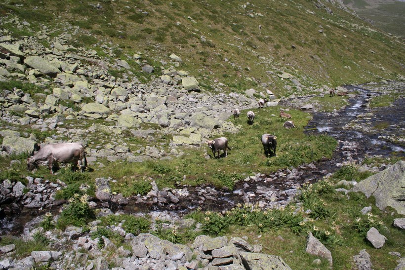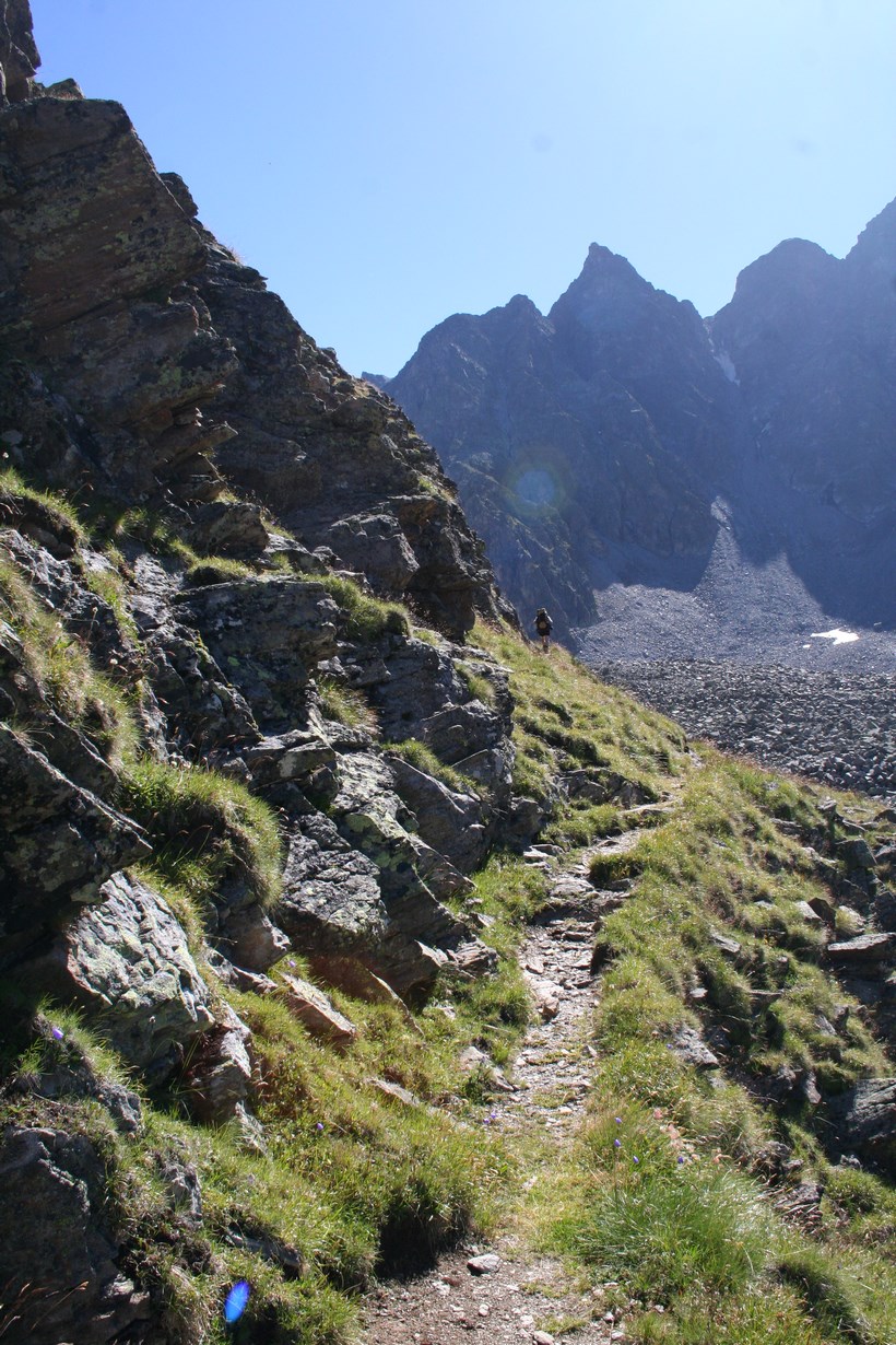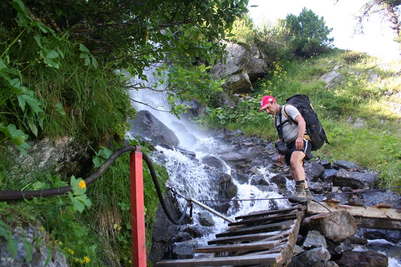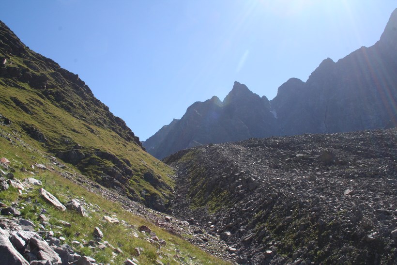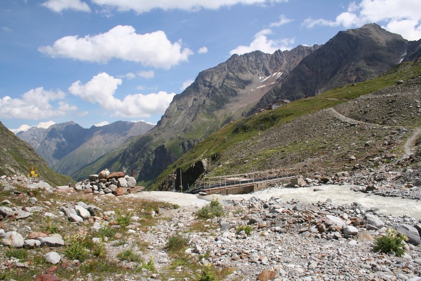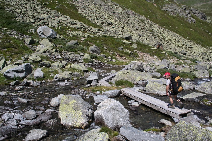 Schon nach wenigen Metern Abstieg wird das Taschachhaus 2434 m, Sichtbar, doch ist es nicht das Ziel, Mitte Juni war kein Lagerplatz mehr Verfügbar. Der Weg leitet direkt auf einen Senkrechten Abbruch zu, über oder besser gesagt durch eine Anspruchsvolle Wand verläuft die Route, etwas Oberhalb Simulieren einige Personen den Sturz in einem etwas steileren Schneefeld, das Schmelzwasser ideal um die Wasserflasche zu befüllen. Der Abstieg geht in einfaches Terrain mit Fels Blöcken über, es fehlt nicht mehr an Wasser. Oberhalb eines weiteren Sees 2849 m, zieren unzählige Mannshohe Steinmännchen diesen schönen Ort. Mit jedem Meter des Abstiegs wird es Bunter, die Pflanzen finden hier Erdreich zum Überleben. Constanze wird ausgemacht, es hat von weitem den Anschein das Sie im Sexegertenbach fischt… Dort angekommen entpuppt sich dieser Ort wie eine verfallene Behausung. Das Fischen stellte sich als ausziehen des Schuhwerks heraus, wollte keine Nasse Bergstiefel, was für manche ein Problem ist… einige Meter am Bach entlang gehen, es findet sich so gut wie immer eine geeignete Stelle zum Überqueren. Etwas Oberhalb der Hütte führt eine kleine Brücke über den wilden und rauschenden Sexegertenbach, eine breite Führe steigt erstmal etwas an, die letzten Meter führen durch Privatbesitz vorbei an Schafen direkt zu einem der Großen Alpinen Stützpunkte und Alpines Ausbildungscentrum. Einige Polizei Beamte begrüßen uns, nicht das jetzt jemand etwas Falsches denkt.