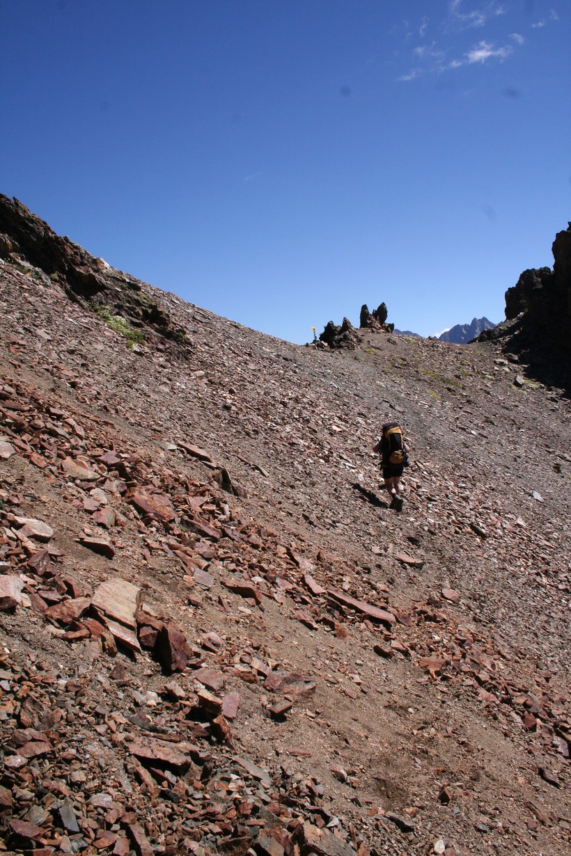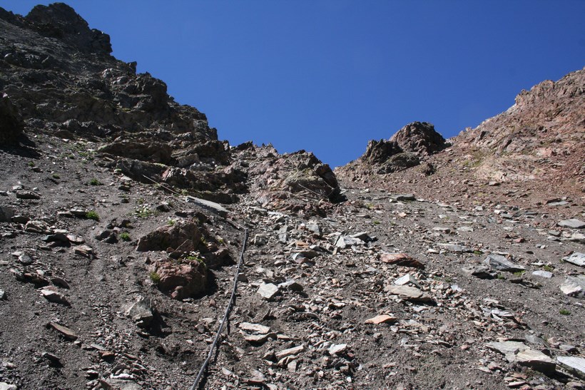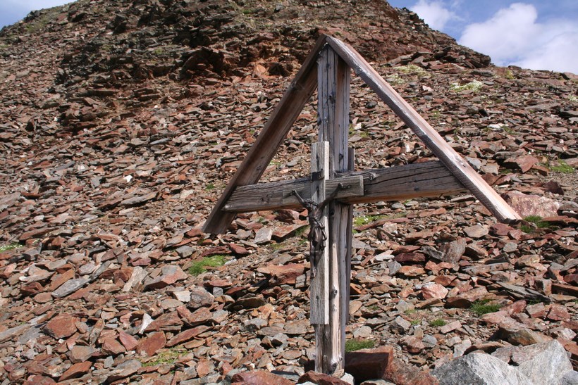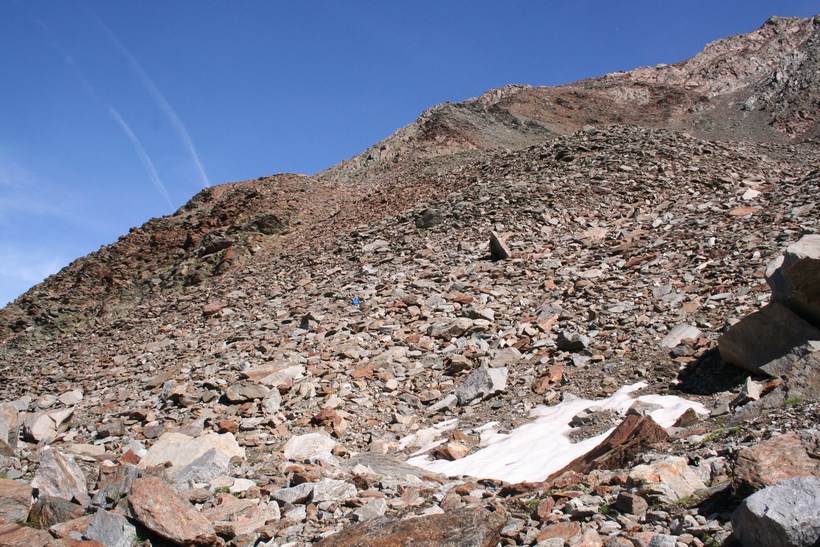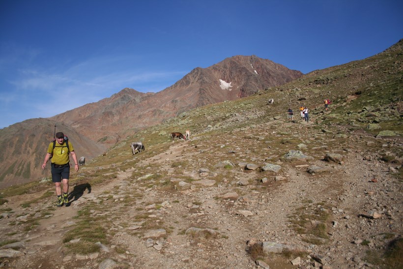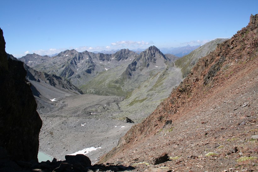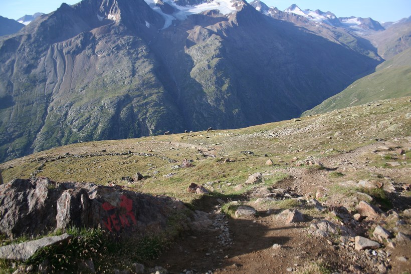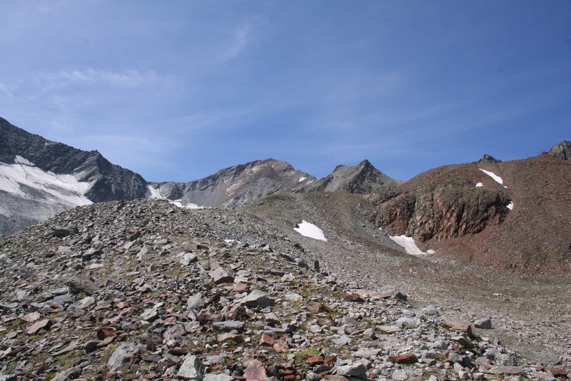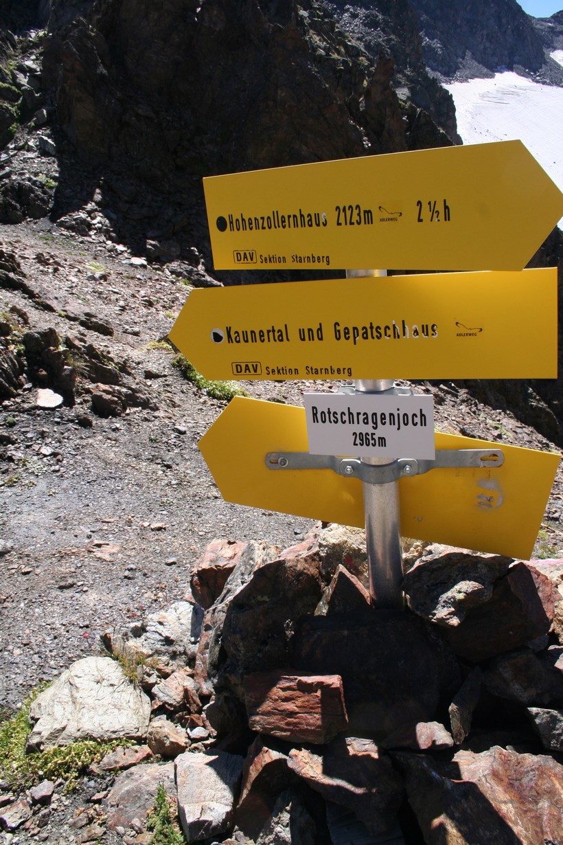 Mittwoch 5.August: Wissend des Wetters, lässt es sich bis um 8.15 Uhr, ganz gut ruhen. Durch das geöffnete Fenster grüßt der Neue Tag, es ist Windig und Kühl. Die älteren Herrschaften sitzen noch beim Frühstück, unterhalten sich intensiv. 1 Liter Teewasser für 3 € wird Serviert. Die Rechnung für Kost und Loggia begleichen. 2 Ruß, 4 Weissbier a 3,80 € Übernachtung Sensationelle 7 €, dazu das AV Essen für 8 €. Die Wirtsleute sind im ersten Jahr hier, davor betrieben sie mit Freunden eine Alm samt dazugehöriger Sennerei. Es ist 9.30 Uhr, als wir uns von netten Menschen wohl für immer verabschieden. Das Tief hatte sich ebenfalls verabschiedet, lies aber noch kühle Temperaturen und den unangenehmen Wind hier. Eine im Tal hängende Wolke blieb ebenfalls zurück. Kaum ist das Grundstück verlassen, der erste Kontakt mit den weideten Kühen mit ihrem Gebimmel, der fast vom Getöse des Wilden Radurschl Baches übertönt wird. Diese zweite Ebene des Radurschl Tales erstreckt sich noch ein gehöriges Stück in die Tiefe, endet an einer Bergkette deren Gipfel über der 3000 Meter Marke Hoch liegen. Viele Touren Möglichkeiten bieten sich an, doch hier ist die Menschheit noch nicht angekommen. Für uns heißt es an einer Weg Gabelung Links ab zum Rotschragenjoch. Einige Ziegen und Kühe ja auch ein Frosch begegnen, im Anfangs steilen Aufstieg durch die Grasigen Hänge des Hütttales. Eine steilere Wand teils Seil-versichert wird gequert, danach öffnet sich ein Tal das vom Glockturm dem Hausberg der Hütte 3335 m überragt wird. Tief unter dem Wanderweg verläuft der Überleitungsstollen des Gepatsch Stausees. Über bemooste Stein Platten steigt es leicht an. Auf 2700 m lässt es sich in der Sonne „Oben ohne“ ganz gut aushalten. In einem leichten Rechts Bogen naht der Aufstieg zum Joch, der kleine Hellblaue Gebirgssee liegt schon etlich tiefer, nicht wie vermutet durch eine Geröllrinne, ne in leichter Kletterei Links davon bis auf Höhe des Rotschragenjochs, dann ca. 20 Meter quer, Seil-versichert in der Schuttrinne, dann Zick Zack nach Norden bis zum Übergang auf 2965 m, nur wenige Meter tiefer als die Zugspitze! Fantastisch der Blick zurück und in eine bis Dato unbekannte Fleck der Erde dies um 11.59 Uhr!