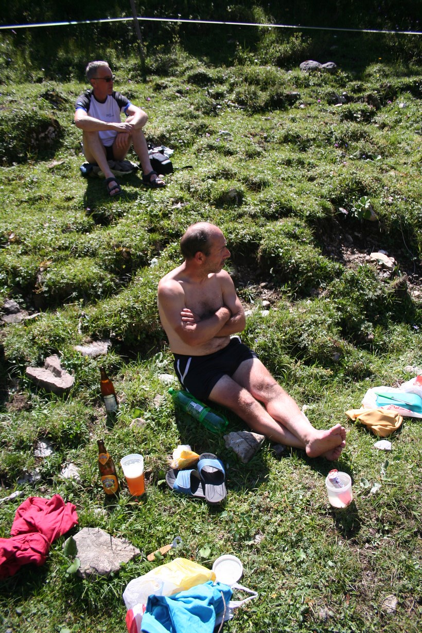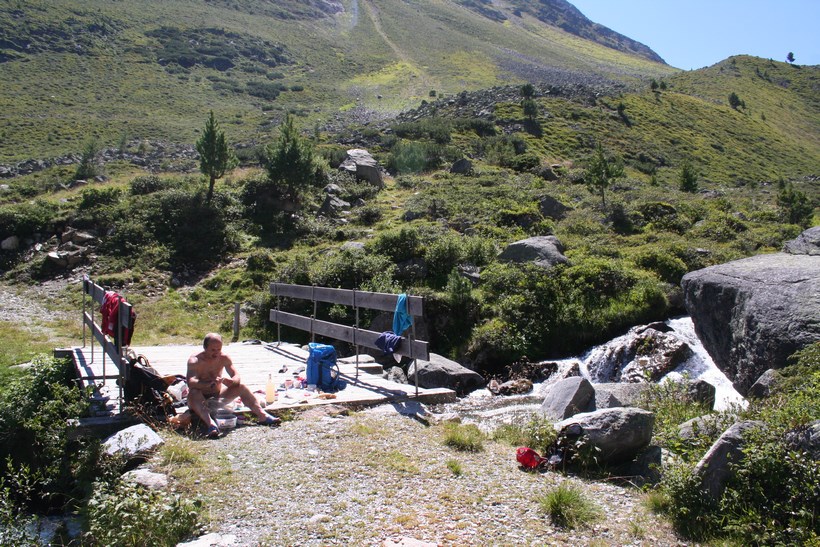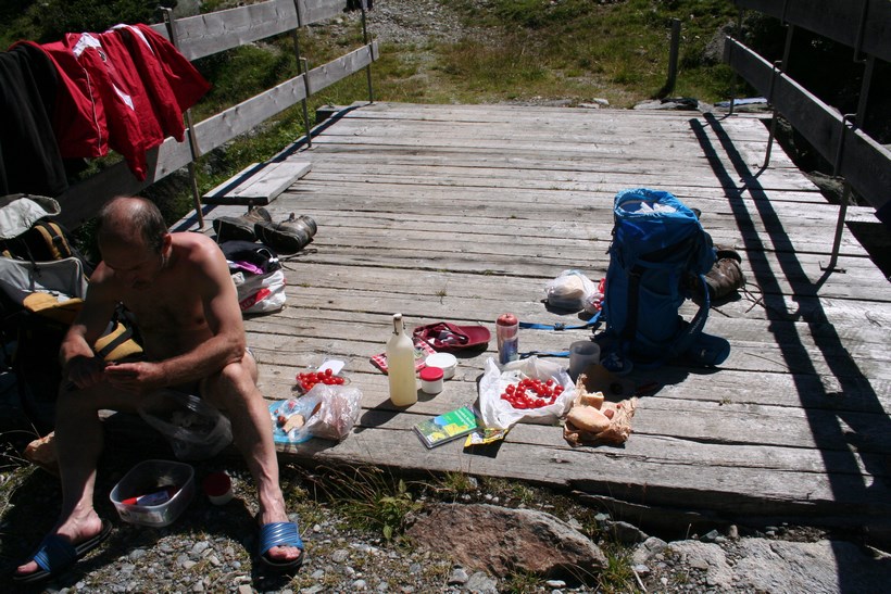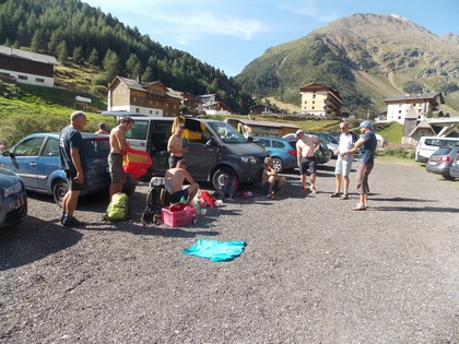 Sonntag 9.August: 7 Uhr, die die abends die Bühne Früh verlassen hatten, scharren schon mit den Hufen, keine Panik das zweite Frühstück bzw. denn Service gibt es erst wieder ab 7.30 Uhr. Wo ist der Lichtschalter, dieses Rätsel will gelöst werden, und tatsächlich findet sich der Schalter, er ist am Kamin der durch das Zimmer führt, versteckt unter Kleider die zum Lüften oder Trocknen aufgehängt worden sind, das konnte nur der Wissen der in getätigt hatte. Gemeinsam erfolgt das Frühstück, auffällig viele Gäste sind in der Hütte, die Mehrheit interessiert sich wahrscheinlich nicht für Tirols höchsten Gipfel, obwohl es von hier der bequemste Zustieg ist. Gemütliches Packen. Um 8 Uhr, finden sich alle 10 ein. Es ist Traumwetter bei 11°C. Die Stimmung absolut Locker, jetzt im Abstieg ein anderes Bild, der ein oder andere hat Kummer mit den Knien, wobei Jürgen und Nobbe am stärksten betroffen sind, kurz vor dem Erreichen des Ziels, knickt Nobbe ein und stürzt, zum Glück geht die Sache glimpflich aus. Es ist 9.30 Uhr, das Fahrzeug ist erreicht. Beim Öffnen der Heckklappe ein staunen hängt doch glatt eine Weiß Bierflasche Waagrecht in der Luft, diese ist wohl umgefallen, die Sonnenstrahlen wirkten wie ein Brennglas, hat den Teppich aufgeschmolzen und dieser mit der Flasche verbunden. Ein Hefezopf von Melanie wird angeschnitten, der ein oder andere Gönnt sich ein Kaltes Bier, Jürgen ist mittlerweile mit einem PKW vorgefahren, Reihum Frage ich die Jungs wegen einer Klettersteigtour im Ötztal, zum Bedauern fällt die Entscheidung zum Nein, Olaf ist darüber enttäuscht. Alternativ werden wir auf der Heimfahrt einen Gebirgsbach aufsuchen. Ein Stopp in Sölden an einer Tanke, unser Raucher benötigt Nahrung, grrrr. Ganz schön Verkehr auf den Straßen, gleich nach Sölden sind die Wegelagerer mit einer Radarkamera im Einsatz bei so viel Fahrzeugen ist der Verkehrsfluss eher träge. Auf der Suche nach einen Bäckerei gibt es nur ein kleines Erfolgserlebnis, nur noch eine kleine Auswahl. Die Suche nach einem geeigneten Platz zum Waschen verläuft Negativ, Olaf hat einen Geistesblitz, Hahntennjoch! Da es sich am Fernpass wegen Blockabfertigung staut, ist das eine Top Idee. Je tiefer die Fahrt geht desto höher die Temperatur, ja es ist ungewohnt Heiß, sind wir ja schon ein paar Tage nicht mehr unter 1000 Meter gekommen. Kurz nach Imst geht zweigt es in das Lechtal ab, die Straße führt über das Hahntennjoch Einige Kilometer nach der Passhöhe fliest wieder Wasser an der Oberfläche, in einer Scharfen Linkskurve besteht Parkmöglichkeit 1670 m, der ein oder andere schaut ganz unglaublich ob dies der geeignete Ort im Pfafflartal ist, ohne viel zu reden schnappe ich die Bierkiste, stelle sie weiter oben in das Glasklare Wasser. Nach und nach wird dieser schöne Platz so richtig angenommen.
