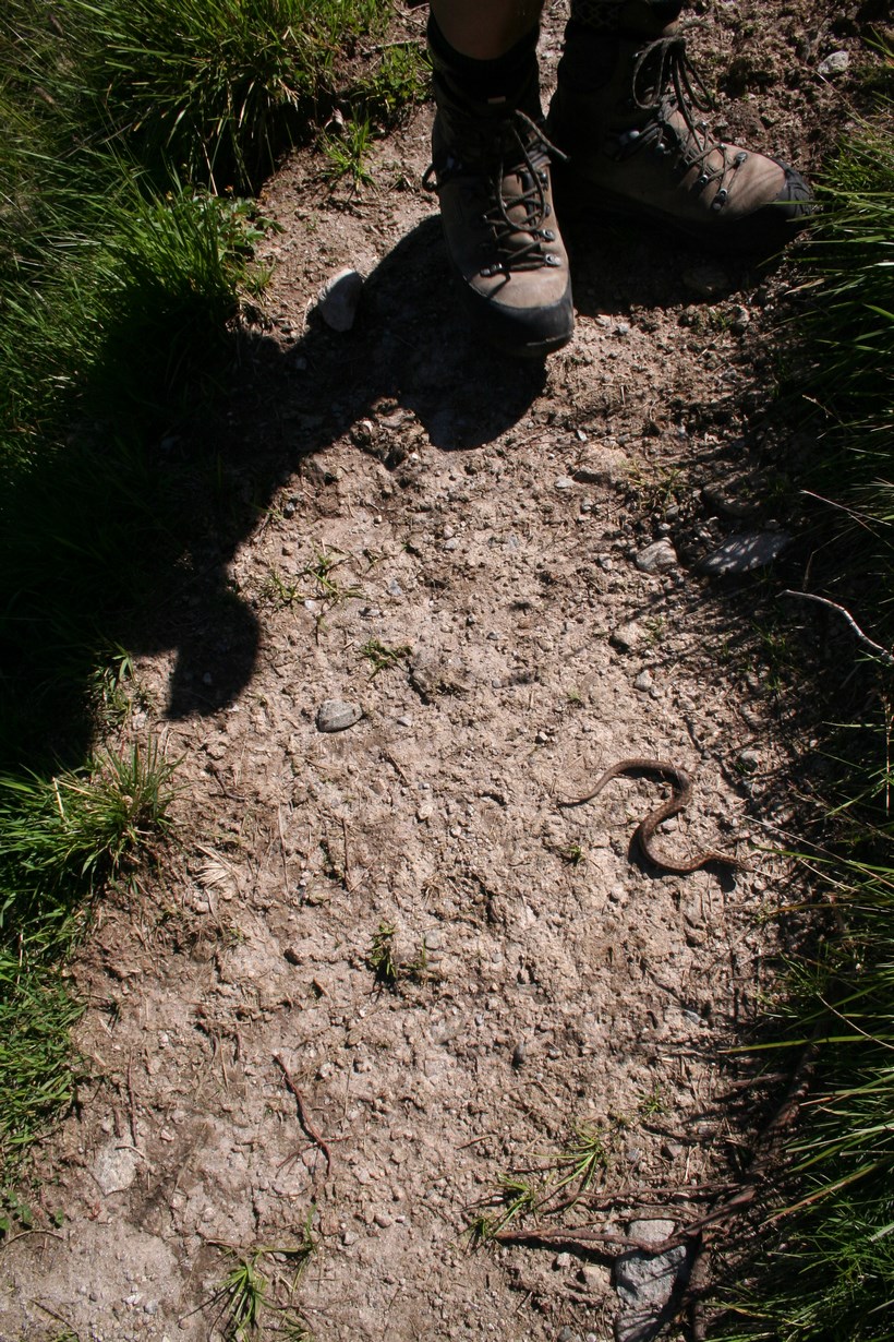 Montag 3.August: Gleich beim Aufstehen eine Überraschung, Jens findet im Gepäck den Griff meines Schirmes, den ich einen Tag zuvor vergebens auf der Darmstädter Hütte wie die „Stecknadel im Heuhaufen“ gesucht hatte. Während des Frühstücks 8 Uhr, erzählt die Hüttenwirtin über ein ganz schlechtes Bergjahr 2014, nur 12 Tage konnte von richtig gutem Wetter gesprochen werden, jetzt Anfang August ein ganz anderes Bild. Heute geht es zeitig ab, der Bus in St.Ulrich Fährt um 10.43 Uhr, gut zwei Stunden für den fast direkten Abstieg sollten gut zu Schafen sein. Eine Besonderheit hier ist der Material Lift, im Prinzip sind es zwei, vom Bergrücken der Oberhalb liegt, wird das Material mit einem zweiten 400 nach Unten Transportiert. Oben angekommen ist der Freund der Chefin gerade dabei Lebensmittel von einer Anlage in die andere zu verlagern, da es wohl einmalig ist befrage ich in diesbezüglich, ja es ist sehr aufwendig, die Sektion zeigt sich willig dies zu ändern erst letzte Woche war ein Vertreter hier um über die Situation zu reden, eine Neuanlage kostet 400.000 € Alternativ wäre die Straße die nicht weit entfernt liegt auszubauen, die Kosten würden bei 100.000 € liegen + 35.000 um die Straße komplett zu sanieren. Wetten das in den nächsten Jahren die Hütte mit dem PKW erreicht wird. Wie lange benötigen wir für den Abstieg? 1 ½ Std. bei strammer Geh Weise, angegeben sind 2 ½ Std. passt. Die ungetrübte Sonne in Verbindung mit dem Abstieg sorgt sehr schnell für Wärme von außen wie von innen. Ein Gipfel am anderen Reiht sich südlich am Horizont ohne jeglichen Dunst. Ein großes Schneefeld wird passiert, der Weg führt wie in einer Rinne am tiefsten Punkt dem Alschnerbach der im Moment kein Wasser führt. Eine Bank mit guter Aussicht in das Paznauntal lädt zum Verweilen ein, irgendwie vergessen wir die Zeit, beobachten die Kleinlebewesen wie Schmetterlinge Ameisen und was sich sonst so bewegt. Nebenbei trocknet das T-Shirt ungewollt. Es hätte locker ein Bus früher gereicht. Jetzt aber Los sonst wird es eng. Ein Gewaltiger Ameisenhaufen zwingt zum Stopp, eine Betriebsamkeit wie es sich ein Arbeitgeber wohl gerne wünschen würde…noch 20 m Meter weiter sind die emsigen Grabler beim Transport oder auf dem Weg. Ein schöner Abstieg führt durch denn Fichten Wald.