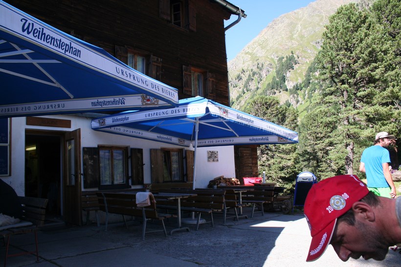 Es scheint ein jeder hat es Eilig, Gönne mir noch ein Edel Pils. Gemeinsam mit Jens und Olaf starten wir um 16 Uhr, mit jetzt schwerem Gepäck . Schon nach wenigen Metern treten bei Jens Zweifel über diesen Anstieg von 900 HM, können ihn überreden mit dem Lift die erste Etappe auf Stablein 2396 m, zu bewältigen. Exakt um 16.29 Uhr, schwebt er an uns vorbei, mittlerer Weile flacht es etwas ab, nach einer Stunde beginnt der „Neue“ Bergstiefel an der Ferse zu drücken auch Mecki tappt nun eine Druckstelle. Das Tagesziel ist sichtbar, Bodo und Christian werden eingeholt. Vor dem Rofenbach ist es ein Stück Eben, danach der kräftezehrende Hüttenanstieg. 18.10 Uhr, endet die Härteste Etappe seit Jahren, allein der Anstieg Heute über 2200 HM. Jürgen und Dani dürfen begrüßt werden, mit Daniel gab es nur einmal Kontakt in den Bergen, Jürgen beteiligt sich meist einmal im Jahr und evtl. beim Hüttenabend. Die beiden sind über das Wilde Männle 3019 m, aufgestiegen. Es wird richtig Spaßig, als Wurle erzählt das plötzlich Jens vor ihm geht, wie kann das sein das ein Großer Bergläufer überholt wird. Das Gelächter vieler galt einer Kuh, als sie sich auf der Hüttenterrasse so richtig zuhause fühlt, ließ sich auch nicht abdrängen, sie kaut an einem Socken, der zum Trocknen und Lüften im Freien lag, Genussvoll kaute sie diesen, um ihn dann im Gaumen verschwinden zulassen. Wenig später spuckte sie ihn gelöchert wieder aus