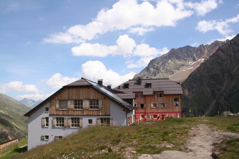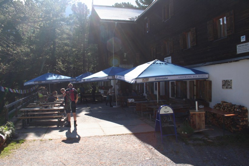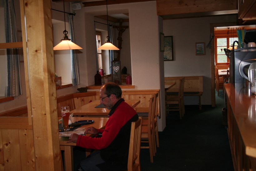 Direkt am Hang über dem die Hütte Thront, zweigt der Zustieg "Rechts" steil ab, ein letztes Mobilisieren, die Moral setzt nochmals Kräfte und Wille Frei. 17.20 Uhr, rein in die Warme und trockene Stube auf 2384 m. Schon der Eingangsbereich erfreut, richtig Urig und Rustikal, alles in Holz gehalten. Eine Bank eignet sich doch bestens zum Ausziehen der Schuhe, die eigenen Hüttenschuhe sitzen doch am besten! An der Theke empfängt uns der Chef Persönlich, stellt sich gleich beim Namen vor „Andi“ Zimmerlager 1 im ersten Stock, da sind zwei Betten Reserviert! Prima! Mit wenigen Handgriffen ist das Lager für die Nacht vorbereitet, der Rucksack wird neben dem Doppelstock Bett geparkt. Im Nebenzimmer findet sich noch ein Platz an einem Größeren Tisch. Sehr viele Kinder befinden sich am Nachbar Tisch, scheint eine Freizeit Gruppe zu sein. Wie überhaupt sind viele Familien Anwesend, kein Klassischer Bergsteiger Stützpunkt, aber ein Guter Übergang und gut Besuchtes Domizil. Jens bestellt wie die meisten Spagetti, ein Schweinebraten mit einem Knödel dazu Kraut, etwas Deftiges nach einem Anspruchsvollen Tag. Es dauert zwar etwas, doch die Qualität und Quantität ist sehr gut. Wie schön ruhig es doch beim Essen zugehen kann. Ein Paar aus Darmstadt und eine Junge Familie mit ihrem Lebhaften Kind 3 Jahre, sitzen am Tisch. Rechtzeitig zum Essen finden sich noch zwei Männer so um die 35 ein, einer der beiden ist Lieferant für den Wein, ihr Fahrzeug parkt unten am Stausee, den beiden war es wohl Langweilig. Die Beine baumelten etwas Müde unter dem Tisch, doch die Sinne Hellwach. 22.30 Uhr, Zeit zu gehen! Der Schlaf in dieser Nacht war so tief, hätten nicht bemerkt dass es die ganze Zeit geregnet hatte, wenn es uns nicht erzählt worden wäre.