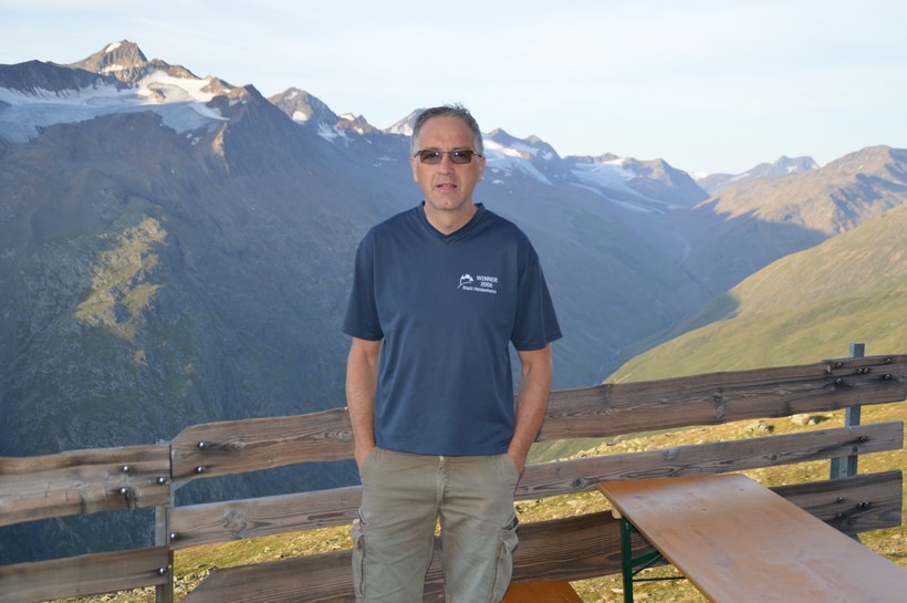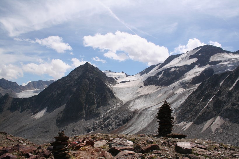 Freitag 7.August: 4 Minuten vor Sechs klingelt die innere Uhr, kurz später informiert der „Nachbar“ es sei 6 Uhr. Ein paar Zeiger Umdrehungen später sind wir unten im gut eingerichteten Nebenzimmer, wo das Teewasser in einer Thermoskanne bereit steht, der Hauptraum ist noch verschlossen. Zwei Teebeutel verschwinden im Dampfenden Hals der Kanne. Auf der Terrasse bietet sich ein Toller Blick zum Karlesferner auch die Braunschweiger Hütte ist Links davon am Grat zu erkennen. Toiletten Gang, danach ein kurzes Frühstück: Brot Butter Wurst. Es ist kurz vor 7 Uhr, als die Türe in das Schloss fällt. Es ist Windstill und bewölkt bei gefühlten 16°C, Außer den Tieren auf der Weide ist keine Menschen Seele der diese fast Natürliche Ruhe stört. Der Abstieg über die Skipiste mit der Liftanlage wird dem Monotonen gehen auf der Schotterstraße vorgezogen, es ist so Steil das Jens schon sehr bald Probleme mit den Knien bekommt, ein ganz schlechtes Zeichen für einen Bergsteiger, sind diese doch Voraussetzung für diesen anspruchsvollen Sport. Wenig später wird der Straße den Vorzug gegeben. In einem großen Bogen erfolgt der Abstieg der Wilde Seebach bleibt immer Links, wird erst kurz vor der modernen bewirteten Taschach Alm 1796 m, die einzige Alm und Berg Käse Sennerei im Pitztal, mittels Brücke überquert. (Über 1000 Tiere gehören zu diesem Betrieb) kein Wunder weshalb gestern so viele Rinder zu sehen waren. Ein zweites Mal wird der Bach gequert, doch jetzt ist das Bach Bett verwaist wird Oberhalb Aufgestaut und für ein kleines Wasserkraftwerk genutzt. Ein kleiner Wanderweg (924) zweigt Rechts ab, leitet über Bunte Wiesen und Niederholz nach Mittelberg 1740 m, Ausgangs Punkt für Wanderungen und Gletschertouren. Hier gilt es an einem kleinen Zufluss zur Pitze genügend Wasser mit Multivitamin oder das Sprim aus Chile zu trinken, nach dem Motto „Was zu viel ist gibt der Körper wieder frei“. Während dieser Tour ist diese so wichtige Erkenntnis endlich entstanden. Die Gletscher Stube bleibt ebenso Links liegen wie der Materialift an dem ein Weinhändler seine Kostbarkeiten verlädt Möglichkeit des Rucksack Transport (Ausbildung Eiskurs Anfang der 90 er Jahre), Jägersteig oder Normalweg in diesem Fall die „Autobahn“ der Normalweg (E5). Vorbei an den Klettersteig Einstiegen des Pitztaler Klettersteig Park Donnert die Pitze über mehrere Stufen in Tiefe hie und da bläst der Wind winzige zerstäubte Wassertropfen durch die Luft, ganz angenehm, wer steht wie aus dem nichts vor uns? Constanze, Sie ist wohl sehr früh gestartet, ein kurzer Small Talk, sie ist gut drauf alles ist bestens. Auf einigen Metern verläuft der E 5 auf der Straße die für den Ausbau der Bergstation am Mittelbergferner errichtet wurde und die Landschaft auf das übelste Verschandelt, einige Fahrzeuge wie Bagger Betonmischer und Transportfahrzeuge sind noch immer hier beschäftigt. Alsbald liegt die entfernte Riffelsee „tiefer“ es läuft richtig Rund die Steilheit des Aufstiegs quält dein ein oder anderen ziehen locker an den Aufsteigenden vorbei, der Blick zurück lässt die Route im Abstieg ab Ölgrubenjoch Revue passieren. 10.24 Uhr, ist die Braunschweiger Hütte 2759 m, erreicht. Auch hier erfolgte schon im Juni eine Absage auf Reservierung, wäre wohl der Ideale Anstieg zur Wildspitze gewesen. Obwohl die Wolken überwiegen befinden sich viele Menschen auf der Terrasse um etwas Sonne und Freude zu tanken. Je ein Ruß Jens eine Knödel Suppe, die Reste werden verzerrt. Olaf erhält eine SMS „sind in der Zeit“ er ruft zurück, sind etwas später gestartet. Constanze gesellt sich dazu, mittels des Kartenmaterials gibt es ein paar gute Tipps wie sie ihre Alm Nähe Söldens erreicht.