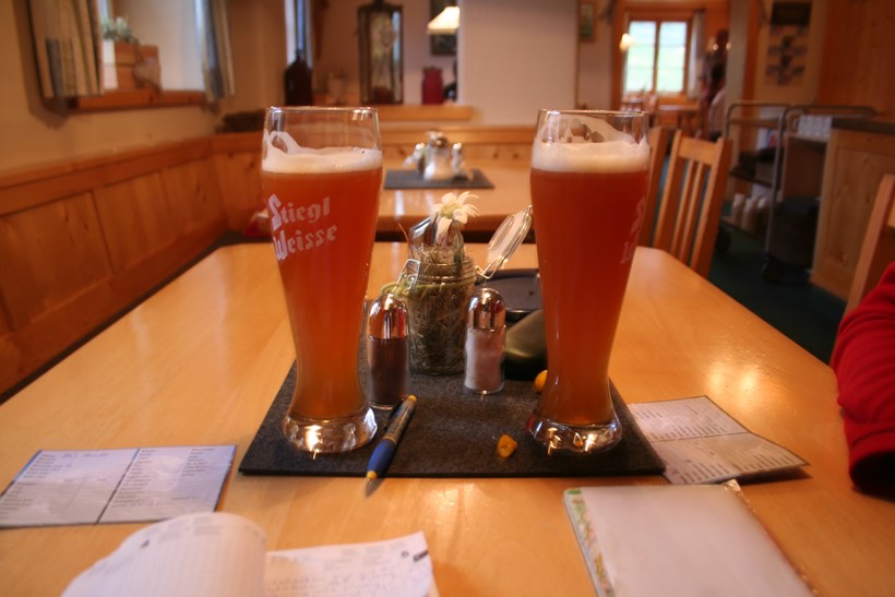 So langsam traut sich ein jeder in das richtig kühle Nass, ich selber genieße eine Komplette Körperwäsche um die Spuren dieser Anspruchsvollen Bergwoche zu beseitigen. Der Stahlblaue Himmel, dazu ein gutes Vesper und ein kühles Bier unter Freunden wohl kaum zu toppen. Zwei zufällig vorbei kommenden Wanderer trauen ihren Augen nicht, als Wurle Mal wieder in Adams Kostüm eine Abkühlung nimmt. Nach 2 Std. Fun und Gaudi sind die Getränke zur Neige gegangen, da wartet Christian mit dem Vorschlag auf, zum Essen in das Gasthaus Adler nach Pfronten, Volltreffer! Für Jens endet die Fahrt in Reutte, werde in von hier nach Pfronten lotsen. Als wir um 15.48 Uhr, ankommen, sitzt der Rest schon in dem schönen Biergarten im Schatten der Bäume, quer durch die Speisekarte werden die Gerichte bestellt, nach 30 Minuten Aufenthalt Serviert das Freundliche und Flinke Personal richtig gute Küche, ein jeder ist mehr als zufrieden. Christians Aussage dass wenn es um das Thema Essen geht, ist er Unschlagbar! ist nicht von der Hand zu weisen.