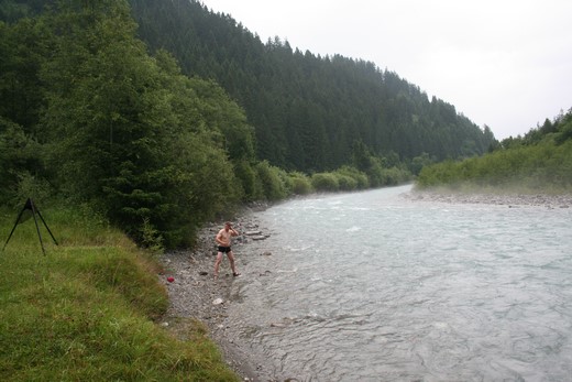 Samstag 9.Juli: Hie und da wurde das Rauschen des Lechs von größeren Regentropfen die auf die Zeltplane fielen übertönt, es wollte nicht so richtig Hell werden, daher auch kein Grund aufzustehen, irgendwann war die Neugier ob der Wettersituation unwiderstehlich, ein paar Bewegungen im Schlafsack zum Eingang, Grau in Grau dazu Feuchtigkeit in Form von Nebel. Ne nicht schön. Das Display der Kamera einschalten, es ist 8.40 Uhr, Grund genug um aufzustehen. Der erste Weg rund 20 Meter zum Auto, Jens war mehr oder weniger Wach, klar erst wenn er aufsteht kann das Fahrzeug beladen werden. Nach und nach wird der Grill und das Zubehör verräumt. WPO weckt denn Körper mit einer Wäsche im Fluss, zu guter Letzt werden Isomatte Schlafsack und das triefend Nasse Zelt verladen. Jens der dabei die Logistik führte, hatte den Wagen Platz gewinnend geladen. Der Regen selber hatte sich gelegt, nur die Regentropfen die von den Bäumen vielen ärgerten ein wenig. 9.30 Uhr, kann die Fahrt bei 15 °C losgehen. Der erste Gedanke Elbigenalp wird verworfen, Ziel ist ein MPreis in Weißenbach an der Abzweigung zum Thannheimertal. Schon während der 30 Minütigen Fahrt entlang  eines Typischen Flusses der dieses Bekannte Tal geformt hatte, hellt es langsam auf. Mehr des Frühstücks wegen galt der Besuch in diesem Discounter, doch das Sortiment lockte zu einem etwas unnötigen Aufenthalt. Kleinigkeiten durchliefen das Fließband. Heiße Schoko dazu eine Schneckennudel, Jens Kaffee mit einem Originellen EM Gepäck, WPO bevorzugte etwas Herzhafter, Leberkäse dazu ein Semmel und Kaffee. Ein Trockener Tisch im Freien wie geschaffen, sehr viele Motorradfahrer waren Unterwegs ein kommen und gehen, wobei sich nach und nach die Tische füllten das Personal war so beschäftigt das ihnen nicht einmal Zeit für die Arbeiten vor der Theke blieb, so war es denn Gästen vorbehalten selber für Ordnung zu Sorgen. Die Toilette ein Segen. Stau am Grenztunnel, Zähfließender Verkehr in Richtung Fernpass die schlechte Nachricht, im Laufe des Tages aufklaren Morgen richtig gut und Heiß Spätnachmittag Gewittergefahr, Montagnachmittag Gewitter mit Temperatur Sturz, diese Vorhersage Motivation Pur. Reutte selber wir immer ein Stopp und Go, auf der Fernpasstraße ein wohl hohes Verkehrsaufkommen aber kein Stillstand. Statt direkt nach Ehrwald ein kleiner Umweg über Biberwier.  Der Parkplatz der Ehrwalder Almbahn mehr als gut belegt, verrückt Freitagmittag um kurz vor 12 Uhr, solch Touristen Ströme. Wasser im Kofferraum? schnell war klar das in der Hülle senkrecht stehende Zelt ist im wahrsten Sinn des Wortes ausgelaufen, sofort wird es inmitten des noch feuchten Parkplatzes aufgestellt. Vorbeilaufende Menschen schauten ungläubig herüber, mehrmaliges drehen  um die eigene Achse, die Sonne Nein die Diffusen Strahlen verrichteten gute Arbeit, das wenig Gepäck für das Steinerne Häusl und eine lockere Vesperpause am Boden sitzend, schnell verging die Zeit. 13.30 Uhr, es wird ernst :) Aufstieg über die Straße oder den Wiesenweg? Entscheidung Straße, klar die Ehrwalder Almbahn hätte auch diesen Part übernommen, doch diese blieb rechts liegen. In lockerer Unterhaltung kann ein Aufstieg teils durch Mischwald und Wiesen zur Nebensache geraten, Fahrradfahrer und Wanderer begegnen ständig, hie und da kann der Aufstieg in den Kurven abgekürzt werden, an einer Wasserstelle tut eine Erfrischung ganz gut. Ein kleiner verhauer kostet ein paar Minuten. Jubel und Trubel auf der verbauten Ehrwalder Alm 1500 m, Konsum Pur ja Menschen lieben diese Show, die so nicht in die Berge gehört. Im Ruhe ausstrahlenden Gasthof Alpenglühn kurze Rast, ein Russ für den Durst, Jens gönnt sich dazu eine Knödelsuppe. Die Sonnenspitze und der Tajakopf, Berge die bei der 2.Profitour 2002 das Programm bildeten, begeistern und wecken natürlich Erinnerungen an den Anfang der Profitouren, ja damals war eine 14 Köpfige Gruppe Unterwegs. Um nicht in einem Bogen zurück zugehen, wird direkt nach oben vorbei an ein paar wenige Bäume, bis zur neu angelegten Schotterstraße gekürzt. Ein großer Bagger wird für ein Foto Shooting genötigt.