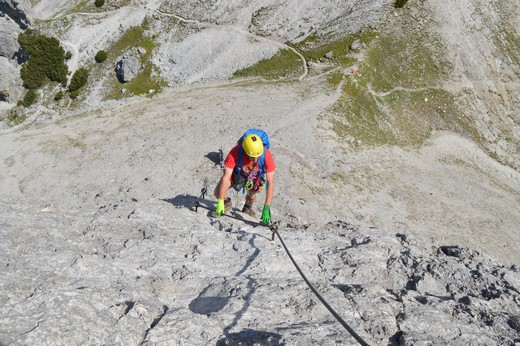WPO hatte da seine Vorteile mit der Körpergröße, Souverän durchklettert er die erste schwere Passage. Via Facebook stellte ein Kamerad in der Heimat fest, das ein Gesicht im Fels Sichtbar sei, tatsächlich waren es deren zwei, die direkt über einem Gedenk Kreuz (Links vom Einstieg)im Fels erkennbar sind. Hammerhart! Von Links einsteigen des Rätsels Lösung, mit einigen Eleganten Kraftvollen Bewegungen ist der Anschluss hergestellt. Der Wasserfall kommt näher, das Gelände legt sich leicht zurück, das Stahlseil läuft durch mehrere Sicherungen, daher Beweglich, nicht unbedingt gehen wenn der Kamerad aufsteigt. Die Tiefe nimmt zu ein Unterhaltsamer Begleiter der Wasserfall, die Jungs sind relativ gut drauf doch ein selbst Läufer ist der Seebener nicht, es gibt ja genügend stellen zum Parken. So richtig interessant ist eine abdrängende Platte, WPO müht sich heftig Oberhalb des Seils, um in dieser längere und ausgesetzten Rechts Querung diese eine Stelle zu meistern, viel einfacher gelingt es unterhalb des Seils zu bleiben, als Akrobatisch um dieses zu Turnen. Warte etwas oberhalb auf Jens, was sehen meine Augen da, der Kamerad kommt von rechts, steigt im Brösligen ungesicherten Gelände auf, Puuh meine Nerven! „ Hurra eine D-Stelle umgangen“ so die Worte, Wahnsinn der Typ. Eine einfachere ansteigende Rechts Querung in Blockgelände, der Wasserfall entfernt sich stetig. Vor einer weiteren Anspruchsvollen Stelle lässt mich WPO vorsteigen. Dann das Finale Highlight, durch eine  Hochhaus Hohe Senkrechte Wand, wohl gut versichert aber absolut knackig, werden die Bizeps richtig gefordert. Rufe WPO zu „ganz schön heftig das Teil“ Diese Ausstiegswand wurde erst vor einigen Jahren wegen Steinschlaggefahr am Ausstieg neu gewählt) daher noch Anspruchsvoller als uns bekannt. Schön die Jungs genau am Ausstieg mit einem abschreckenden Tiefenblick zu beobachten und Fotografieren.