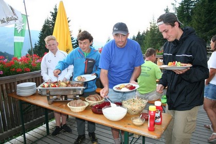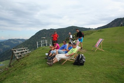 Wieder ein Band erneut eine Felsplatte nicht ganz so steil und wenig ausgesetzt. Verdammt viel Metallbügel sichern die Glatte Platte, Übergang in das letzte Wandteil dies führt zum Grat. Links zum Gipfel Rechts zum Wildloderhaus und Henne Klettersteig. In wenigen Minuten gehört uns der Gipfel, fast drei Jugendliche sind kurz vor uns aus dem Steig entstiegen. Gute Sicht zum Henne mit seinem Nord-Ost Grat Klettersteig.Gute Fernsicht aber kein Großes Panorama inmitten einer Grünen Bergwelt. Jens serviert einen Gipfelschnaps. Schokolade sowie Süßes dreht seine Runde. Eintrag im Gipfelbuch, mit der Feststellung dass dieser Steig gut Frequentiert ist. Ja die Bergbahn Betreiber wissen wie das Sommergeschäft angekurbelt werden muss. Kurz vor 14 Uhr, leichte Kletterei danach ein einfacher Wanderweg der in den Zustieg des Henne 2078 m, mündet. Das Genial gelegene Wildseeloder Haus ist plötzlich Sichtbar, Fantastisch! auf einem Sattel über dem Traumhaft schönen See gelegen. Erinnert sogleich an die wohl bekannte Coburger Hütte oder die Wolayerseehütte. Einzig Störend die Höhendifferenz, wollen wir doch heute noch den Henne Klettersteig mit den wartenden von der Hütte begehen, das ist gleichbedeutend mit einem Aufstieg an diesen Ort und noch höher! Ein gut begangener Weg der sich tief eingegraben hat, führt durch Latschen relativ geradlinig einer Pause entgegen. Ganz schön aufgeheizt dieser Wegabschnitt dazu Windgeschützt. Etliche Personen steigen noch zum Gipfel auf. Aus größerer Entfernung ist festzustellen dass sehr viele Wanderer auf der Terrasse verweilen. Kurz vor erreichen gilt es noch den Ablauf des Sees über eine Brücke zu überqueren, kurzer gegen Anstieg, schon beginnt der Trubel. Unsere zwei Verschollenen Ahlen sich auf der Terrasse, prima am Tisch sind noch Plätze frei. Es dauert einige Zeit bis die noch junge Bedienung sich unser annimmt. Als sie die Getränke auf den Tisch stellt, ein unfreundlicher Kommentar zum ausgepackten Vesper, ist nur AV Mitglieder gestattet! kein Problem Wortlos wird der AV Ausweis vorgelegt. Humprey bestellt einen Kaiserschmarrn, Jens seine fast schon Obligatorische Knödelsuppe. Beim Bad in der Sonne mundet ein Weissbier noch besser, etwas übertrieben erscheint der Auftritt einer Reifen Frau, die sich Ungeniert und Hüllenlos in das doch Kalte Nass 14°C begibt. Abrechnung der Übernachtung vom Vortag, Lager Nichtmitglied 20 €, Mitglied die Hälfte Abendessen 13,90 €, ein Bier für 4 €. Heftig die Strahlen der Sonne ein Absoluter Hauch von Sommer. Zwei Argumente die Pause zum Verlängern, liegen vor, zum einen haben die zwei Netten Begleiter entschieden abzusteigen zum anderen ist es 15 Uhr, in zwei Stunden fährt die letzte Bahn. Eine Zweite Runde Weissbier wird bestellt. Meine Überlegung für die Tour von Morgen ist noch nicht ganz gereift. So wie Sie gekommen waren so gingen Sie wieder, relativ Flott verlasen die Tagesgäste die Hütte, die ja schon seit vielen Tagen alle Nachtlager vergeben hatte.
