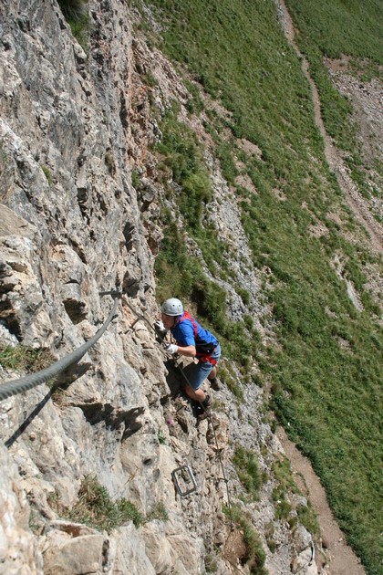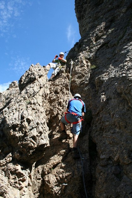 . Ah ja ihre Antwort, der Weg wird schmaler und steiler, kurze Windungen der Pass kommt näher, die Hütte ist leider verdeckt, eine Wegteilung mit Hinweis fast in Hüttennähe. Nach links zweigt der Zustieg zum relativ Neugebauten Klettersteig ab. Jens und ich verweilen hier, warten auf die Neulinge. Nach etlichen Minuten bei insgesamt 50, erscheinen die beiden, Harald ist ganz schön aus der Puste, frage ihn ob es ihm gut geht, habe gehört du hast Probleme wegen des „Zucker“. Das kann vernachlässigt werden! Die neue Brille bereitet ihm Sorgen! Ein gewisses Unwohlsein belastet ihn! Frage ihn ob er Sport betreibt, ne eher weniger, ob er wenigstens mit dem Rad fährt um etwas für sein Körperliches Wohlsein zu tun, das beantwortet er genauso mit Nein, er müsse etwas für sein Ego denn Stolz tun, dies erreicht er im PKW und bequemer Lebensweise wohl nicht. Das begehen dieses Steigs macht so keinen Sinn, teilt er mit, schade Lole entscheidet sich kurz vor dem Einstieg zur Solidarität. Wir treffen uns dann auf der Hütte. Während die drei direkt am Einstieg Gurtzeug anlegen, finden wir eine eigens eingerichtete Stelle für 4 Personen zum anlegen. Nobbe eröffnet die um Jens erweiterte Runde, der Einstieg 1800 m, ist bewusst nur ausreichend gesichert, gleichbedeutend mit der Anforderung der Anlage. Guter rauer und griffiger Fels mit besten Tritten dazu ein straffes Stahlseil. Sehr schnell meistern die vier die ersten Meter. Ein weiterer steiler Felsblock mit Latschen und Erdigen Stellen jetzt in der Sonne sorgt für ein längeres Klettersteig Feeling, Jens fühlt sich ebenso im Element, wie wir, die ja gestern schon einen deutlich schwierigeren begangen haben. Lustig für uns, kniffelig für Nobbe und Humprey beim begehen einer drei Seilbrücke. Nobbe weil Jens am Seil faxen treibt, Humprey erschwert in seiner Überheblichkeit das gehen, weil er es Rückwärts probiert, will dann um 180 ° drehen das misslingt, dadurch kommen wir so richtig auf unsere Kosten. Wir sind nicht allein weiter Oben klettern mehrere Ferratisten. Es wird einfacher über gestuftes geht es zu einer einfachen Querung mit Höhle, ein Grasig Erdiges Band mit Stahlseil Sicherung steigt leicht an, eine Anspruchsvolle Felsplatte erfordert zugreifen, könnte vielleicht etwas knackiger Gewürzt sein, wenn da auf einige Tritte verzichtet worden wäre.