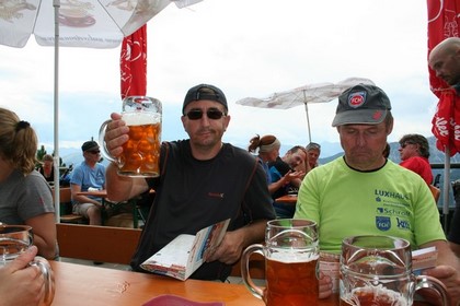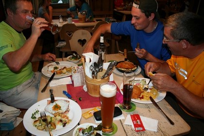 Freitag 2.September: Nachdem sich Nobbe wohl verspätet, rufe ich bei Humprey an, melde ein späteres eintreffen. Kurz vor 7 Uhr, ist er da, sein Sohn sei verspätet von der Arbeit eingetroffen. Erster Gang ist eine Filiale der Sparkasse, am Automat holt er sich das nötige Kleingeld. Humprey begrüßt mit einer Tasse Kaffee in Händen. 13°C kaum Wolken. Das Gepäck der beiden ist in Windeseile verladen, wobei Nobbe alles perfekt verstaut. Flori erhält denn Logen Platz als Beifahrer. Die Verkehrsbedingungen für einen Freitag absolut positiv. Die Temperatur steigt stetig, um 9. 30 sind es schon 21°C. In den Bergen vor Kufstein hängen noch Graue Wolken, dort hat es in der Nacht geregnet. Kurz vor Kufstein wird die Autobahn verlassen. Zwischen Kufstein und Kitzbühel hohes Verkehrsaufkommen im Schneckentempo geht es vorwärts. Wenige Kilometer nach Kitzbühel geht es am Gasthaus Hechenmoos links ab. Kaum geht die Asphaltierte Straße in Schotter über, sitzt der Golf von Nobbe leicht auf. Anscheinend fährt er im 3 Gang, zumindest behauptet er das, ganz schön steil dieser Zubringer für das Bewirtschaftete Tal. 11.15 Uhr, ist der Ausgangspunkt auf 1030 m, für den Tristkogel Klettersteig erreicht. Eine Gruppe von Frauen hat Probleme mit ihrem Van, frägt an ob wir das Auto die letzten 5 Meter Bergauf bis zum Parkplatz schieben könnten, absolut unmöglich ein PKW mit geschätzt 1,5 Tonnen zu schieben. Als ich vier Biere am Wieseneggbach kaltstelle, steht das Fahrzeug auf dem Parkplatz, ein Herr hat sich kurzer Hand an das Steuer gesetzt, war scheinbar Easy. Eine Tafel am Parkplatz erinnert und Informiert an die Zeit als hier Kupfer abgebaut wurde, diese Epoche dauerte bis 1926. Gemütliches packen und Vespern. Nobbe schultert 9 Kg, wir drei liegen um die 6 Kg Gepäck. Der versuch abseits der Straße aufzusteigen misslingt, kein murren oder Kurren, ist ja auch für alle Neuland. Leider gibt es nur die Straße zur Kelchalm 1430 m. Das gehen ist ob der Temperatur ganz angenehm. Teils durch denn immer Grünen Fichtenwald, führt der Weg vorbei an einer modernen Alpe die wie es scheint bewohnt ist, in knapp 30 Minuten zum Ehemaligen Berghaus. Mit seinem Glockenturm eine etwas andere Art einer Berg Hütte. Die Terrasse lädt zum Verweilen ein. Zwei Frauen erfreuen sich an einem Glas Sekt, der Wirt leistet dazu Gesellschaft. 4 Weißbiere werden bestellt, nebenbei wird das mit dem Quartier geklärt, Zimmer 8 im 1 Stock, wir könnten das Zimmer gleich beziehen. Kleiner Snack vom mit gebrachten, Organisatorische Absprache über die Tour. Fam. Schleißheimer einigt sich über die Mitnahme nur eines Rucksacks. Etwas Brot und Wurst, dazu eine Tafel Schokolade den Gurt und Helm, der eh schon kleine Rucksack erfüllt sein Zweck mehr als.