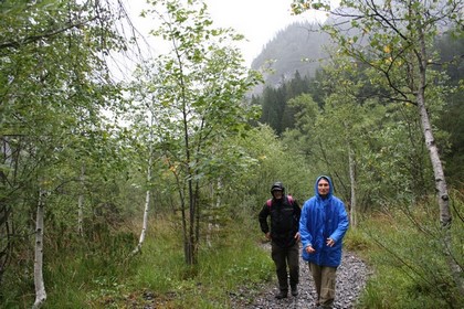 Dienstag 6.September: Sehr früh stehen die ersten auf, nach und nach folgen gleichgesinnte, etwas störend die Unterhaltungen. Humprey der in der Nacht aus Platz Gründen die Fuß Seite mit der Kopf Seite gewechselt hat, gibt um 8.20 Uhr, das Zeichen zum Aufstehen, wobei das Wetter alles andere als ein Beweggrund wäre, es windet und Regnet heftig. Nobbe sitzt schon beim Frühstück, die Tische sind gut belegt, auch die Frühaufsteher kneifen sich mit dem Abmarsch, nicht verwunderlich bei Nasskalten 7°C. Zu allem Unglück sind die Toiletten belegt. Wir setzten uns zu zwei älteren Frauen an denn Stammtisch der einzig noch Freie. Aus der Küche erhalten wir Tassen und Heißes Wasser, dazu gibt es Wecken, Rauchfleisch, Butter + Käse, Nobbe schneidet sein Brot auf. Endlich ist ein Toiletten Gang möglich, einiges an Personal versorgt die Gäste, die Küche und Theke sind wohl erst in jüngster Vergangenheit modernisiert worden, die Hütte selber wird mittels eines Gas BHKW versorgt, wozu 17 Helikopter Einsätze nötig sind. Nach und nach wagen sich Mutige, brechen zu ihren Zielen auf, auch Pollux mit seinen zwei Begleiterinnen ist darunter, wenig später kehrt er zurück, ist der Witterung nicht passend gekleidet, er erzählt beim Anlegen einer Regenfesten Hose, über ihre Tour zum Karwendelhaus danach Öffentlich zurück zum Achensee. Der Schuh und Trockenraum gehört uns allein, das Personal ist um 10 Uhr bei der Tag täglichen Reinigung. Abschluss Foto im Eingang der Hütte, Wolken ziehen sehr tief durch, bei Mäßigen Regen. Flori und Nobbe wollen es wissen ziehen das Tempo merklich an, im Bereich der Serpentinen fallen verstärkt tropfen, wo auch sich am Berg eine Rinne gebildet hat fliest oder stürzt Wasser nach unten, auch der Weg ein einziger Wasserlauf daher ist der Untergrund etwas schlüpfrig besonders bemooste Steine oder Wurzeln. Spaß sieht wohl etwas anders aus, aber auch solch ein Wetter gehört dazu! Der Kopf ist ob der Situation etwas mehr nach vorne gebeugt, dadurch läuft nicht ganz so viel Wasser von der Kapuze in das Gesicht, hat einen weiteren Vorteil, die Konzentration auf den nächsten Schritt bzw. Tritt ist erhöht.