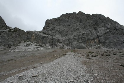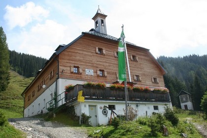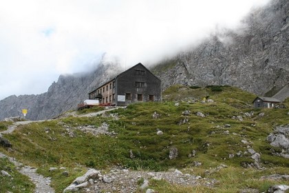 Zweites Frühstück um 10.45 Uhr. Heiße Schoko die Kameraden Kaffee, dazu ein Süßes Stückchen. Das liebe Wetter bereitet etwas Sorge. Wir beschließen gleich im Anschluss über Pertisau am Gegenüberliegenden Seeufer, durch das Mautpflichtige Falzthurntal zur Gramai Alm Anzureisen. Einkauf durch die verlockende Theken und Regale von Schokolade, Wecken, Multivitamin und Magnesium Tabletten. Kaum Verkehr auf der Straße, kurz nach Pertisau am Anfang der Karwendeltäler, ist die Mautstelle, die Gebühr für einen PKW 4,50 €. Eine Gutausgebaute Straße führt immer tiefer in das breite Bewirtschaftete Tal. Die Fahrt endet am Parkplatz vor der Gramai Alm auf 1265 m. Wohl erstaunt über drei Reisebusse fährt ein vierter Bus vor. Die älteren Herrschaften streben schnurstracks auf die Gramai Alm oder besser gesagt das Hotel zu, wahrscheinlich lockt ein Mittadsmenü um kurz vor 13 Uhr. Etwas Unruhe beim Packen, möchte doch Humprey unbedingt seine Meinung über die Mitnahme nur eines Rucksack und eines Klettergurts für ihn und Flori durchsetzen, echt Sonderbar ist auch eine Übernachtung auf der Hütte eingeplant. Dies führte soweit das Petrus tiefe Tränen ab dem Abmarsch um 12.50 Uhr, fließen lies. Interessant welch Angebot rund um die Gramai Alm, Streichelzoo Verkauf von Milchprodukten sowie kleine Hütten die vermietet werden. Wenige Schritte später beginnt der Aufstieg durch das immer enger werdende Tal. 2 Std. zur Lamsenjochhhütte die noch nicht sichtbar ist, so steht es geschrieben! Das Tal ist sehr langezogen und so gut wie ohne Baumbestand. Ändert sich ein wenig als eben der Aufstieg am Ende des Tales beginnt. Der Niederschlag verstärkt sich, jetzt wäre ein Schirm das richtige, doch voller Optimismus ob des Wetters blieb er zuhause. Drei Personen im Aufstieg sind erkennbar. Es wird steiler, in Serpentinen wird Höhe gewonnen. Die drei Personen legen eine Rast ein, mit einem Hallo wird gegrüßt. Der FCH Unterwegs ist die Antwort. Wie man es nimmt! Recht flott ist der Schritt kein Wunder bei diesen kühlen Bedingungen. Noch vor 14 Uhr ein erster Lichtblick, die erste Wolkenlücke über dem Tal. Zwei weitere steigen noch weit unten auf, doch mehr Publikum als gedacht, liegt wohl daran das hier der E4 verläuft. 4 Gämsen grasen mittelbar lassen sich von uns und einem kurzen Regenschauer nicht stören. Weitere drei Personen werden eingeholt, diese waren mit uns am Vortag auf der Erfurter Hütte. Dann wird sie zum ersten Mal Sichtbar, verwitterte Schindel weisen auf eine Ältere Hütte Baujahr 1909.