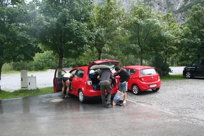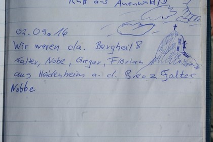 Langsam aber stetig bessert sich die Sicht in Richtung Norden, wie aus dem nichts ein erstes blaues Loch am Himmelszelt. Absteigende werden überrundet, größere Pfützen behindern im Bereich der Latschen und kleineren Bäumen, Sportlich elegant wie im 3 Sprung Wettbewerb ist auch dies Hindernis in diesem Parcours Abstieg kein Problem. Nobbe wollte doch auf der Gramai Alm Käse einkaufen, rein in den Verkauf, Unglaublich die Aufmachung alles im Nostalgie Still längst vergangener Zeiten gehalten, die Einrichtung als solches mit unglaublich Fantasie gestalten, was hier so zum Verkauf angeboten wird sprengt die Erwartung, kann mir gut vorstellen das ein Großteil der Kunden die ja Bus weise angekarrt werden, hier schwach werden. Anfrage bei einem Angestellten ob vor kurzem zwei Wanderer hier eingekauft haben? er bestätigt! vor wenigen Minuten waren zwei hier! Der Regen lässt nach, es sind nur noch wenige Meter die zwei stehen schon am Auto, dort angekommen hört es auf zu tröpfeln. Auf die Frage wegen des Einkaufs antwortet er ja, für 50 €. Erstmal raus aus den durchnässten Klamotten, nur noch in der Unterhose begleitet, zum Glück schaut gerade niemand zu. Nobbe räumt das Fahrzeug ein, Respekt Flori hat seine gekaufte Ansichtskarte der Hütte trocken angebracht. Der Rucksack hängt für ein paar Minuten zum Abtropfen an einem Schild, das Nasse Textil wird einfach nur verstaut, die Temperatur liegt im Tal bei 12 °C, in unter 1 Std. erfolgte der Abstieg. Am Achensee blinzelt die Sonne durch, wobei die Erfurter Hütte von Wolken verhüllt ist. Mit jedem gefahrenen Kilometer wird es heller und Wärmer, schon in München um 13 Uhr sind es 22 °C. Ein kleiner fehler unterläuft Nobbe als es an der Ausfahrt Günzburg staut, dachte er es sei ein Rückstau doch es waren besser Informierte, die dem kommenden Stau ausweichen, auf Höhe Leipheim kam es zu einem Unfall mit LKW Beteiligung nichts ging mehr, dies kostete 1,5 Std. Nach 750 Km Fahrt und Spritkosten von 50 €, ein jeder steckt im 20 € zu. Endet um 17 Uhr, die Reise mit im Gepäck unzählige Erinnerungen. Das Wetter war uns summa summarum absolut holt. Im nächsten Jahr werden wir die Schwierigkeits Stufe wohl ein wenig erhöhen.