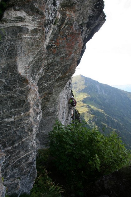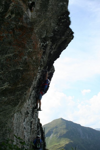 Direkt an der Hütte ein Hinweisschild zu den Naheliegenden Zielen in der Umgebung. Oberkaser Alm genau dahin führt uns der Weg. Über Saftige Almwiesen und durch Baumbestand Quert der Weg. Die Schotterstraße führt direkt zu der Oberkaser Alm 1800 m. Ein kleiner Pfad geht Rechts ab, Während Nobbe über die Fahrstraße aufsteigt, sind wir vor ihm an der Rückseite der Alm. Er scheint nach uns Ausschau zu halten. Ein kurzer Zuruf das Rätsel gelöst. Wie es scheint ist die Alm ohne Bewirtung. Am Brunnen befindet sich eine Tafel mit dem Topo des Steigs. Da ja der Berg nur noch ein Katzensprung entfernt. ist lässt sich das ganze wohl nur erahnen. Wie lautet es im Führer, wer hätte das geglaubt das in diesem Gebiet der Kitzbühler Alpen überhaupt ein solcher Klettersteig existiert. Begrünte Hänge soweit das Auge reicht. Wir suchen vergebens einen Zustieg, Ein Markanter Stein da könnte etwas Helles angebracht sein. Wählen einen Geradlinigen Aufstieg über die Almweiden, die Kühe hatten hier durch ihr einsinken tiefe Spuren hinterlassen, strengt ehrlich an, teilweise geht es nur im Zick Zack aufwärts, auch beim Annähern an die Felswand deutet nichts auf einen Zustieg hin. Bis eben ein auffälliger Stein. 14.30 Uhr, Humprey unterstützt Flori beim Anlegen des Gurtzeugs, hatte er doch eine Zweijährige Pause durchstehen müssen. Nobbe steigt als erster in die Schattige Wand, eine erste Leiter danach eine kleine Herausforderung, senkrecht nach oben um eine Ecke, ein dickes Stahlseil und Trittstifte nehmen die Schwierigkeit, man möchte Behaupten ob der Ruhe an einem Abgeschiedenen Ort zu sein, wenige Kommandos sind zu hören, ein jeder findet hier ein Betätigungsfeld, mein Aufgabe die Kamera, das ganze aus nächster Nähe oder mit etwas Distanz zu erleben, jedenfalls steige ich binnen kürzester Zeit zu den dreien auf. Schaut von unten ganz gut aus, Flori‘s Beine spielen die sogenannte Nähmaschine ein ungewolltes Zittern der Beine, überspielt aber locker die Szene, na wenn das Mal kein gutes Zeichen ist. Grasige Bänder führen immer wieder zu Leitern, um den doch Steilen und schwierigen Passagen etwas die Luft zu nehmen. Aber es gibt sie auch die Anspruchsvollen Wände nur ohne Leitern, sind aber gut Versichert. Auf einem breiten Band wachsen Johannisbeeren Büsche, die Früchte sind Reif für die Ernte, echt Wohlschmeckend. Der Steig quert im Laufe der unzähligen Bänder Westlich, auch die Sicht wird besser, als letzter im Bunde bleibt ja genügend Zeit für das Landschaftserlebnis.