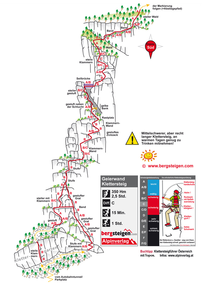 Der Klettersteig Geierwand am Südfuß der Mieminger Kette ist sehr gut durchgesichert und an allen steileren Passagen gibt es Trittbügel, so dass der Klettersteig auch gut Familien und Anfänger geeignet ist, zumal man nach der ersten steilen Klammernwand auch links herum wieder aussteigen kann. Insgesamt klettert man sehr schön homogen die Wand empor. Highlights sind sicherlich im oberen Teil die Aussichtsbank sowie die kurz danach folgende Seilbrücke und die Inntalblick. Kurz darauf kommt mit einer leicht bauchigen Passage (Entschärft durch unmengen von Klammern) die Schlüsselstelle (C). Danach ist es schon fast geschafft. Durch ein kleines Waldstück geht es zum finalen Gamsband das rechts diagonal in den Wald und somit zum Ausstieg führt.