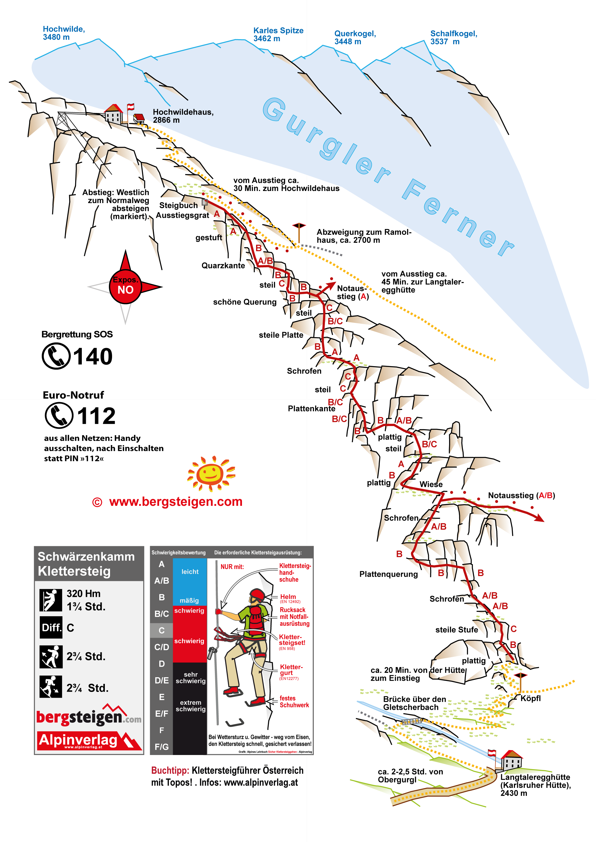 Obergurgl, Bezirk Imst, Tirol, 6456, Austria http://www.klettersteig.com/KS_Schwaerzenkamm/ Von Obergurgl (parken direkt am Ortseingang rechts) aus erreicht man die Langtalereckhütte (2480m) in ca. 2,5 Stunden. Von dort aus dem Weg 35 Richtung Hochwilde Haus (nicht mehr bewirtschaftet) folgen und so in 30 Minuten zum Einstieg vom Klettersteig Schwärzenkamm