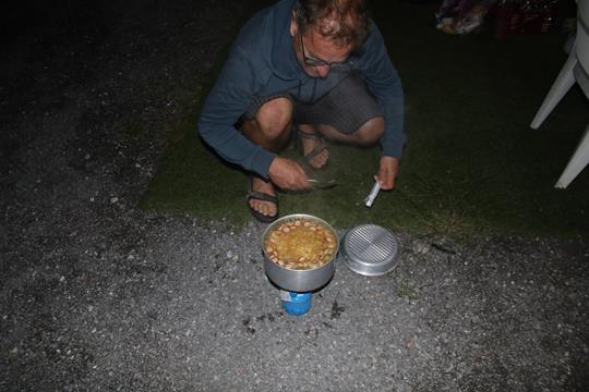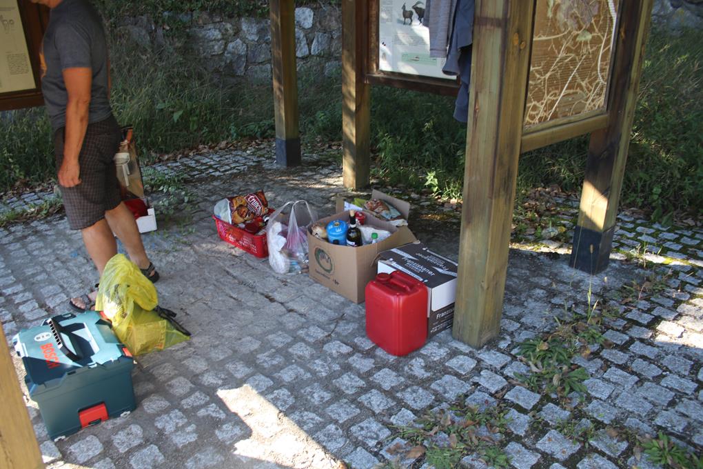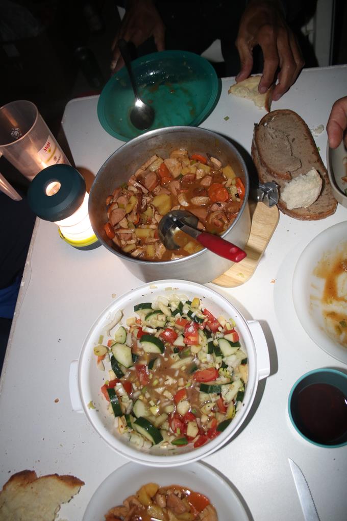 Wie es scheint ist hier, am Westlichen Ende zum Hang, ein Mülltrenn Platz mit Unterschiedlichen Container für die Bürger eingerichtet. Ein aus Holz gebauter Abstell Platz ist wohl für die Mülleimer erbaut worden. Leider gibt es um die Talstation der Bergbahn kein Wasser, kein Problem für die Versorgung reicht der Vorrat. Stark verstaubt der Boden, mit dem Handfeger aus dem Auto Kehre ich die doch große Fläche ab, es Staubt dabei heftig. Verhalten uns etwas Defensiv, möchten nicht Erkannt werden. Richtig Häuslich richten wir uns die offene Räumlichkeit ein. Der Tisch die Stühle und Lebensmittel stehen nahe des Eingangs. Das Auto verdeckt weit Gehens diesen Bereich. Bis auf gut 1 Meter ist die Holzwand geschlossen, der Bereich bis zum Dach ist es eine offene Latten Konstruktion. Da wir uns unterhalb am und um den Tisch aufhalten sind wir den Blicken verborgen. Auch nach Einbruch der Dunkelheit fahren immer wieder Fahrzeuge vor, meist wegen kleinerer Mengen Haushalts Müll, das kann ja schon gar nicht Wirtschaftlich sein. Es wird Merklich kühler, vorbei mit T-Shirt und kurzer Hose. interessant der Einkauf, lecker die Weintrauben. Lauch, Tomaten, Gelbe Rüben, Kartoffeln dazu Gulasch, der Gedanke war es ein Wurst Gulasch zu kochen. Zum Trinken Wein und Bier Tuborg 0.5 L aus der Dose insgesamt 26 € für das Essen inkl. Getränke. Wasser und Limonade war noch vorrätig. 19 Uhr, das schneiden der Lebensmittel startet bei nur noch 9°C, es wird merklich ruhiger auf der Straße. Die Rote Kartusche von Bodo passt tatsächlich in den einfachen Gas Kocher. Schade Essig und Öl sind leider verbraucht, Olaf pruzzelt mit Margarine das Fleisch und die geschnittene Wurst an. Humprey und Bodo schneiden Fleißig die Zutaten, die Notizen schreiten voran, ein angenehmer Duft streicht durch die Luft.