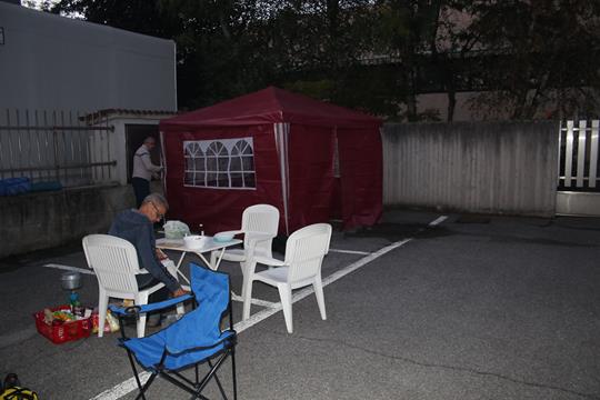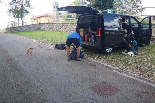 Freitag 16.September: Im Schlafsack war es in der ruhigen und Lauen Nacht eher zu Warm. Als es Hell wird ist der Schlaf zu Ende ein Dösen gelingt. Humprey ist nicht mehr am Platz sein Schlafsack liegt eingepackt in der Hülle. Fahrzeuge verkehren unüberhörbar an der nahen Hauptstraße die Südlich nach Como/Mailand führt. Ein PKW fährt vor ein Älterer Mann mit Hund entsteigt. Eine Zwielichte Gestalt, Humprey kehrt von einem Spaziergang zurück, es wird Zeit sich aufzuraffen Kastanien liegen auf dem Asphalt. Wolken am Himmel ziehen bei leichtem Wind durch, sorgen für Postkarten Wetter. Als Olaf kurz nach 7.30 Uhr, sich bewegt, später wird alles zum Frühstück vorbereitet, Tische und Stühle Aufstellen. Während Olaf Wasser abkocht, Richten wir den Frühstückstisch. Olaf kommt Erfolgreich mit Frischen Wecken zurück, anscheinend war nebenan ein kleiner Supermarkt, jetzt ist das Rätsel gelöst, die Backstube! Bei 18,5 °C, lässt es sich cool Frühstücken. 1 PKW fährt vor die Teststation, ein Ehepaar mit Filtertüte inmitten des Gesichts steigt aus, Wahrscheinlich wird die Teststation demnächst geöffnet. Während die drei Kaffee Trinken tuts eine Kalte Milch auch.