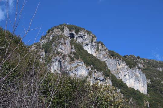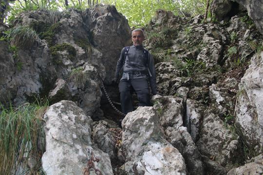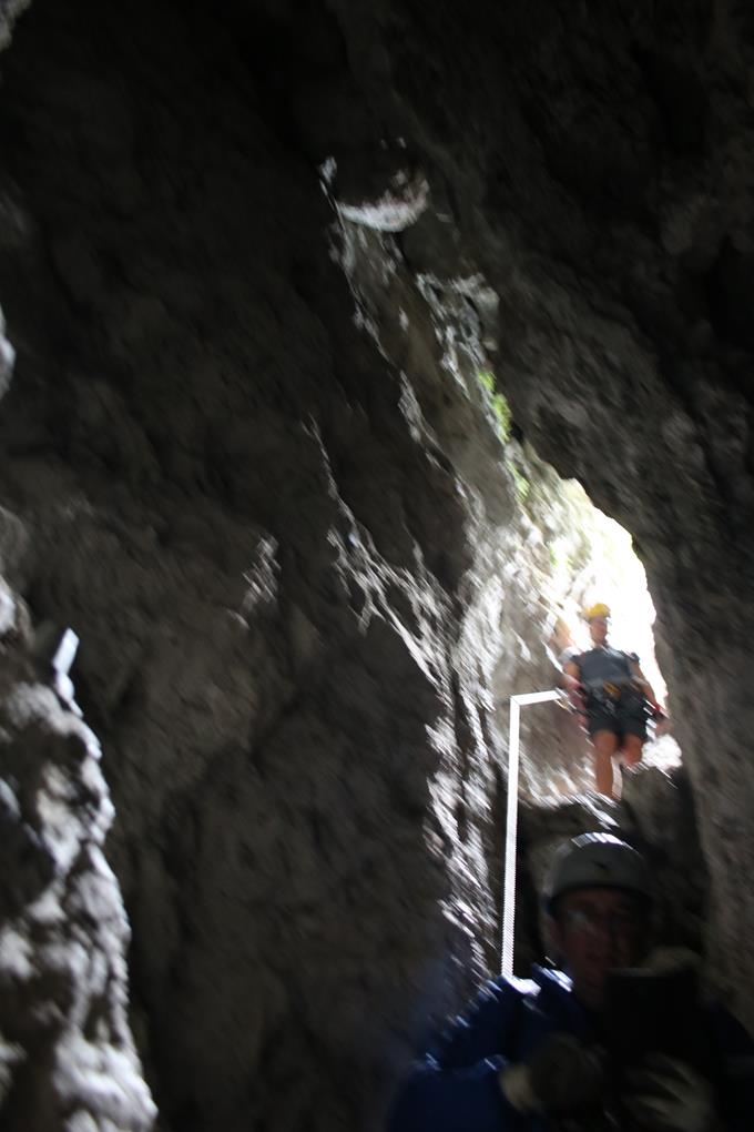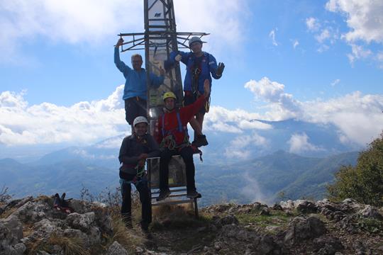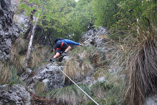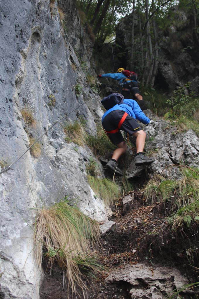 Die Bedingungen sind wie geschaffen für eine Turnerei auf der Südseite. Ein Hinweis Tafel am Fels, der Klettersteig wurde 1989 Eingeweiht Erstellt von der CAI Sektion Bergamo. Leicht verschwitzt kann jetzt beim anlegen des Gurtes erstmal der Körper entspannen. Die Sicherungen sind wohl aus Edelstahl, da fehlen einem die Worte, das ist Natürlich das Non plus Ultra auch an Sicherheit. 15 Minuten nach Ankunft hält Bodo das Stahlsein in Händen. Das Seil leitet nach Osten, Bäume und auch Gras finden hier am Felsen ihren Lebensraum. Der Einstieg ist leicht, eine leicht Ansteigende Querung. Schade die Bäume verdecken teils die Sicht sehr zum Leidweisen für das Fotografieren. Bodo entschwindet den Blicken für längere Zeit. Folge Humprey der als Motiv dient. Der Aufstieg verläuft oft auch auf steilen Bändern, selten wird wegen der Bäume die Tiefe so richtig wahrgenommen. Das Megga straffe Edelstahlseil glänzt in der Sonne. Der Graue griffige und Raue Fels Optimal. Einer Wandstufe zieht es Aufwärts Oft Erdige Passagen ohne auch nur einmal in eine Wand zu kommen, eine Art Kamin sehr Fotogen. Kurz vor der Höhle in einfachen Gehgelände sind wir an Bodo dran. Eisenklammern als Aufstiegs Hilfe, absolut Fotogen leitet das Stahlseil im Dunklen nach Oben. Eine Gedenktafel etwas weiter oben eine kleine Madonna ca. 20 cm hoch, die ich erst sehe als Olaf mich darauf hinweist. Nach einem Absatz geht es etwas nach Hinten von Oben dringt Licht in das Dunkel. Ein verklemmter Steinblock als Absatz. Selbst Humprey greift zum Handy um dieses Highlight in Bilder festzuhalten. Trittbügel helfen über die fast Senkrechte. Zwei Ketten sichern den Ausgang in die Wand. Bodo ist denn Blicken wieder entschwunden, ein Stück nach oben, der steile Kamin wohl mit Trittbügel versehen doch wenn man den Körper etwas dreht finden sich auf der linken Seite natürliche Tritte, es staut sich ein wenig, warte an solchen Stellen meist für ein Foto wenn die Jungs durch sind geht’s in einem Aufschwung nach Oben, Prinzipiell stehe ich die meiste Zeit beobachte das geschehen. es lässt sich so mancher Tritt, der ein oder andere Trittbügel könnte eingespart werden um die Schwierigkeit etwas zu steigern. Für Anfänger ein Super Klettersteig der kein einziges Mal in der Wand verläuft, dennoch geht es Tief nach Unten. Eine Wolke ist wohl abgestürzt zieht Gespenstisch nach Oben ab. Ein Jüngers Paar sitzt am Boden, dahinter geht es in die Nordseite, wohl der Westliche Grat Ausläufer. Olaf zieht den folgenden steilen Aufschwung Kraftvoll nach Oben, wohl die Schlüsselstelle. Setze mich zu den beiden um die Szene von der Seite festzuhalten, Humprey scheitert kehrt um. Ok dann zeige ich die Ideale Technik. Die Hände ans Seil Beine spreizen Hintern weck vom Felsen, die Fußsohlen an den Fels Schritt für Schritt wie beim gehen nur Halt Senkrecht, es sind 3 Meter bis wieder Natürliche Griffe und Tritte vorhanden. Das Gipfel Kreuz ist schon zu sehen glänzt in der Sonne. Die Sicherungen enden nach 350 gesicherten Meter, kurzes Gehgelände bis zum Gipfel. Olaf und Bodo warten schon bei stetigem Wind der wohl auch die Wolken wie ein Spielzeug bewegt. Ohne diesen wäre es wohl angenehm warm, die Sicht beeinträchtigt. Auch das Gitter Gipfel Kreuz ist aus Edelstahl. Die Front die nach Süden zeigt ist aus Edelstahl Blech die sich Enorm Spiegelt. Der Stein ist warm wie geschaffen zum wohlverdienten Pause nach 55 Minuten Klettersteig Fun, die Gehzeit für die 350 Meter genau wie die Angabe. Humprey kommt ins Blickfeld der zweite Versuch war Erfolgreich, da hat er schon schwerer Passagen gemeistert.