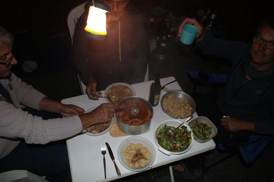 Diese Unabhängigkeit sorgt für Zeitlosigkeit ja das ist wohl das besondere an den Herbsttouren geworden, sicherlich liegt es an der Flucht in Regionen die vom Wetter begünstig sind. Bier und Wein stehen auf den Balken, kühlen durch den leichten Wind stetig ab. Mittels Künstlicher Beleuchtung leuchtet die Licht Quelle den Tisch aus. Bodo zaubert aus Gemüse Brühe, Maggi, Senf und Kräuter eine schmackhafte Salat Soße. Nur wenige Lampen auf dem großen Areal eine direkt neben unserer Herberge, leuchten den Parkplatz aus. Aus nur wenige Gebäude dringt Licht in das Dunkel, deuten darauf hin das es sich um einen schön gelegenen Wintersport bzw. Ferien Ort im Sommer handelt. Zwar nicht Idyllisch doch bei Bier und Wein lässt es sich gut sein, wenn da nicht die sinkende Temperatur dem Körper zu schaffen macht als Sitzkissen dient die Fleece Jacke der Plastik Stuhl leitet die Kälte mehr als einem lieb sein kann. 19.50 Uhr, Olaf Tischt vorsichtig das Wurst Gulasch im heißen Alu Topf auf, dazu gibt es Weißbrot und gemischten Salat. Kurz vor 20 Uhr, beginnt der Melodische Glockenschlag der Dorfkirche, es ist Musik für den Gehörgang und die Sinne. Punkt 20 Uhr dann der Eigentlich Glockenschlag. Reichlich und gut das Mahl zu später Stunde. Der zweite Wein ein (Frizzantino) mundet Bodo und Humprey, aber auch so ist die Atmosphäre recht locker. Nebenbei werden die Iso Matten aufgeblasen, richtig Alt werden wir bei dieser Temperatur nicht werden, was fehlt wäre eine Wärmende Feuerstelle. Umso angenehmer ist es im Schlafsack.